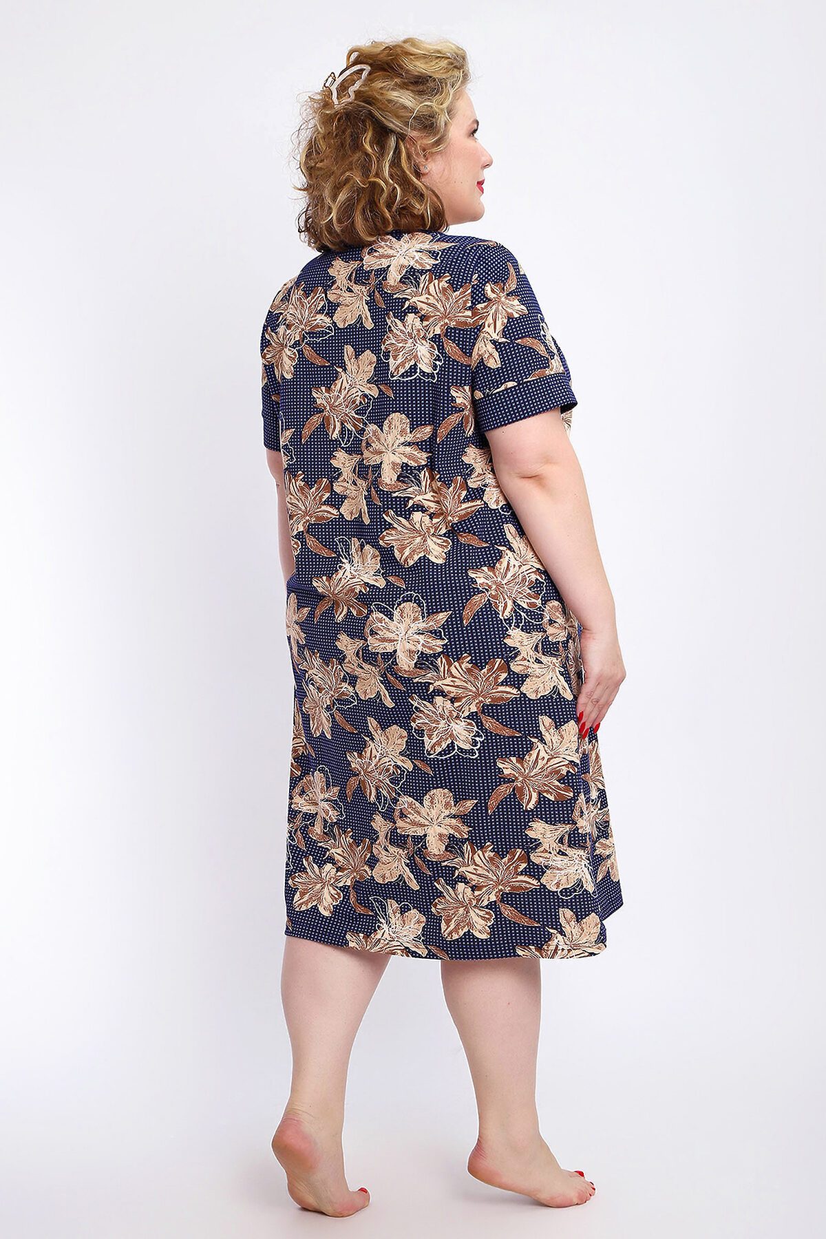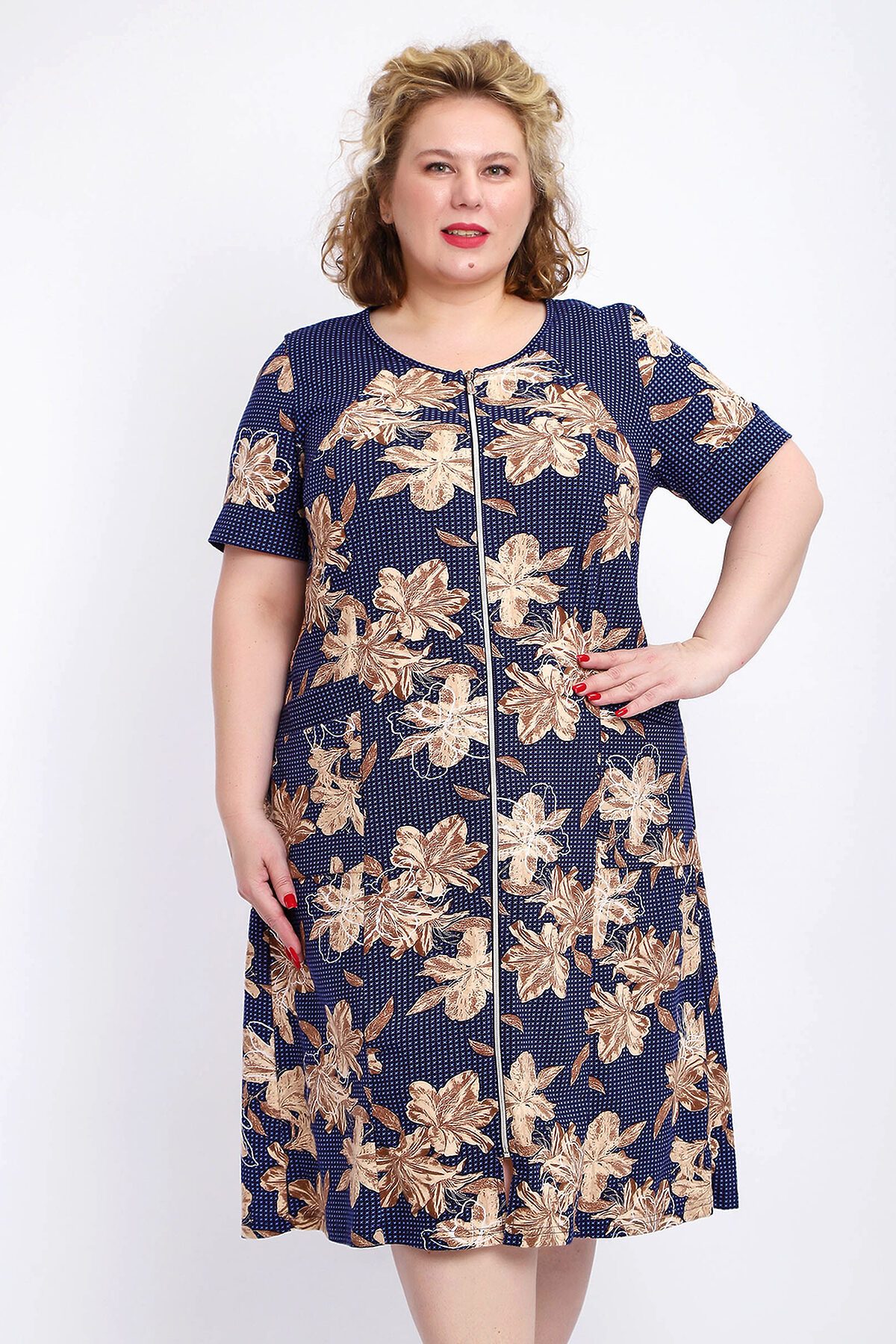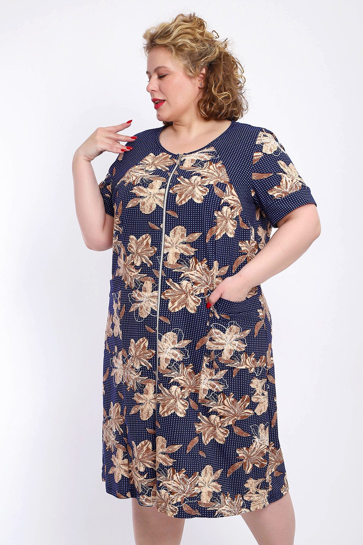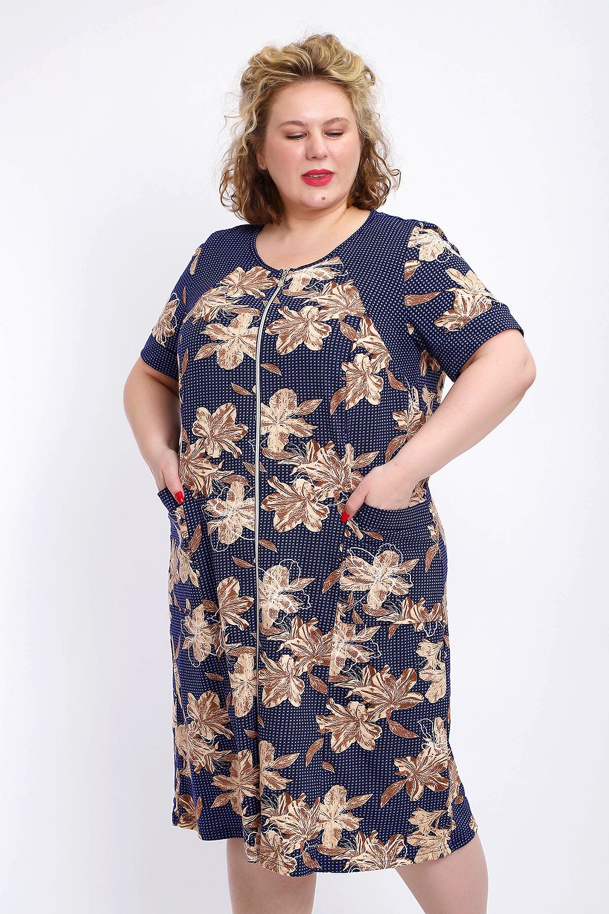 Ощутите домашний уют и комфорт - выбирайте халат женский домашний больших размеров из мягкой хлопковой ткани с очаровательным принтом. Халат на молнии является самой популярной моделью, обеспечивает удобство во время носки, не сковывает движений. Прямой свободный крой платья позволяет скрыть недостатки фигуры и ощущать легкость во время домашнего отдыха. Халат домашний дополнен накладными карманами и стильной круглой горловиной, которая оформлена декоративными планками. Длина платья универсальная, за колено. В наличии есть большие размеры, поэтому выбирайте такой халат в роддом. Изделие выглядит стильно и привлекательно за счет нежных светлых бутонов цветов на контрастном темном фоне. Женская домашняя одежда российского производства имеет идеальную посадку, не линяет, не дает усадку после стирки и долго сохраняет первоначальный внешний вид. Этот женский универсальный халат изготовлен из 100% хлопка, поэтому его можно хорошо использовать как банный халат. Для вашего удобства у халатика есть два боковых кармана, которые хорошо подходят для телефона или всяких мелочей. Размерная сетка включает в себя большие размеры ( до 74 размера). Халат трикотажный выполнен из 100% хлопка. Ткань не вызывает аллергии, не электризуется, хорошо держит форму, не деформируется при стирке. Мягкое трикотажное полотно отлично пропускает воздух, позволяет коже дышать, что актуально в самые жаркие летние дни. Благодаря универсальному крою халат в нежной расцветке подходит для покупательниц любого возраста и любого типа женской фигуры, скрывает недостатки и подчеркивает достоинства. Свободный силуэт позволяют носить его как домашнее платье, даря удобство и комфорт в течение всего дня. Домашний халат с рукавами отлично подойдет в подарок маме, бабушке или сестре на новый год, 8 марта или просто так порадовать.