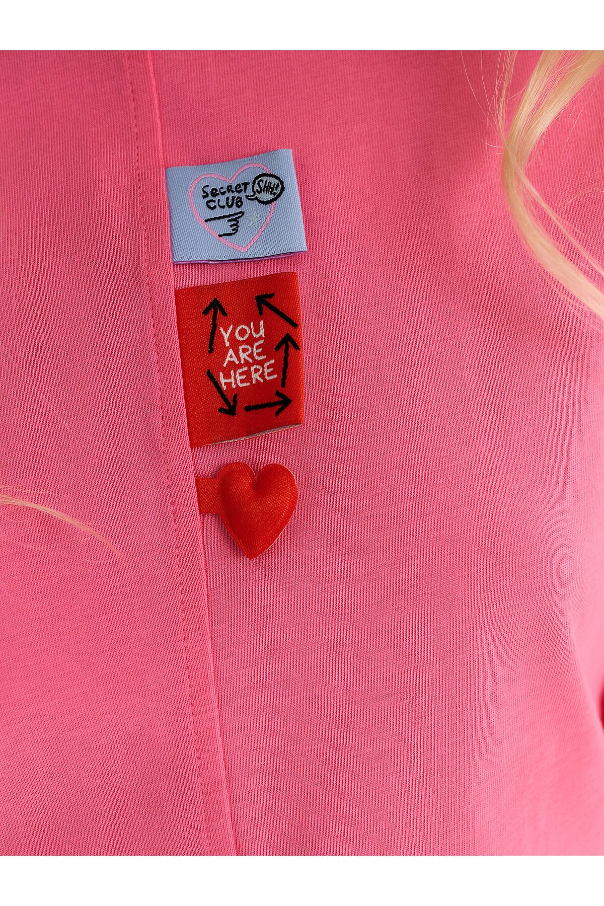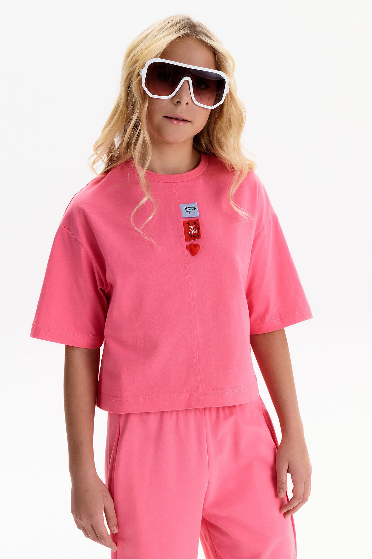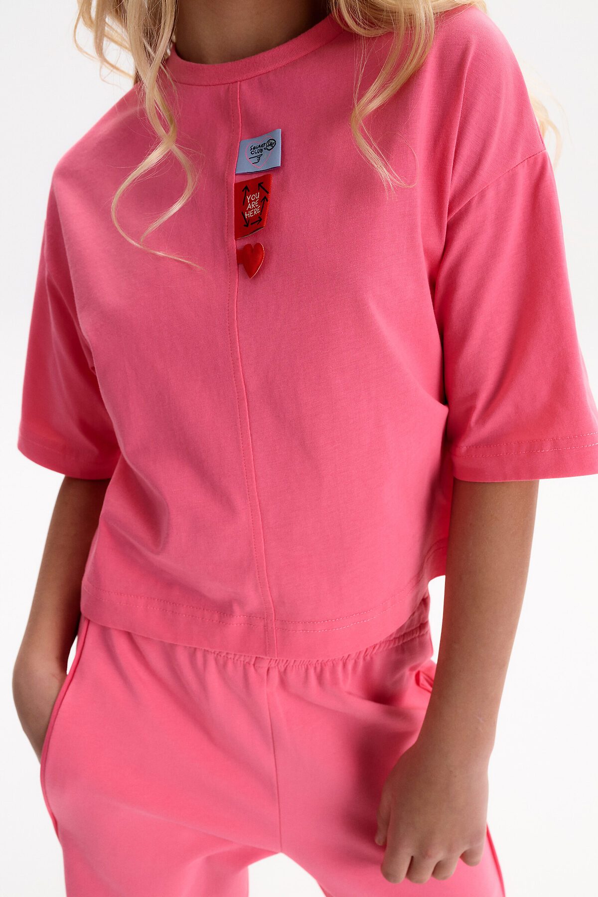 Новинка! Укороченная футболка для девочки умеренного объема. Спущенное плечо, декоративные отстрочки по низу изделия и рукавов. Эластичная рибана на вырезе горловины гарантирует, что футболка будет легко надеваться и сниматься, не теряя при этом своей формы. По переду в центральный шов вставлены декоративные лейблы. Перевод: секретный клуб тс-с-с-с: ты находишься здесь.