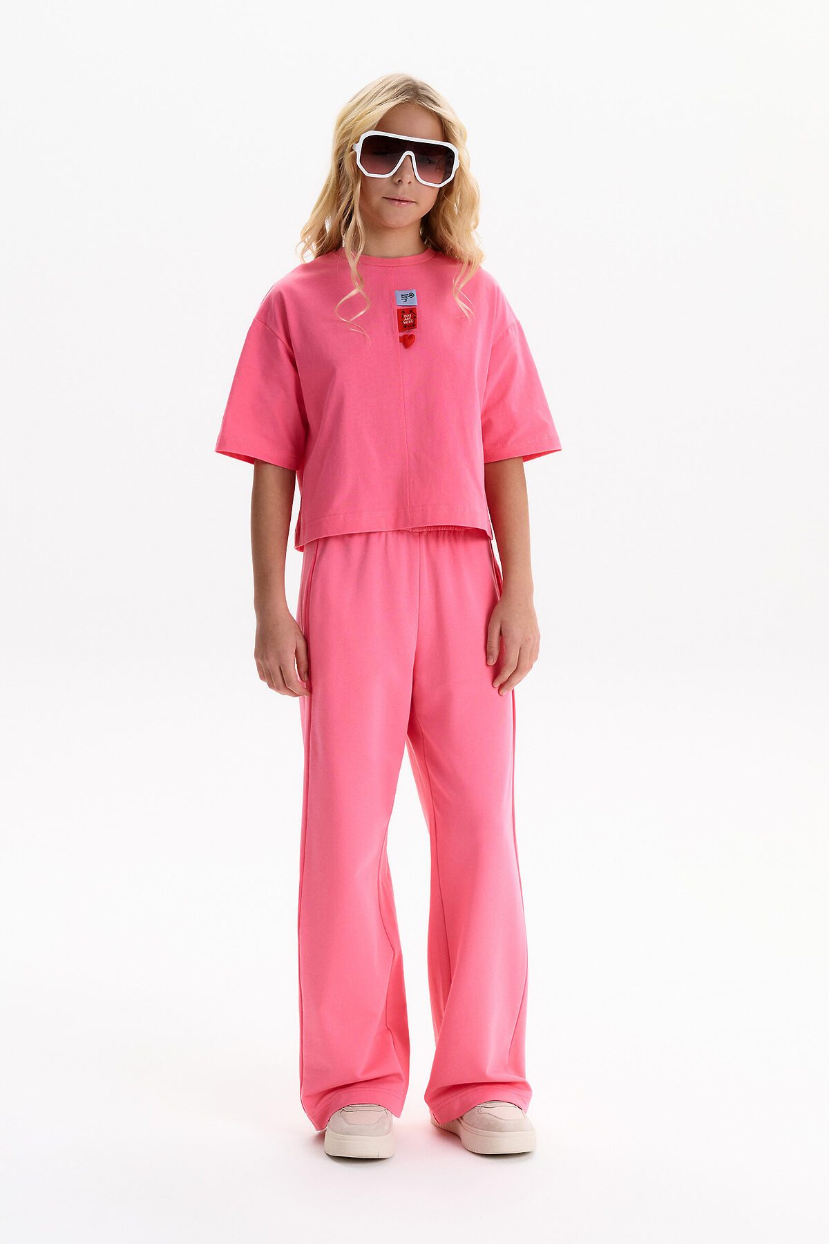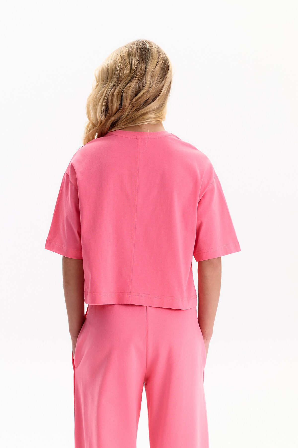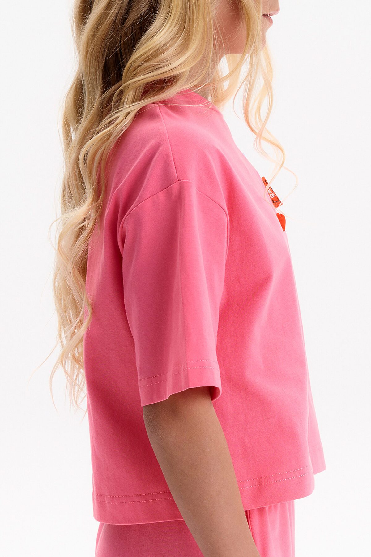 Новинка! Укороченная футболка для девочки умеренного объема. Спущенное плечо, декоративные отстрочки по низу изделия и рукавов. Эластичная рибана на вырезе горловины гарантирует, что футболка будет легко надеваться и сниматься, не теряя при этом своей формы. По переду в центральный шов вставлены декоративные лейблы. Перевод: секретный клуб тс-с-с-с: ты находишься здесь.