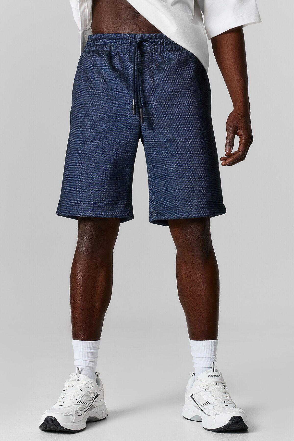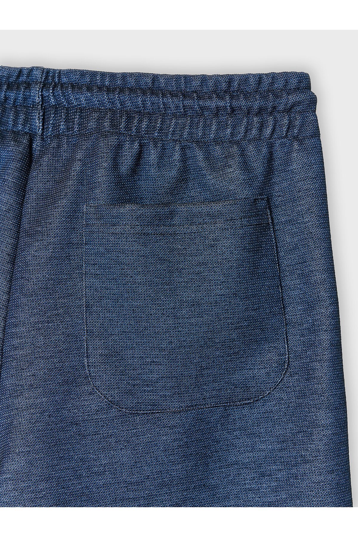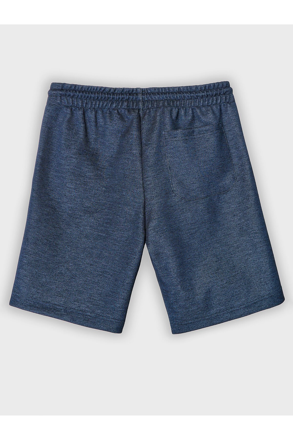 Шорты изготовлены из трикотажного полотна интерлок. Шорты прямого силуэта. Пояс цельнокроеный с эластичной тесьмой внутри. С внешней стороны пояса пробиты петли и втянут шнур с узлом на концах и с термоусадочной трубкой . В боковых швах обработаны карманы, подкладка кармана из основного полотна. На левой передней половинке проложена декоративная строчка - имитация гульфика. Низ шорт с отворотами.