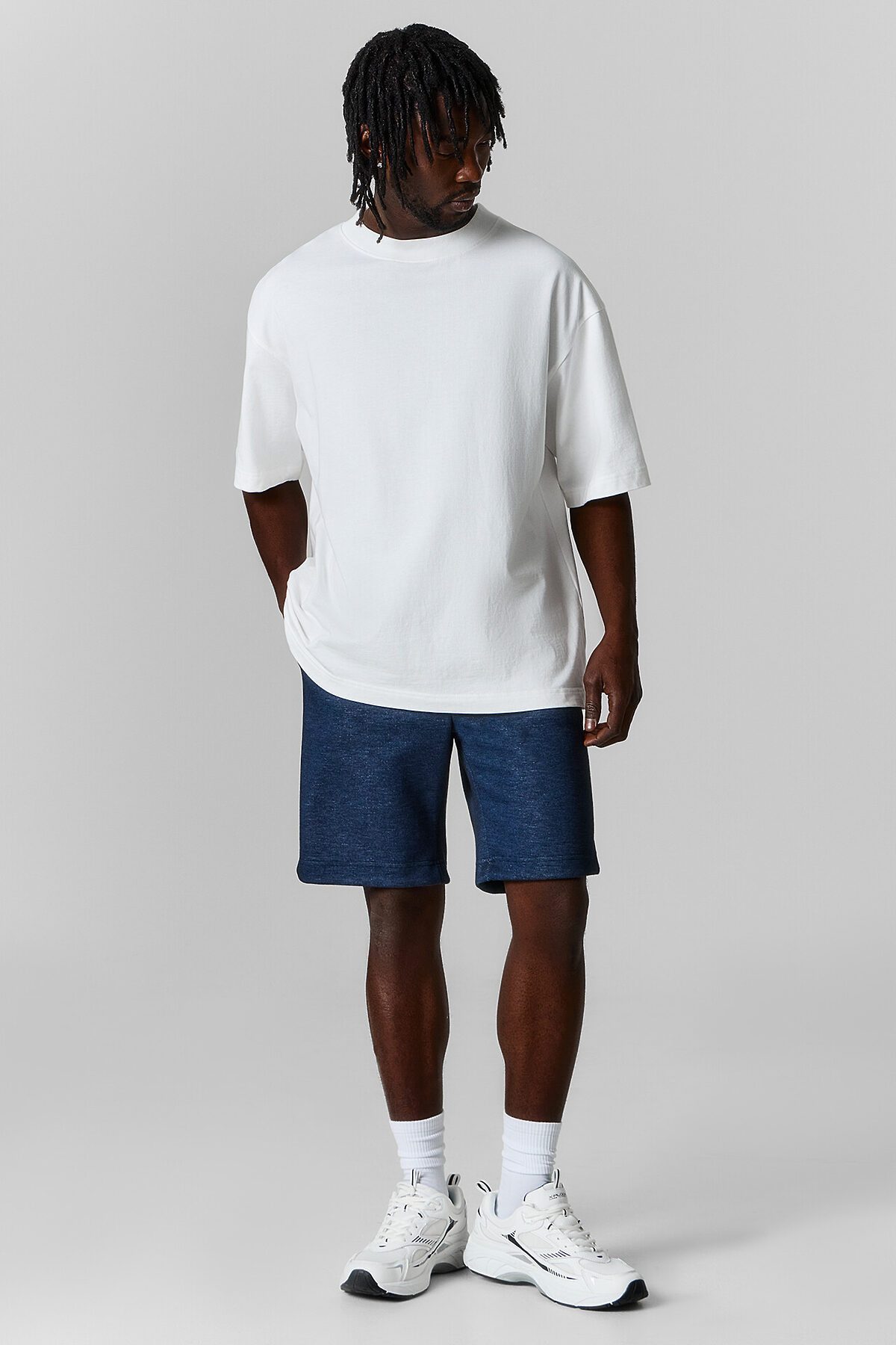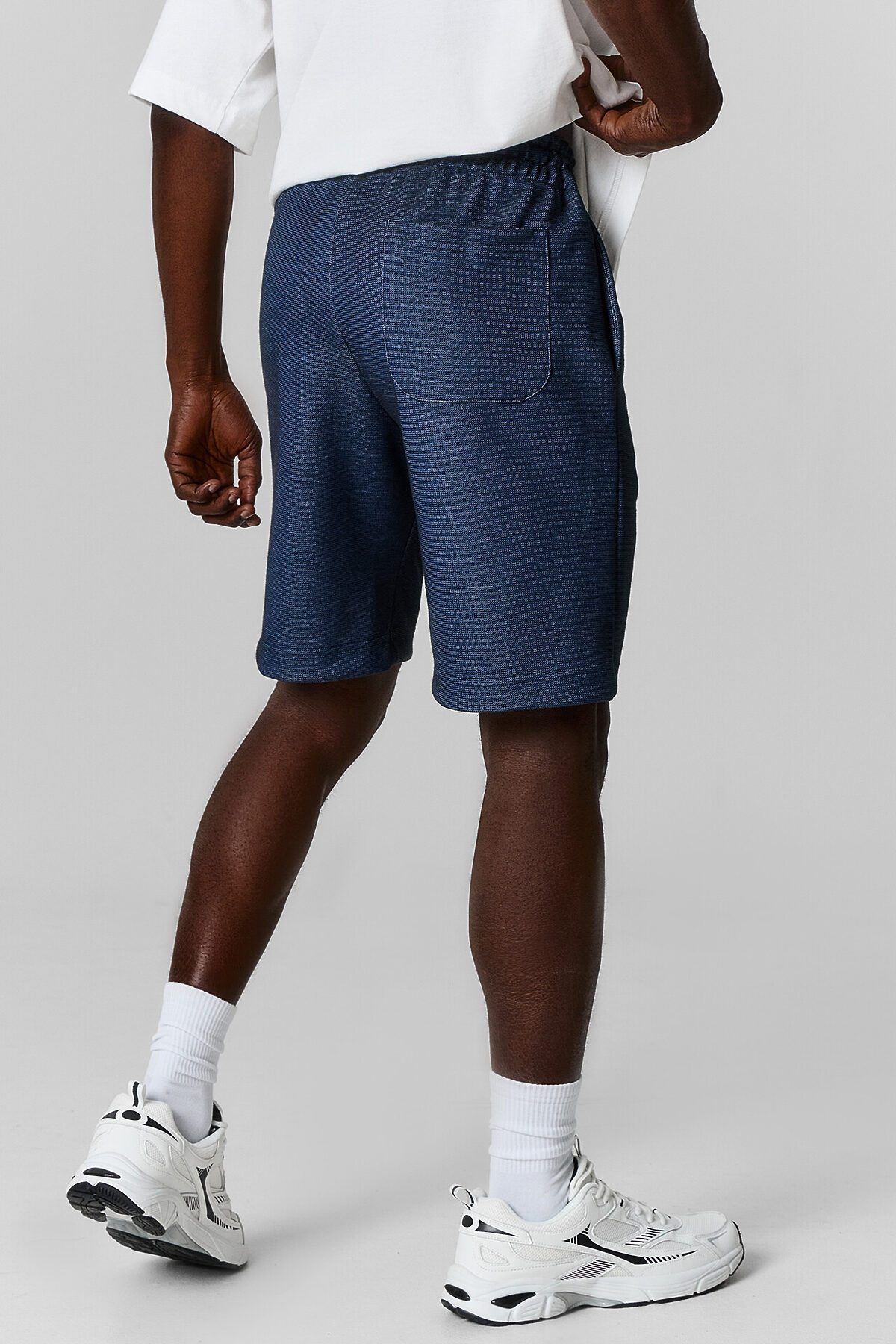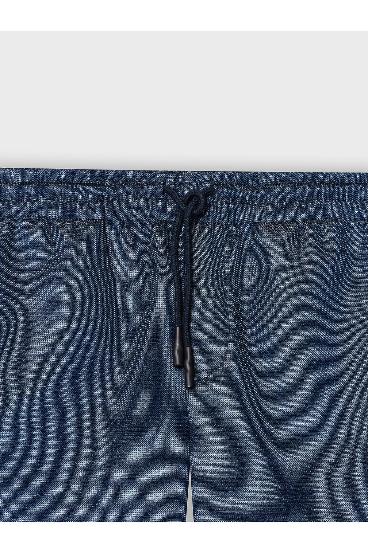 Шорты изготовлены из трикотажного полотна интерлок. Шорты прямого силуэта. Пояс цельнокроеный с эластичной тесьмой внутри. С внешней стороны пояса пробиты петли и втянут шнур с узлом на концах и с термоусадочной трубкой . В боковых швах обработаны карманы, подкладка кармана из основного полотна. На левой передней половинке проложена декоративная строчка - имитация гульфика. Низ шорт с отворотами.