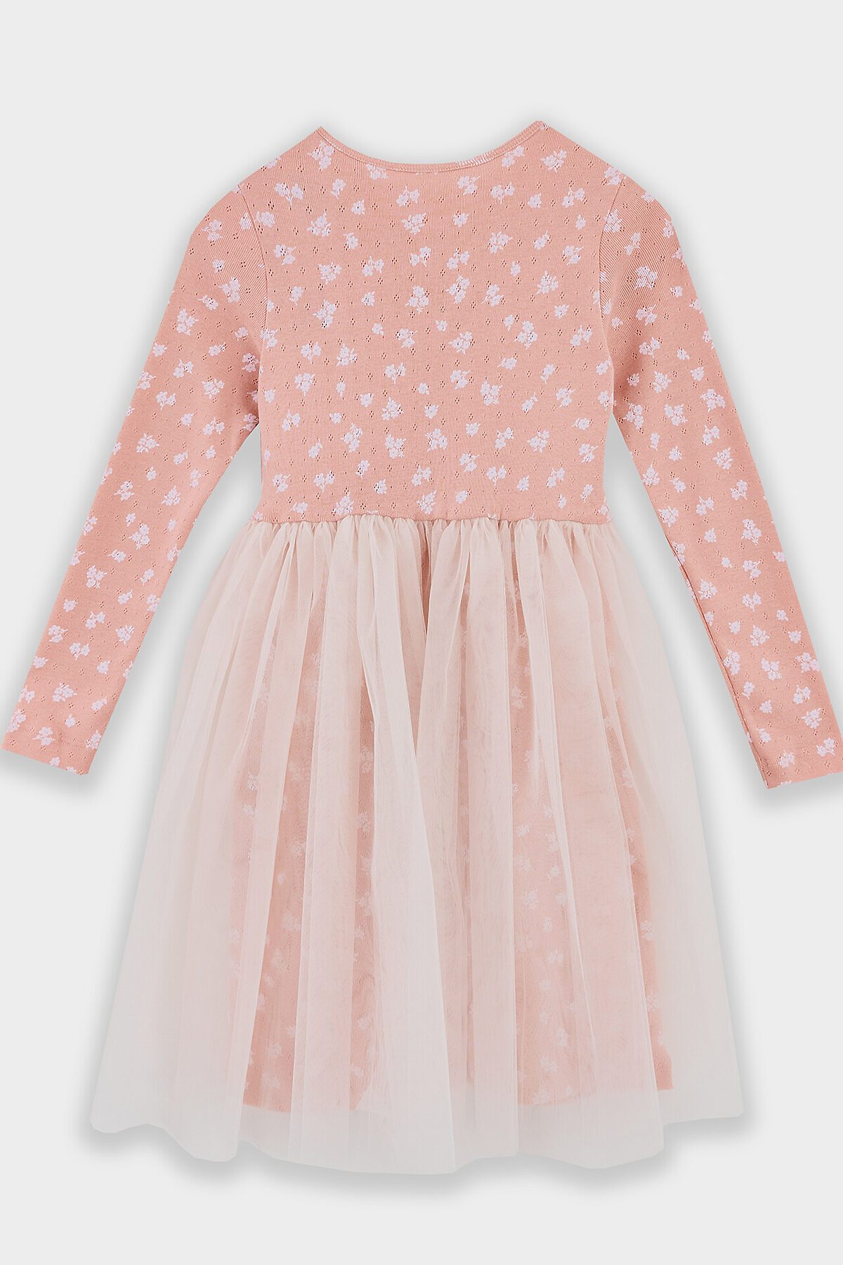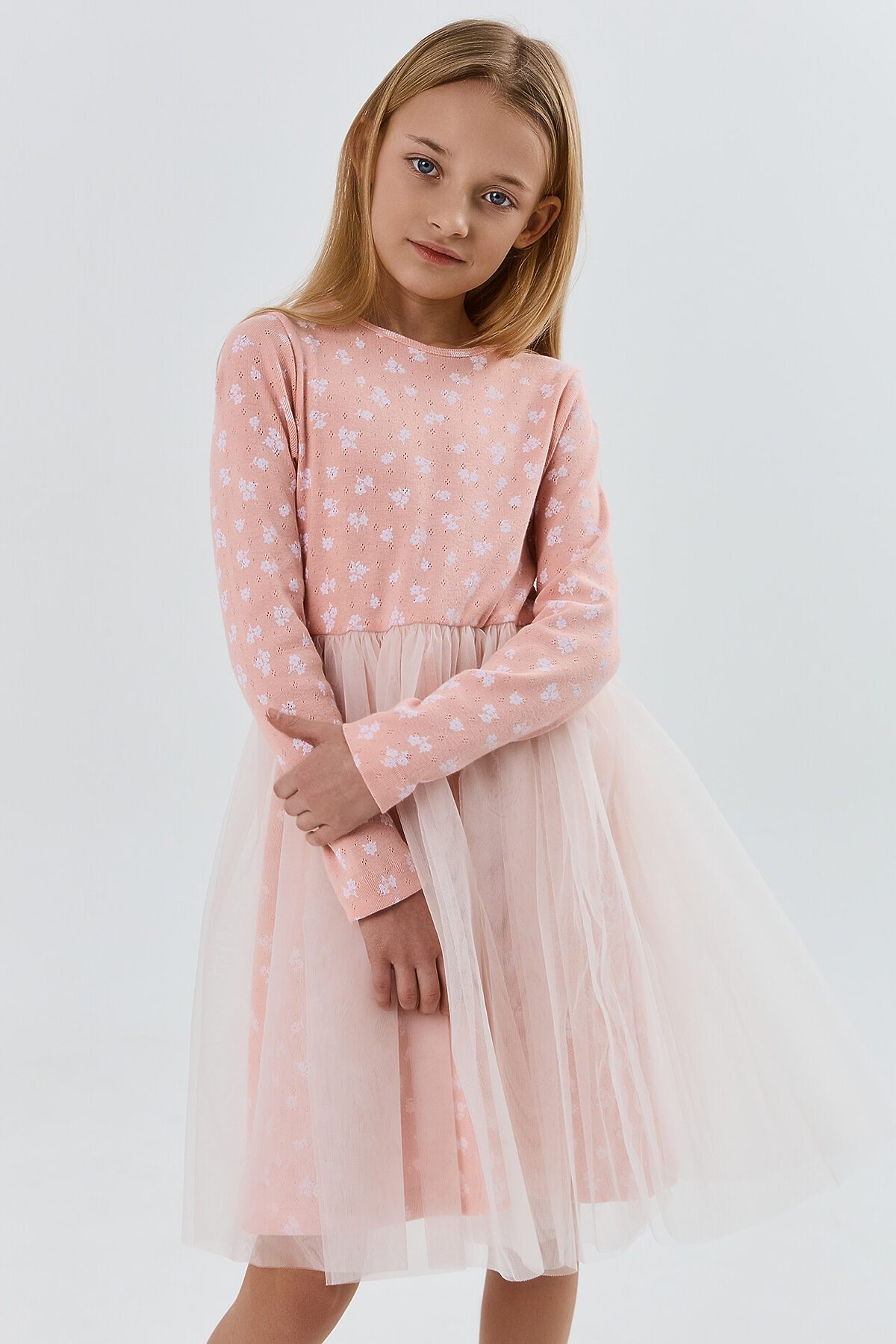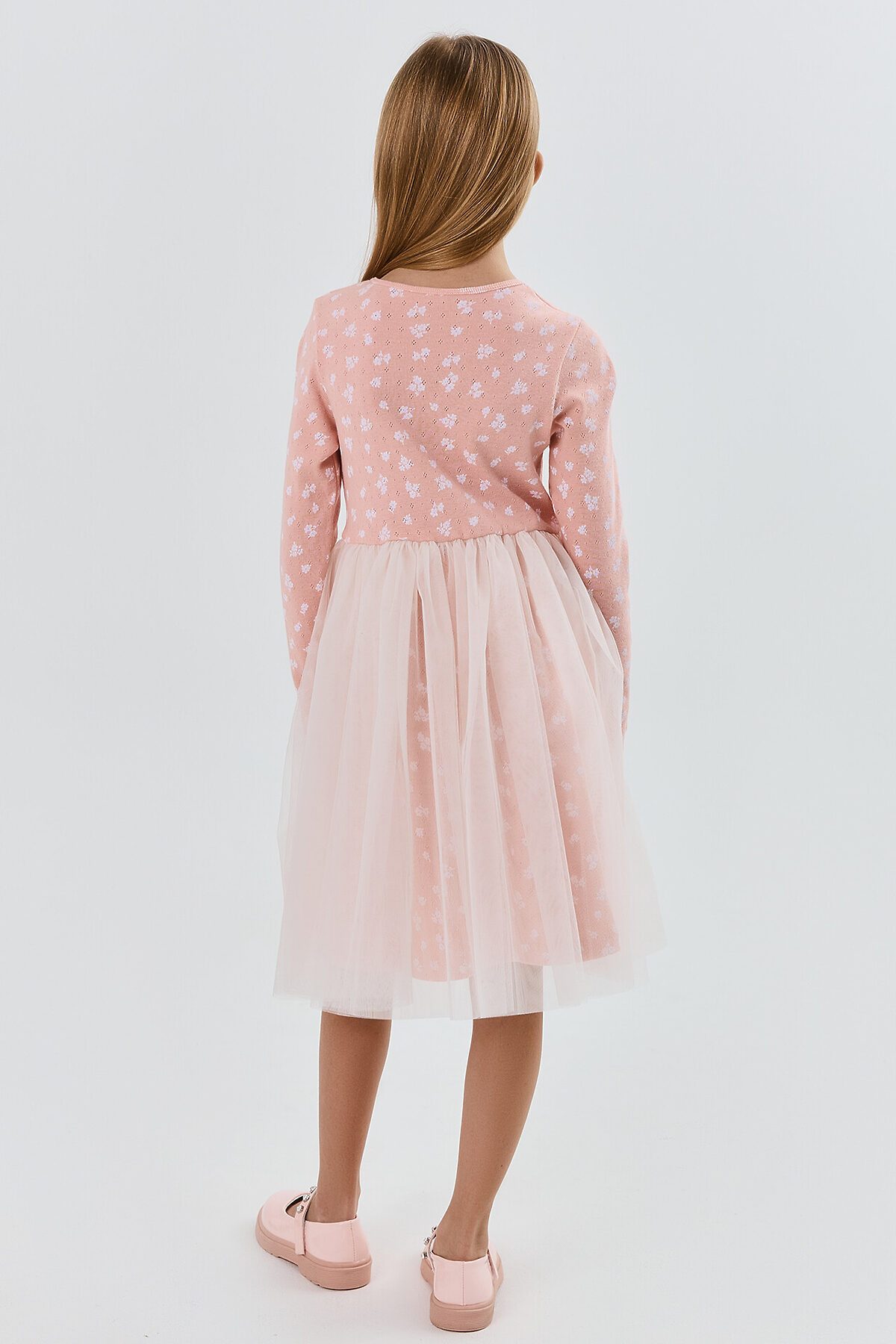 Платье прилегающего силуэта с отрезной юбкой. Горловина круглая, окантована бейкой из основного полотна. Рукав втачной длинный, слегка идет напуск на кисть. Низ рукава обработан на 2-х игольной плоскошовной машине. Юбка трехслойная на сборке с внутренней эластичной тесьмой 10RV. Верхние два слоя из полотна трикотажного сетки, подкладка из полотна трикотажного кулирного.