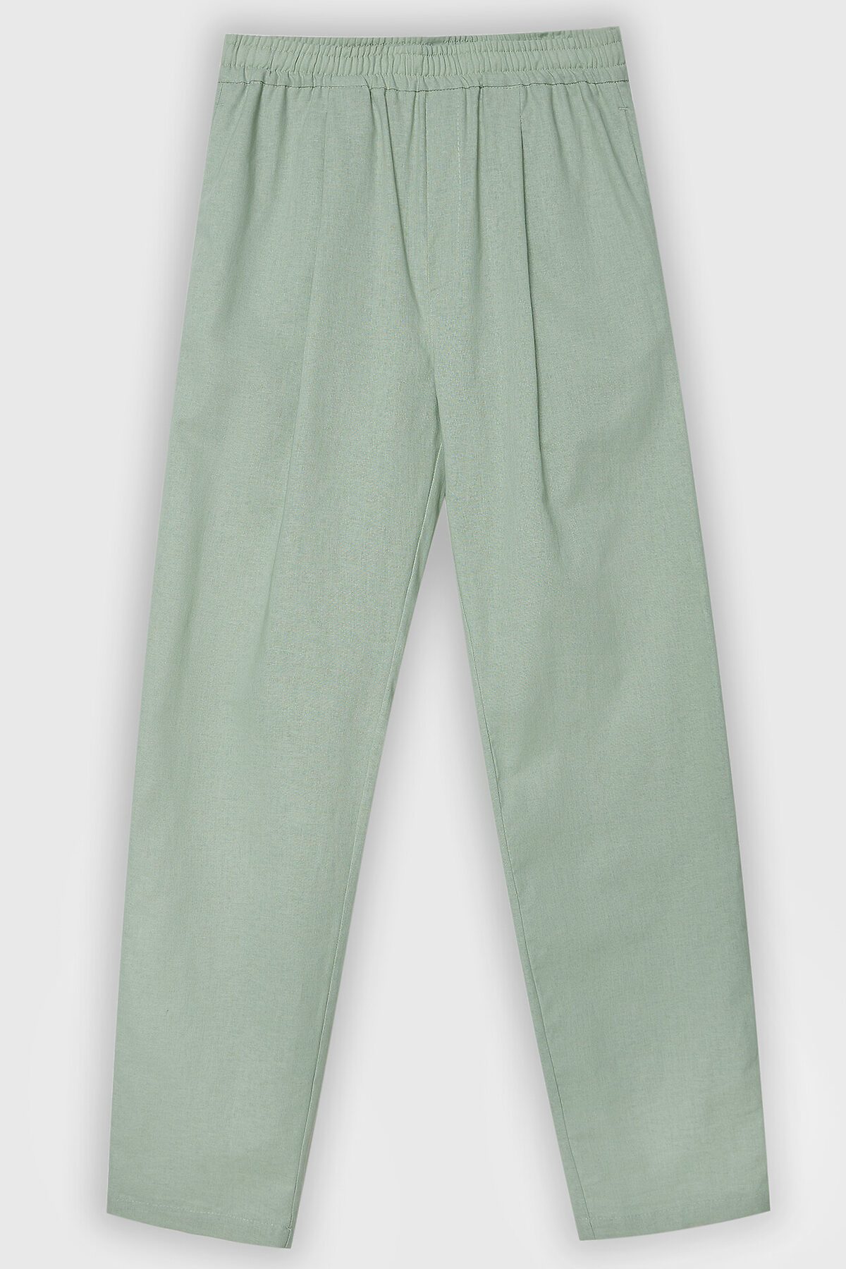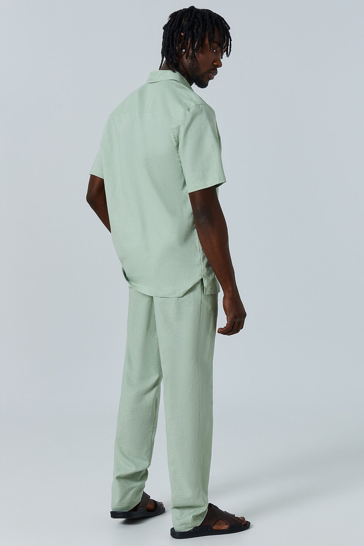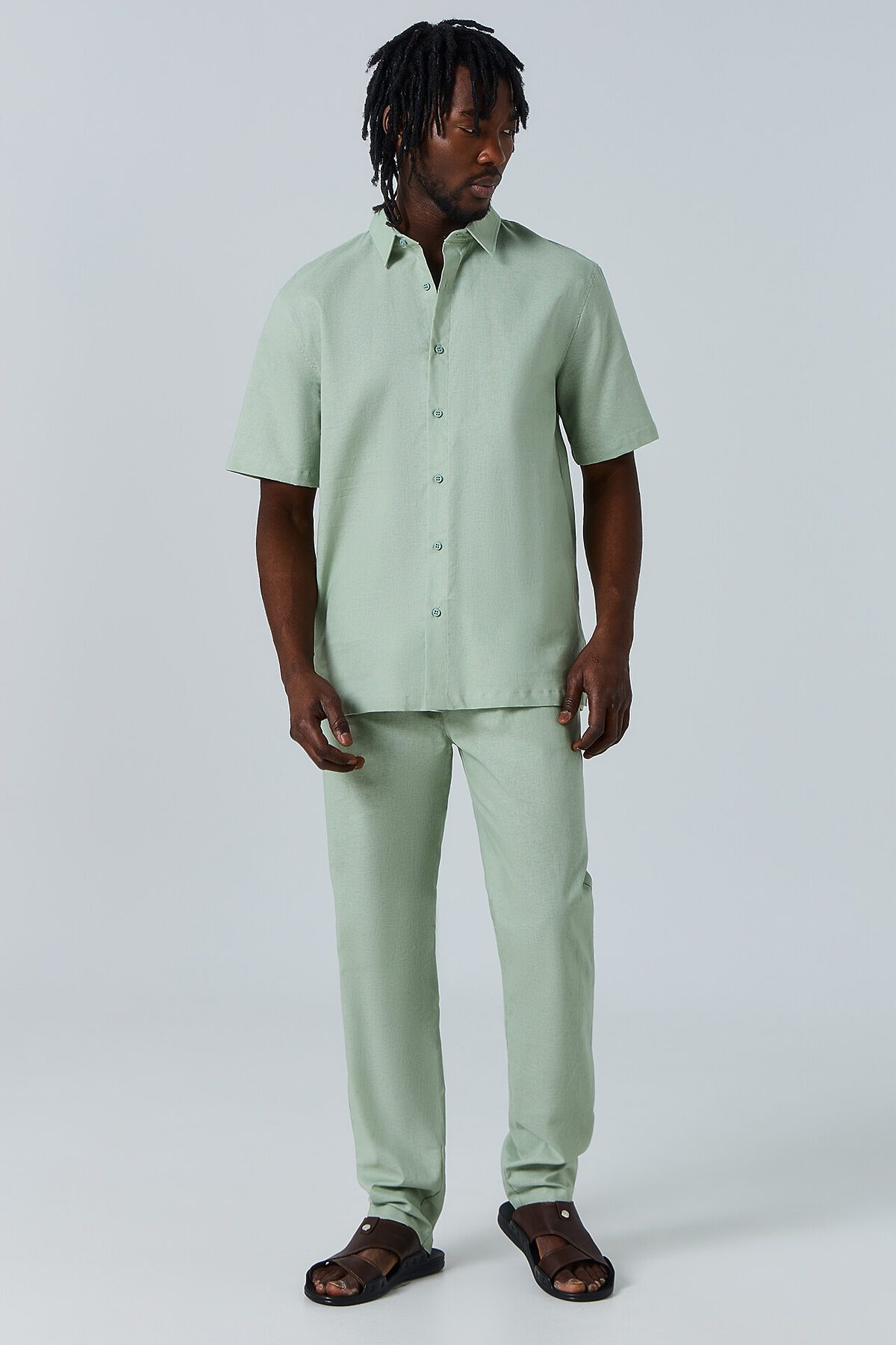 Сорочка верхняя мужская прямого силуэта из ткани, длиной до середины бедер. Рукава короткие втачные. По переду обработана застежка на петли и пуговицы. 7 рубашечных пуговиц на 4 прокола диаметром 10-12 мм. Воротник стояче-отложной с отрезной стойкой. Спинка с отрезной горизонтальной двойной кокеткой. По отлету воротника, по плечевому шву, по пройме и кокетке проложена отделочная строчка на 5мм от шва. Низ изделия и рукавов обработан швом вподгибку с закрытым срезом. Брюки из ткани полной длины с классической линией талии. Силуэт прямой, брюки заужены немного к низу. Пояс отрезной отстроченный, с эластичной тесьмой внутри и шнурком из основного полотна (втянут с изнанки). По переду имитация гульфика, складки талевые. В боковых швах карманы. На задних деталях брюк талевые вытачки. Низ брюк обработан швом в подгибку с открытым срезом.