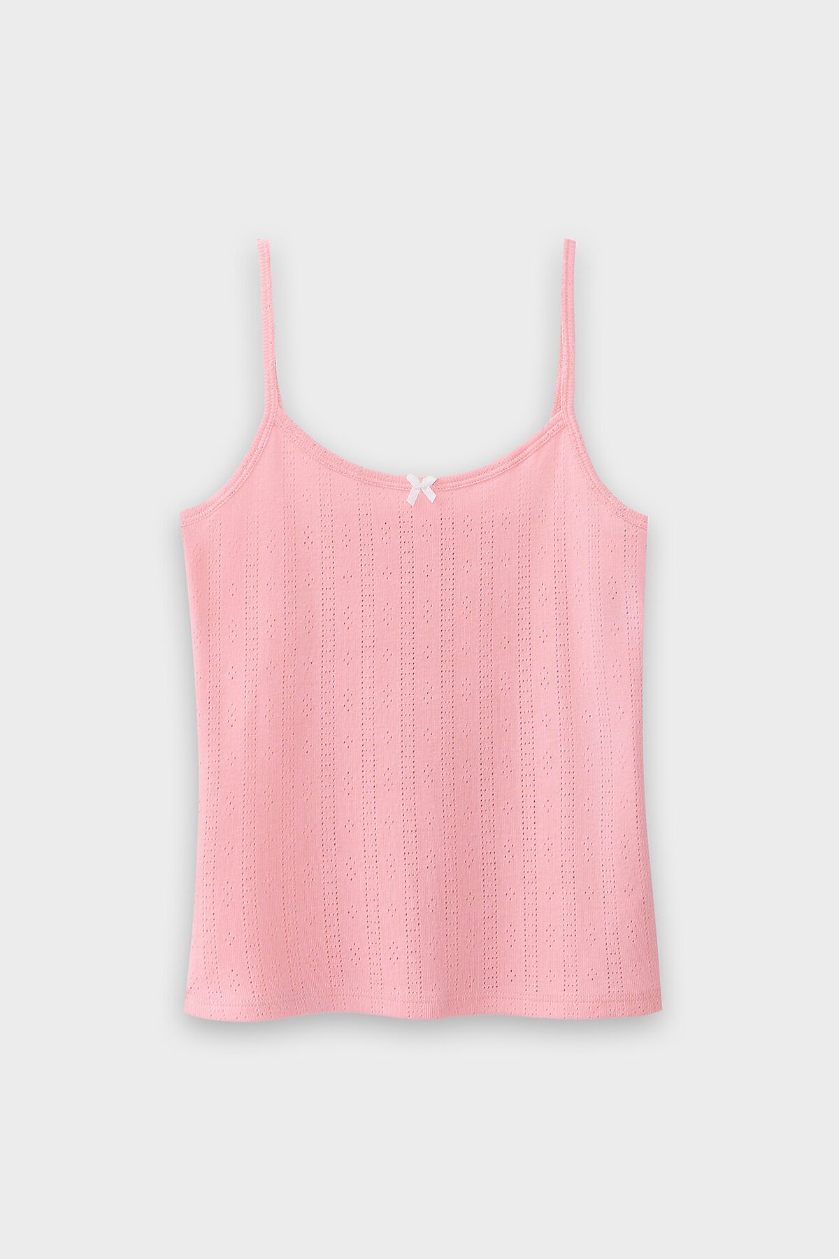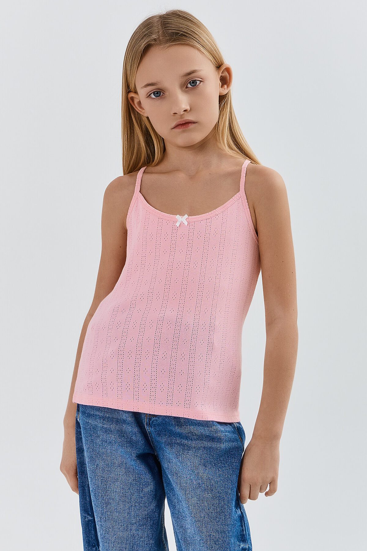 Топ прилигающего силуэта длиной чуть выше середины бедер. Верхний край спинки, бретели, срезы пройм окантовы бейкой. Перед и спинка цельнокроеные. Низ застрочен на 2-хигольной плоскошовной машине швом вподгибку с открытм срезом