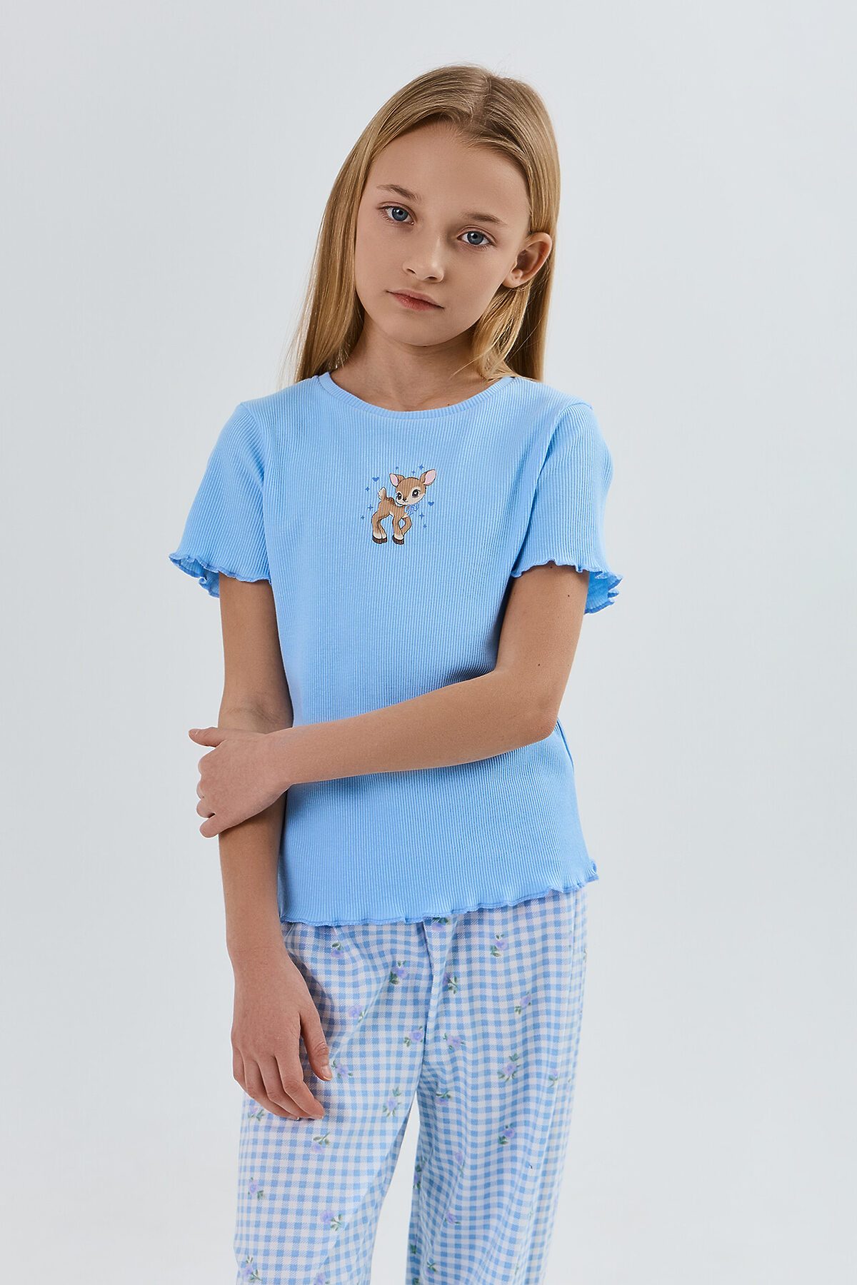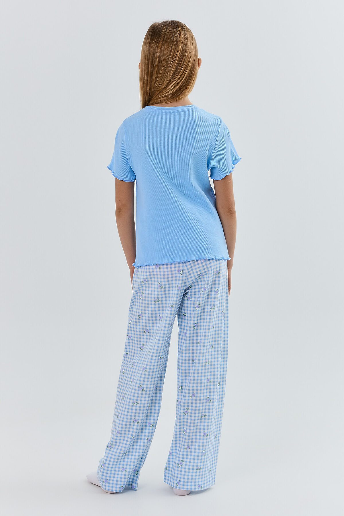 Комплект для девочек состоит из джемпера и брюк. Джемпер полуприлегающего силуэта, выполнен из рибаны (R-25 и R-43). Перед и спинка цельнокроеные. Горловина круглой формы. Рукав втачной, одношовный, короткий. Низ джемпера и рукавов обработаны на микроверлоке Брюки прямого, свободного силуэта выполнены из полотна трикотажного кулирного SJ-10 (SJ-001.01.140),100% хлопок, 180 см, 140 гр/м?. Пояс цельнокроеный с эластичной тесьмой внутри (внутрення резина 30RV), ширина 30 мм. Низ брюк обработан на 2-х игольной плоскошовной машине швом в подгибку.
