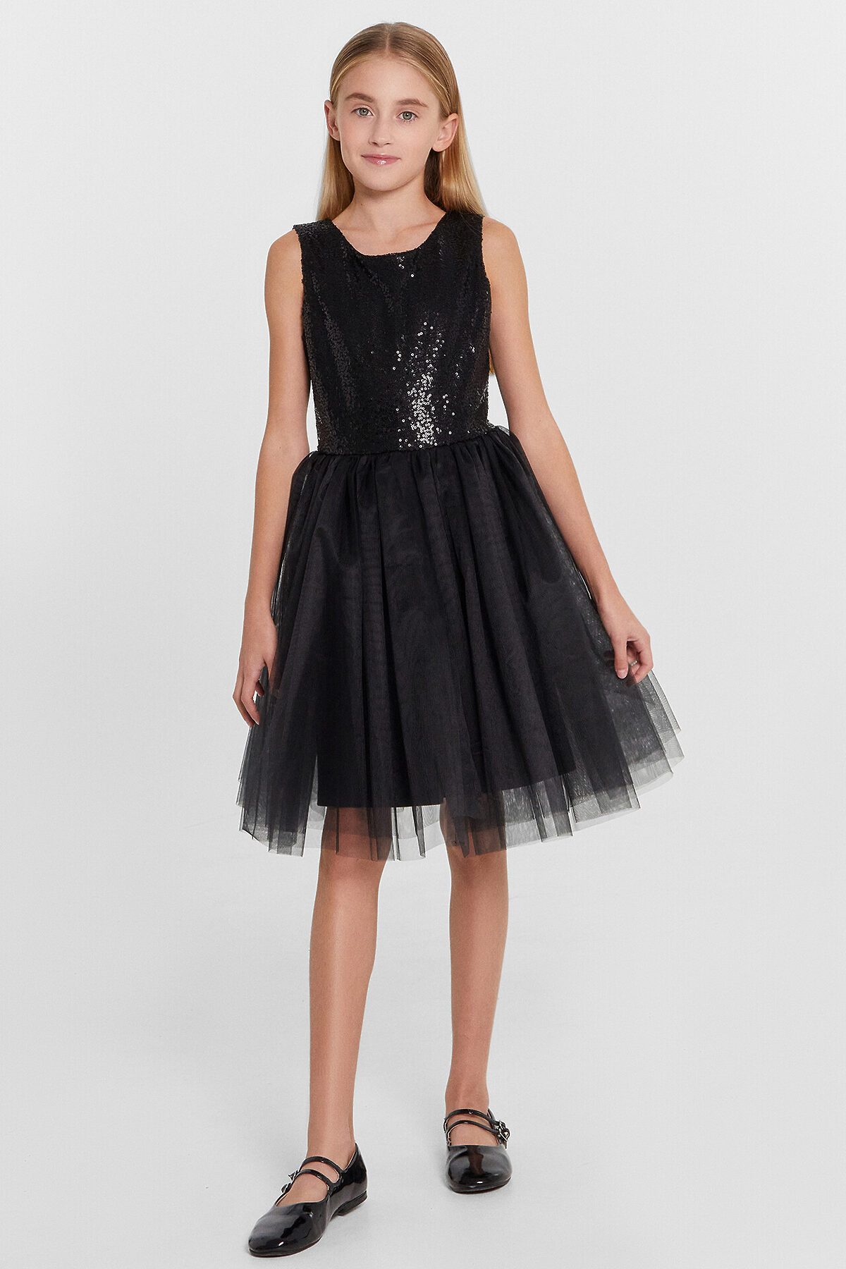 Платье полуприлегающего силуэта с отрезной пышной трехслойной юбкой. Длина выше колена. Горловина по переду круглая, а по спинке с V-образным вырезом. Лиф изделия выполнен из полотна трикотажного сетки с пайетками, подкладка из полотна трикотажного кулирного. По спинке застежка на потайную молнию. Юбка трехслойная на сборке. Верхние два слоя из полотна трикотажного сетки, подкладка из полотна трикотажного кулирного. Низ подкладки обработан на 2х игольной плоскошовной машине. Первый слой сетки юбки короче второго.