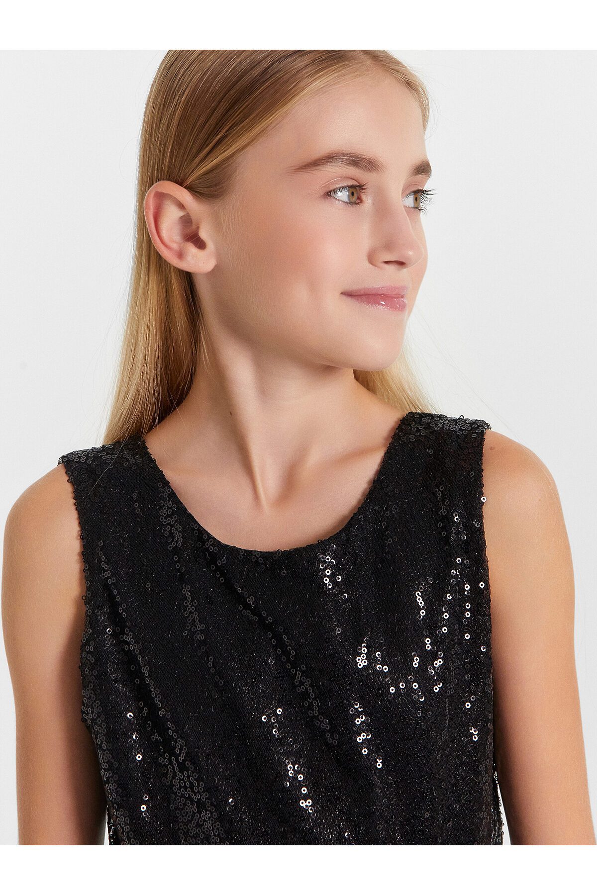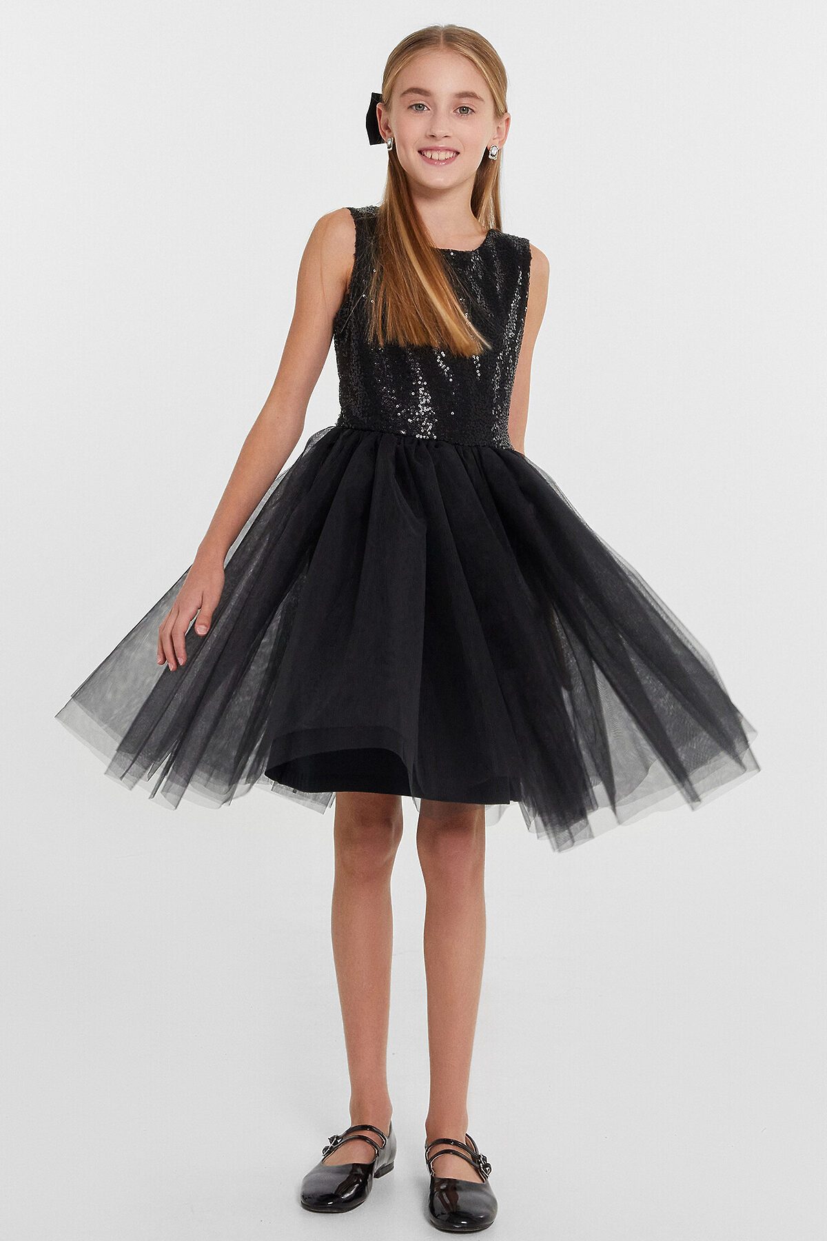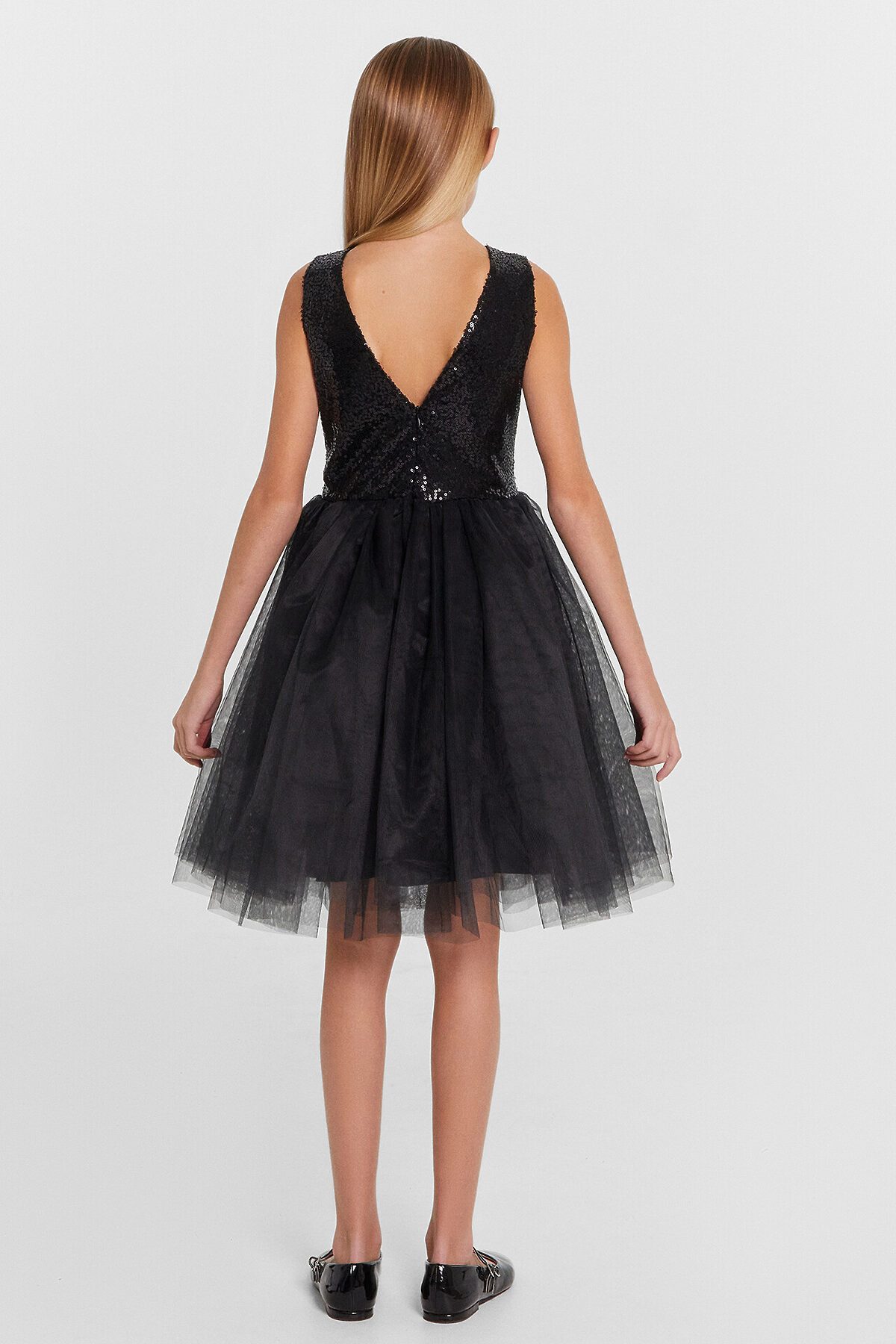 Платье полуприлегающего силуэта с отрезной пышной трехслойной юбкой. Длина выше колена. Горловина по переду круглая, а по спинке с V-образным вырезом. Лиф изделия выполнен из полотна трикотажного сетки с пайетками, подкладка из полотна трикотажного кулирного. По спинке застежка на потайную молнию. Юбка трехслойная на сборке. Верхние два слоя из полотна трикотажного сетки, подкладка из полотна трикотажного кулирного. Низ подкладки обработан на 2х игольной плоскошовной машине. Первый слой сетки юбки короче второго.