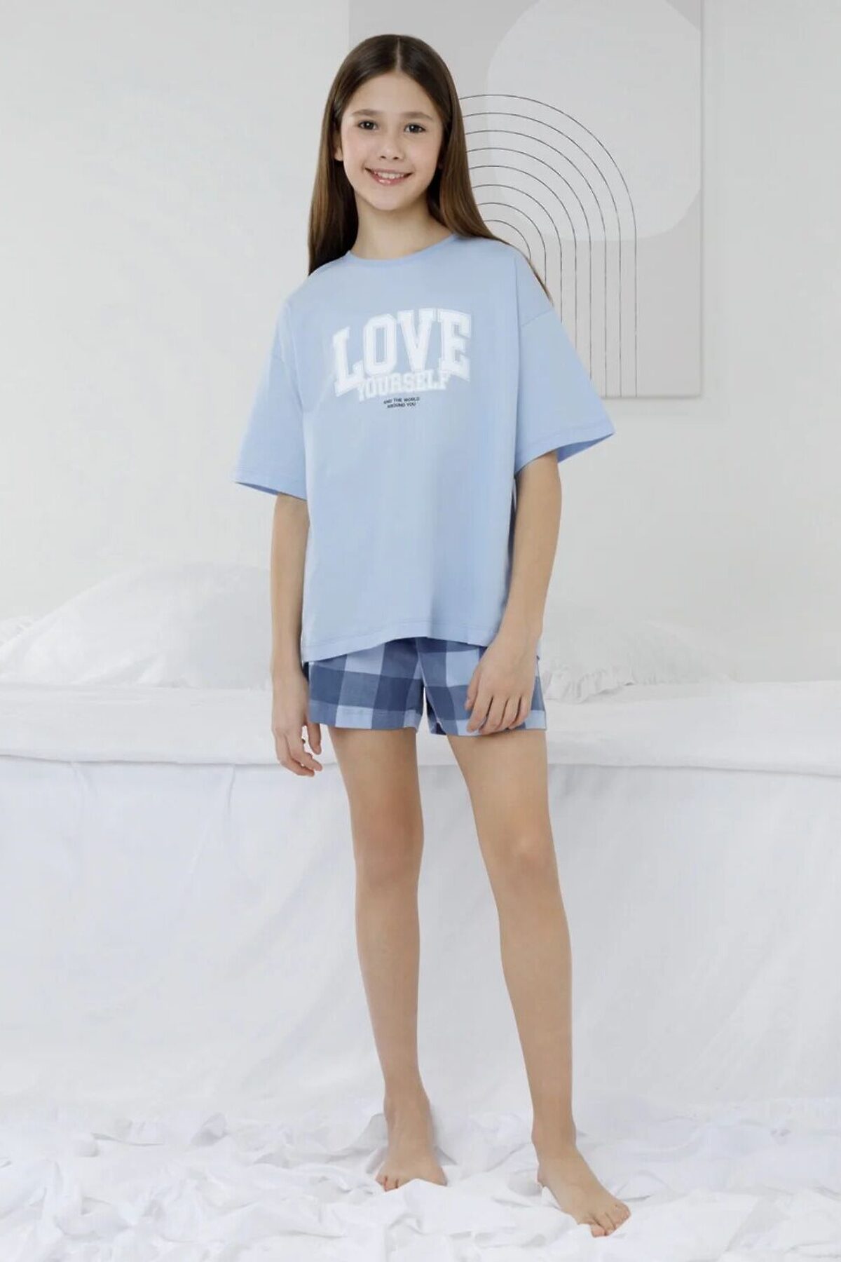 Трикотажная пижама из натурального хлопка для комфортного сна и отдыха. Свободная футболка с короткими спущенными рукавами и шорты с мягкой эластичной резинкой в поясе. Оригинальный рисунок выполнен из стойких текстильных гипоаллергенных красителей. Изделие сохраняет цвет и форму после многократных стирок. Все трикотажные полотна производятся в соответствии с нормами швейцарского сертификата ЭкоТекс.