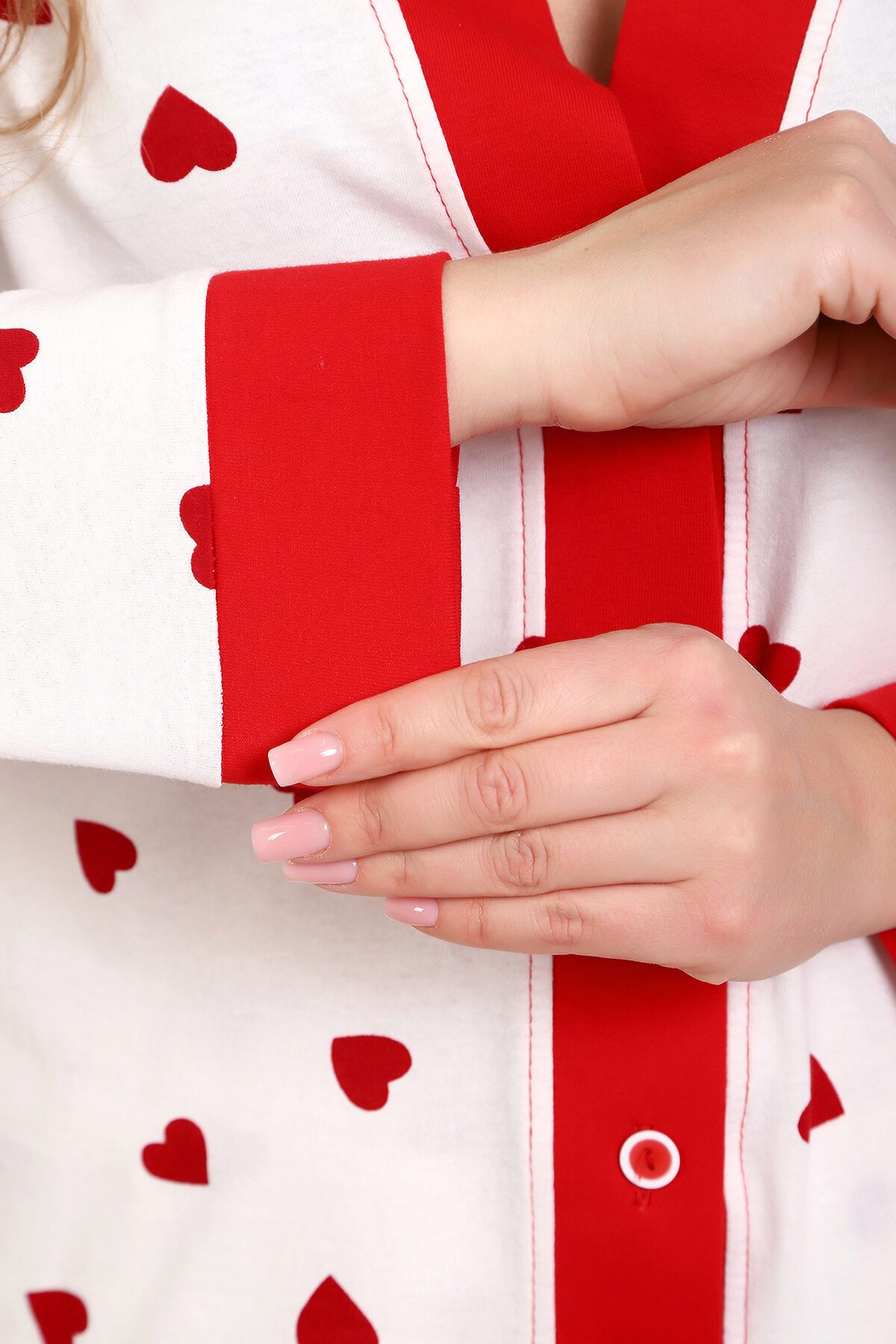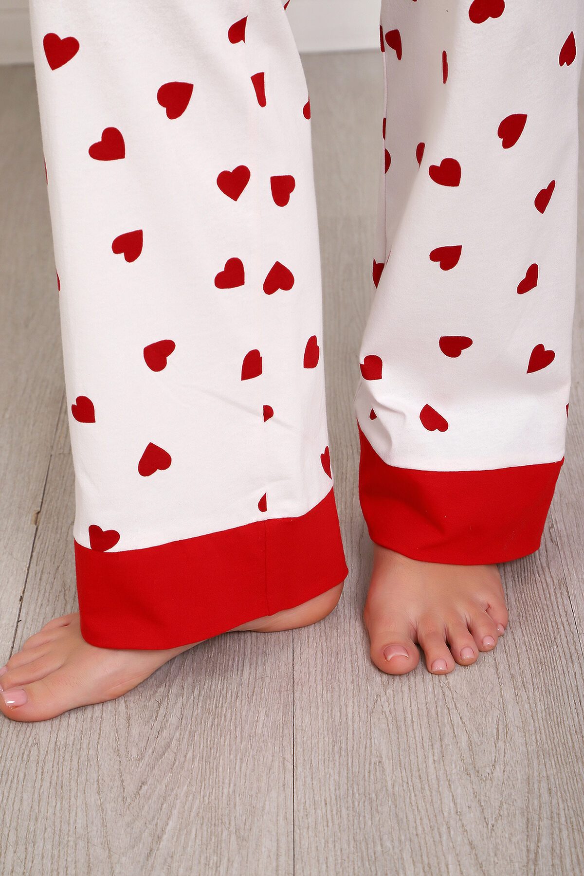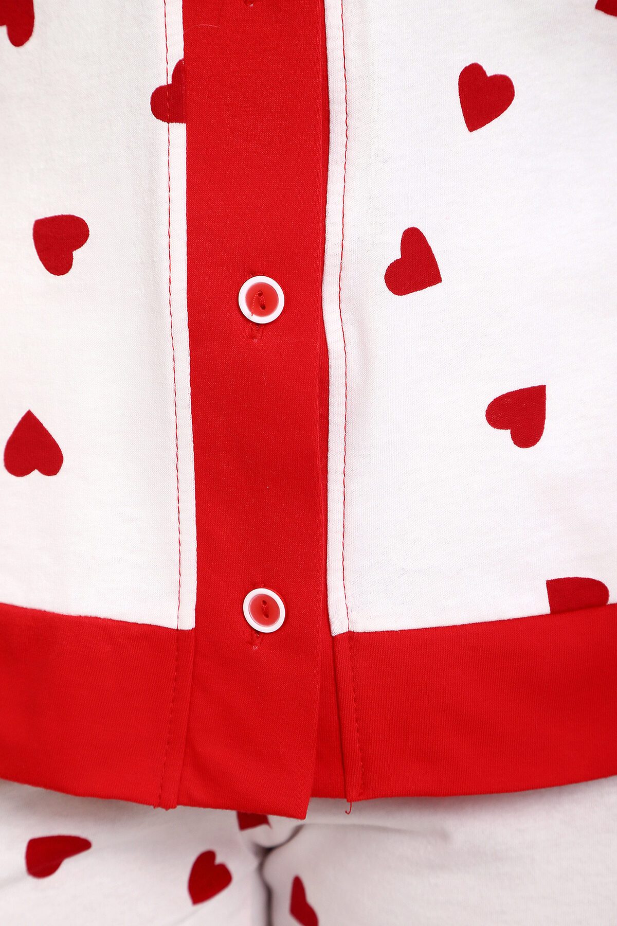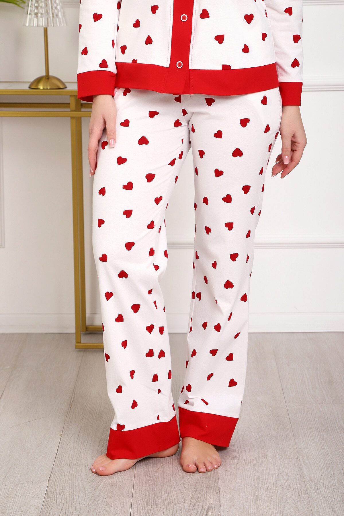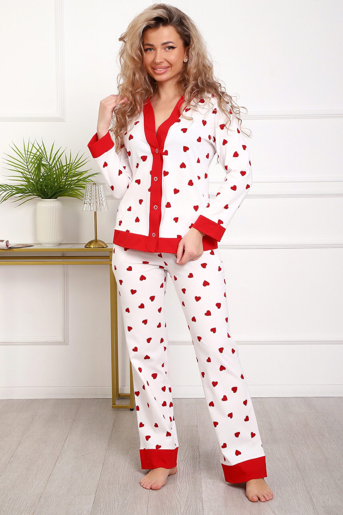 Пижама с брюками представлена в двух расцветках: лёгкий белый цвет с красными сердечками и классическая клетка на красном. Кофта с длинным рукавом с манжетами, низ изделия и застежка обработаны контрастной обтачкой. Кофта с застёжкой на пуговицы, с элегантным V-образным вырезом. брюки с ленинградскими боковыми карманами, притачной пояс, низ брюк обработан контрастными манжетами.