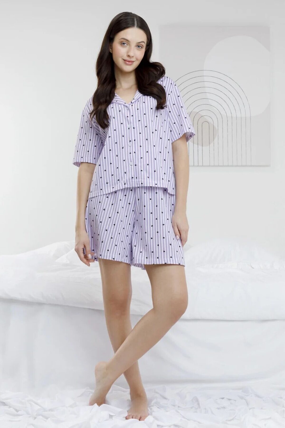 Трикотажная пижама из натурального хлопка для комфортного сна и отдыха. Рубашка на пуговицах с короткими рукавами и свободные шорты с мягкой эластичной резинкой в поясе. Гладкий материал приятен к телу, не теряет форму и позволяет коже дышать. Набивной рисунок выполнен из стойких текстильных гипоаллергенных красителей. Все трикотажные полотна производятся в соответствии с нормами швейцарского сертификата ЭкоТекс.