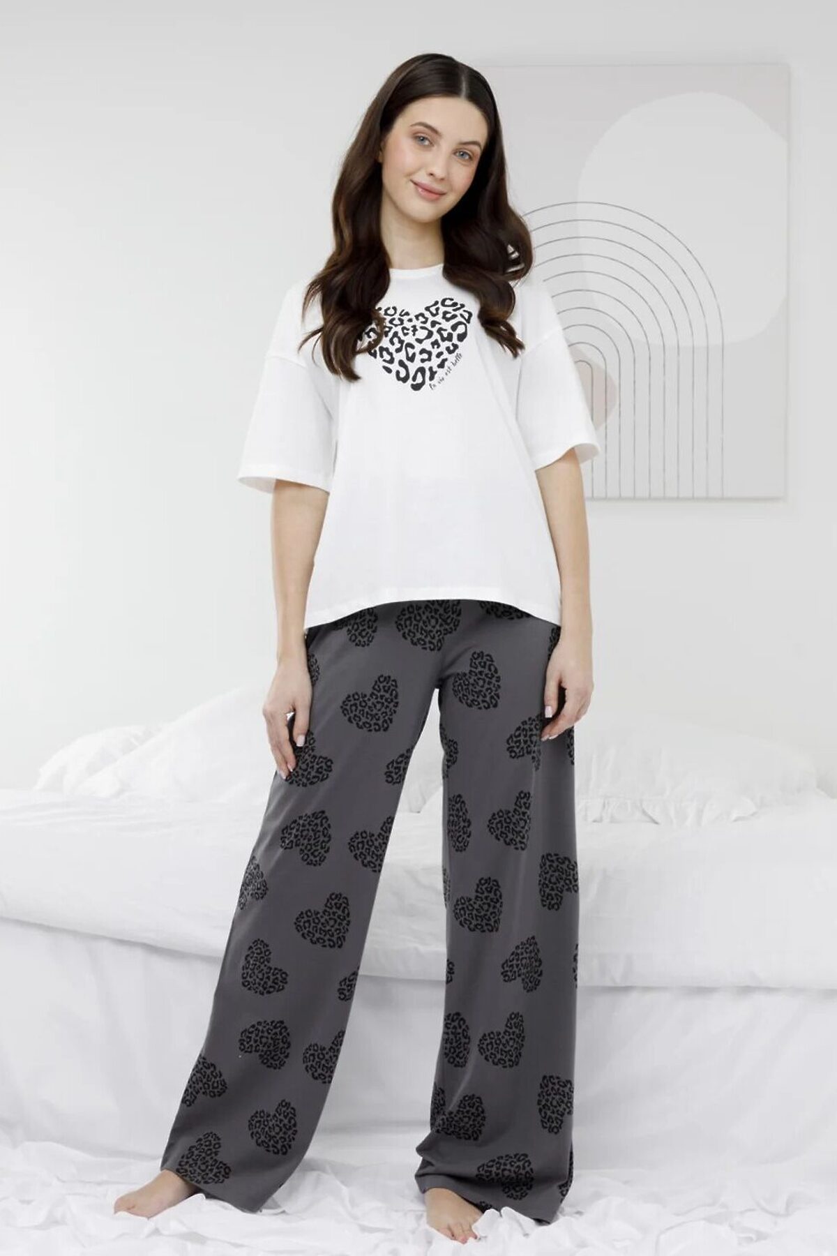 Трикотажная пижама из натурального хлопка для комфортного сна и отдыха. Свободная футболка с короткими рукавами и прямые брюки с мягкой эластичной резинкой в поясе. Гладкий материал приятен к телу, не теряет форму и позволяет коже дышать. Оригинальный принт и набивка выполнены из стойких текстильных гипоаллергенных красителей. Все трикотажные полотна производятся в соответствии с нормами швейцарского сертификата ЭкоТекс.
