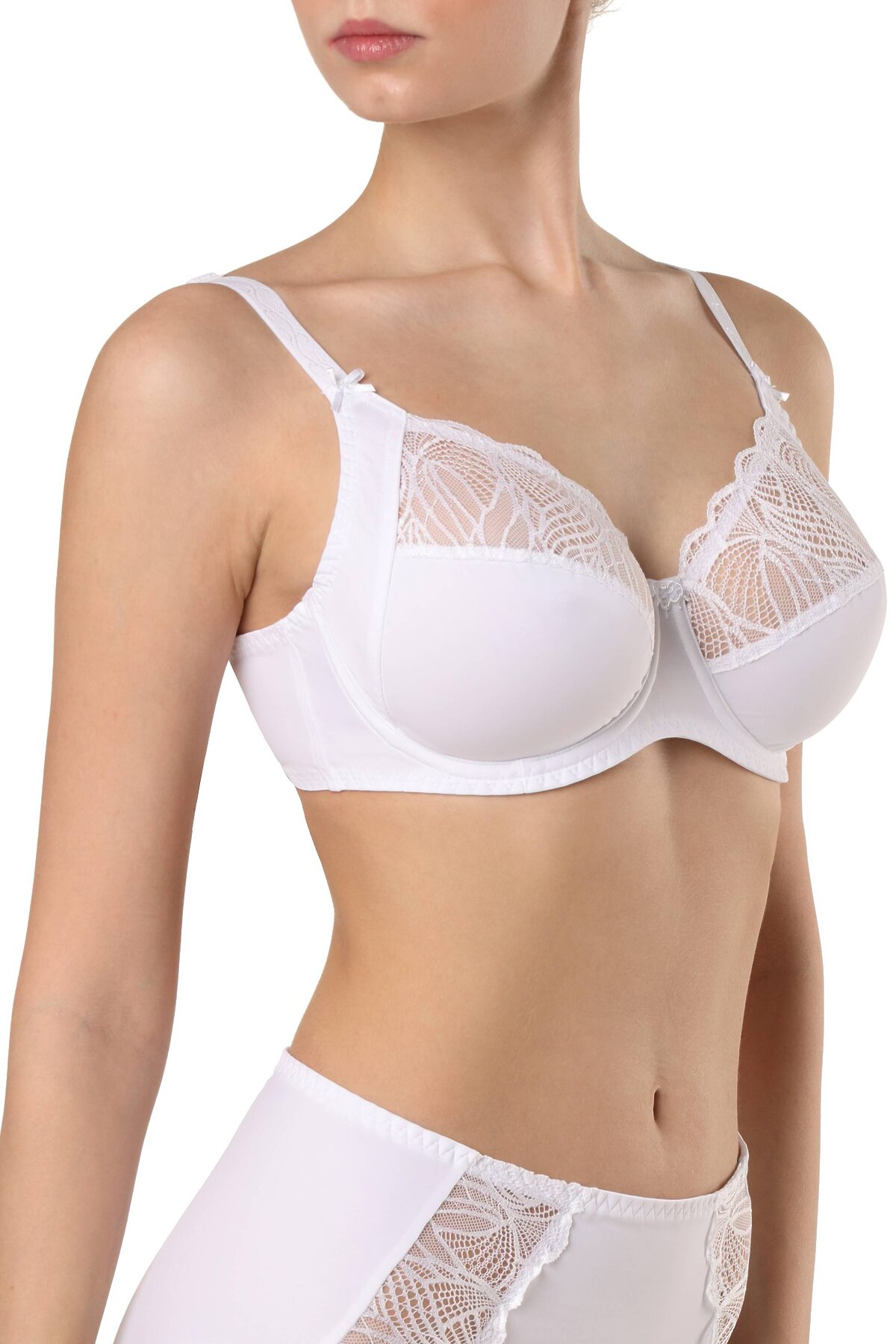 Классическая серия белья Aura создана из неэластичного функционального трикотажа и кружева с растительным рисунком. Белье эффектно подчеркивает женственные линии и гарантирует безупречную поддержку, необходимую для обладательниц пышных форм. • мягкая чашка на каркасах • боковая корректирующая деталь для дополнительной поддержки • регулируемые бретели • украшение ¬– вышивка-аппликация • широкий размерный ряд • безупречная поддержка и абсолютный комфорт.