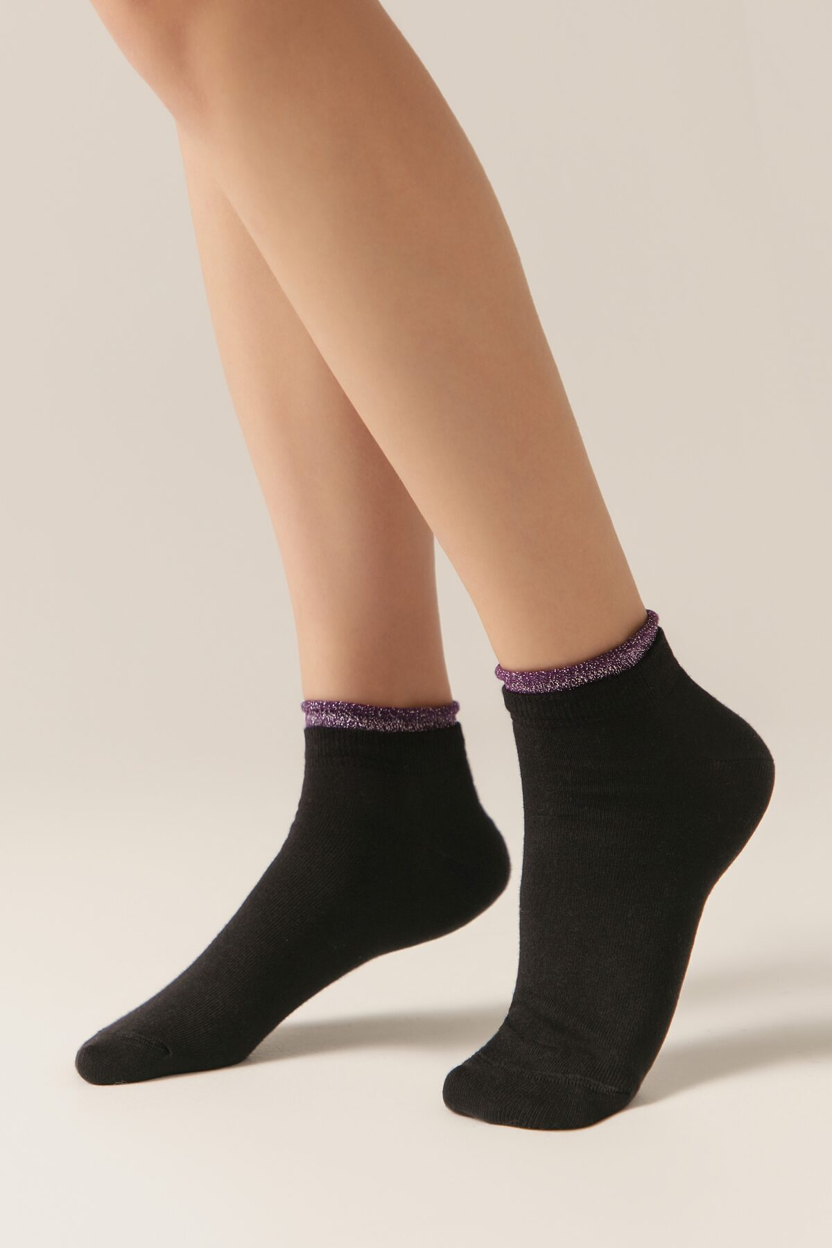 Укороченные спортивные женские носки из хлопка, однотонные с контрастной декоративной отделкой по краю резинки.