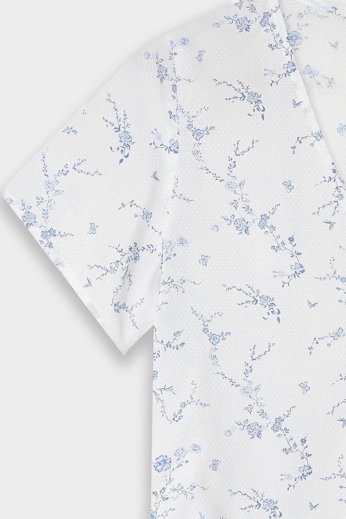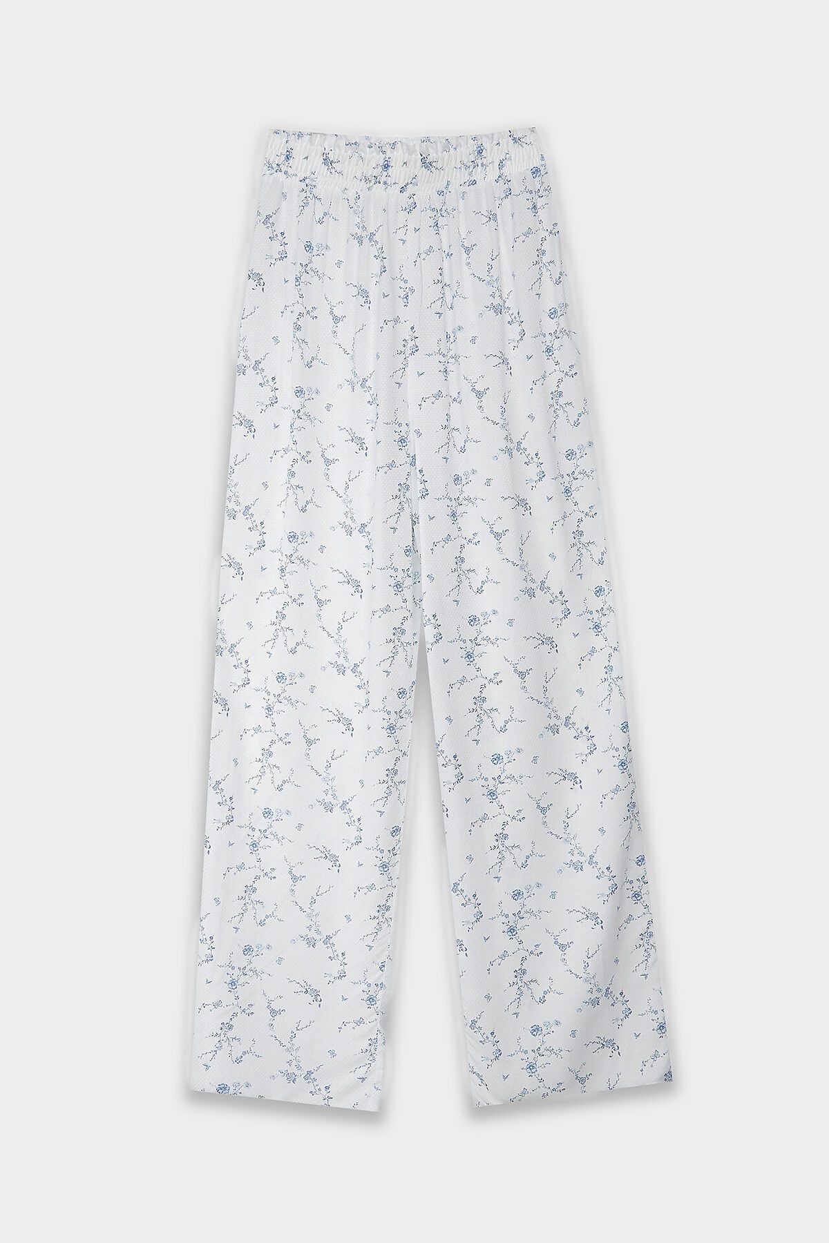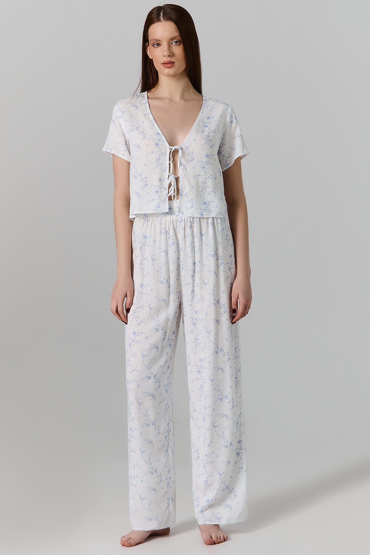 Комплект женский состоит из блузы и брюк. Блуза прямая короткая. Горловина V-образной формы. Горловина и борта обработаны бейкой из основного полотна. По переду центральная застежка на завязки. Рукава втачные короткие. Нижние срезы блузы и рукавов обработаны швом вподгибку с закрытым срезом. Брюки прямые свободные, посадка высокая. Пояс отрезной с эластичной тесьмой внутри (вн. 50мм 50RV). Нижний срез обработан швом вподгибку с закрытым срезом.