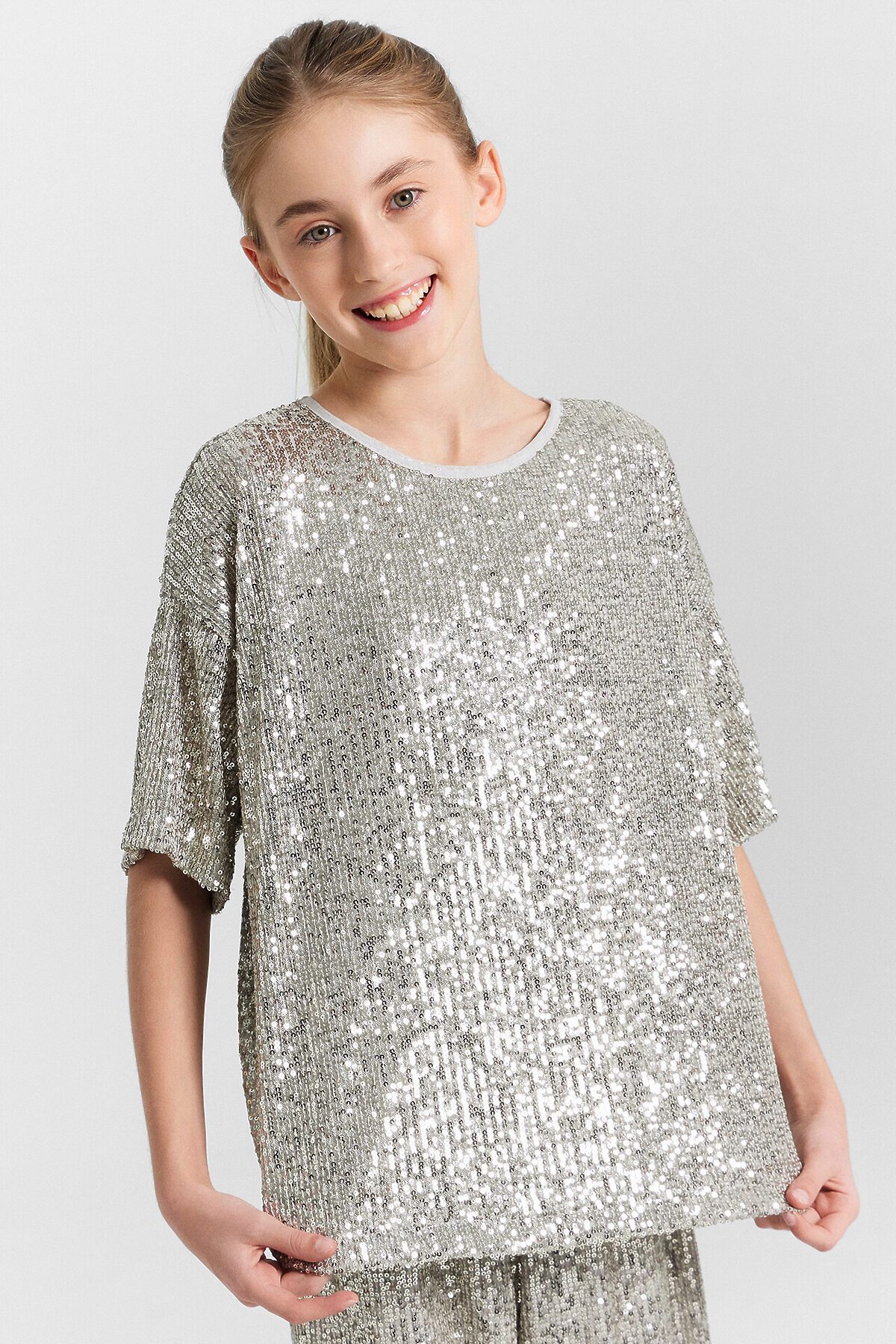 Нарядная блузка из сетки, расшитой мерцающими пайетками, станет прекрасным дополнением яркого и эффектного образа для девочек. Модель имеет круглый вырез горловины и короткие рукава, что придает ей элегантность и воздушность. Нижний слой выполнен из нежной кулирки, обеспечивающей мягкость и комфорт при носке. Эта блузка идеально сочетается с брюками из аналогичного материала и создает гармоничный и праздничный ансамбль. Отличный выбор для особых случаев и торжественных мероприятий!