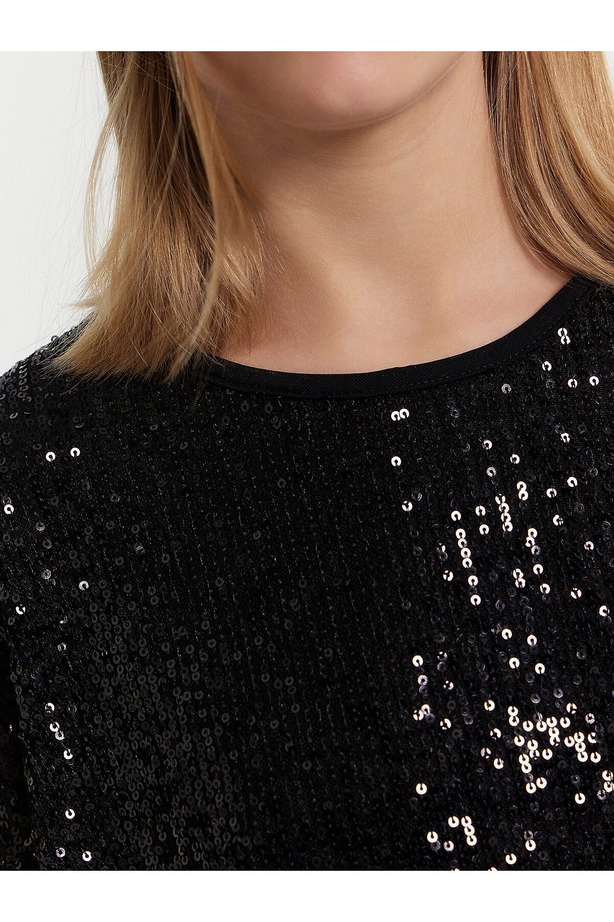 Нарядная блузка из сетки, расшитой мерцающими пайетками, станет прекрасным дополнением яркого и эффектного образа для девочек. Модель имеет круглый вырез горловины и короткие рукава, что придает ей элегантность и воздушность. Нижний слой выполнен из нежной кулирки, обеспечивающей мягкость и комфорт при носке. Эта блузка идеально сочетается с брюками из аналогичного материала и создает гармоничный и праздничный ансамбль. Отличный выбор для особых случаев и торжественных мероприятий!