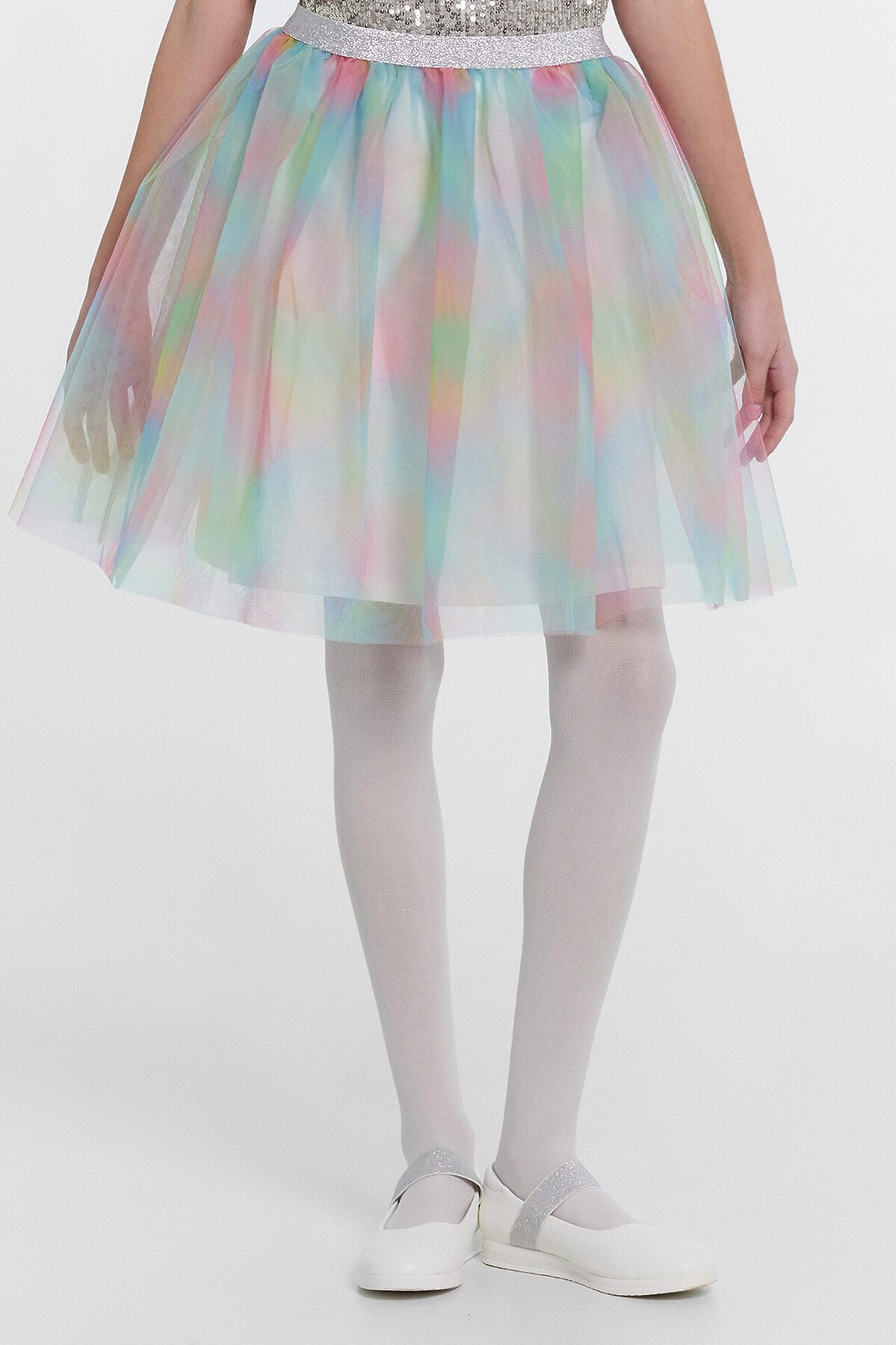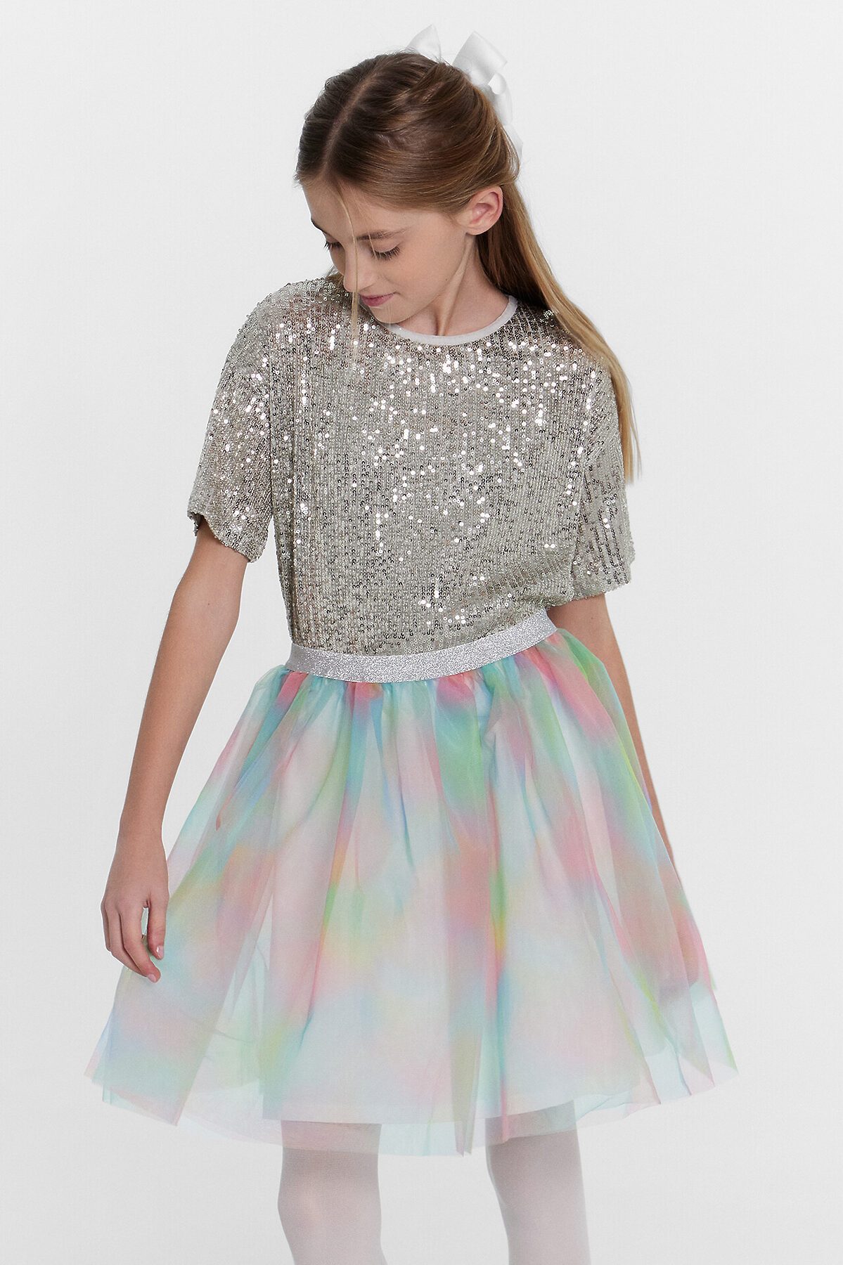 Юбка трехслойная пышная на сборке. Длина выше колена. Верхний слой из трикотажного полотна сетки с пайетками, средний слой из трикотажного основовязаного полотна сетки, нижний слой из полотна трикотажного кулирного. Нижний слой короче. Пояс из жаккардовой тесьмы.