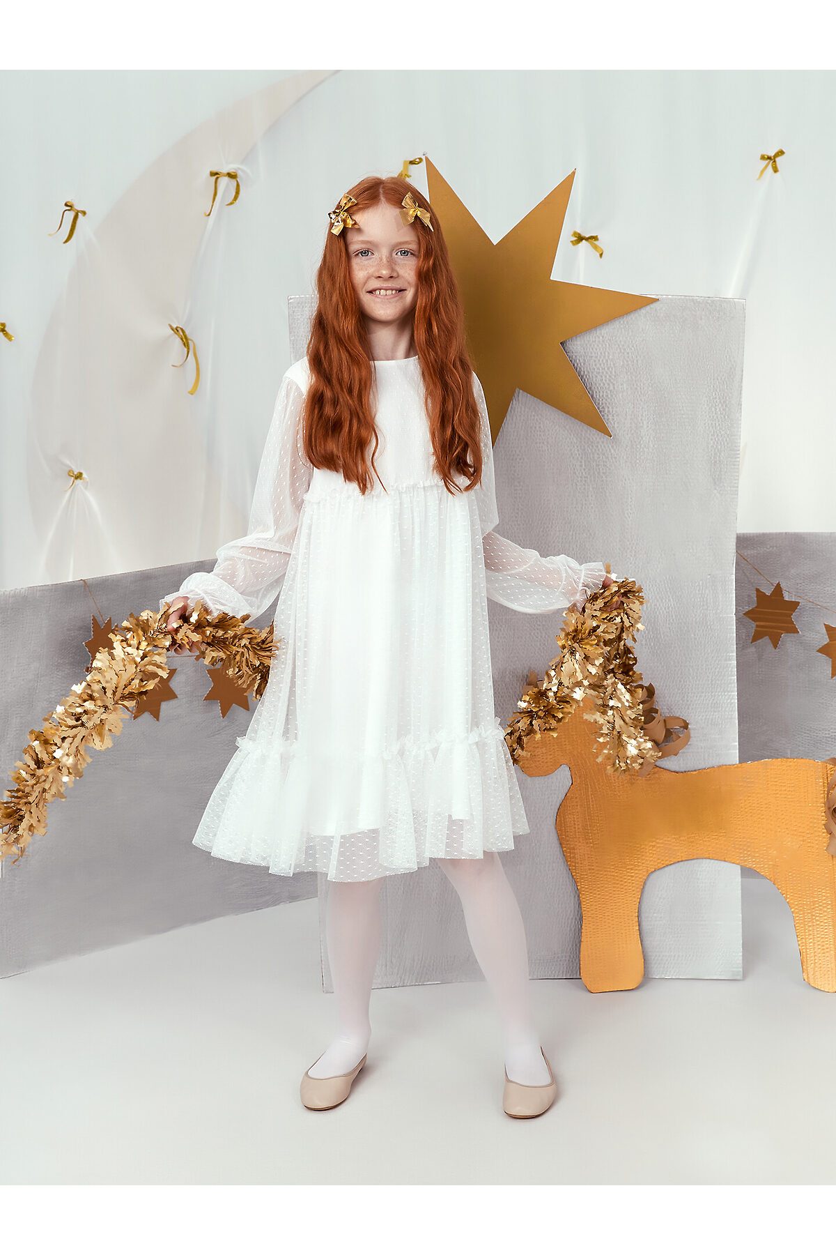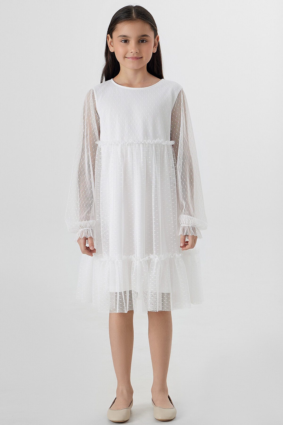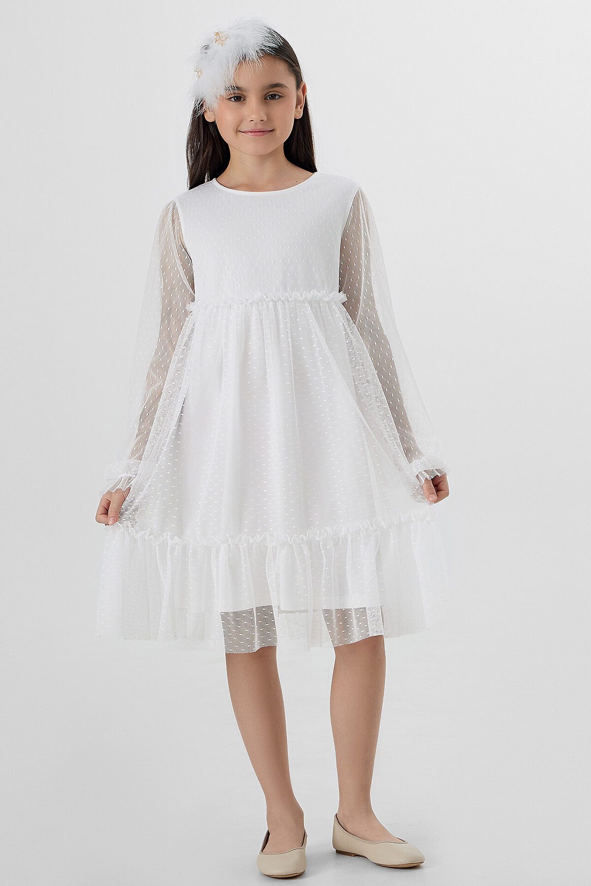 Нарядное платье для девочки из нежной сеточки – идеальный выбор для праздничных мероприятий, утренников и других торжественных случаев. Круглый вырез горловины и длинные рукава придают модели элегантность и утонченность. На спинке находится застежка-пуговица, что добавляет изысканный акцент. Подкладка платья выполнена из нежной хлопковой кулирки, которая обеспечивает комфорт и мягкость на протяжении всего дня. Кулирка – это материал, который дышит, позволяет коже ощущать приятную прохладу и предотвращает раздражение, что особенно важно для детской кожи. Это платье не только красиво, но и функционально, оно подарит вашей малышке ощущение праздника и комфорта. Рекомендуем для создания волшебного и нарядного образа!
