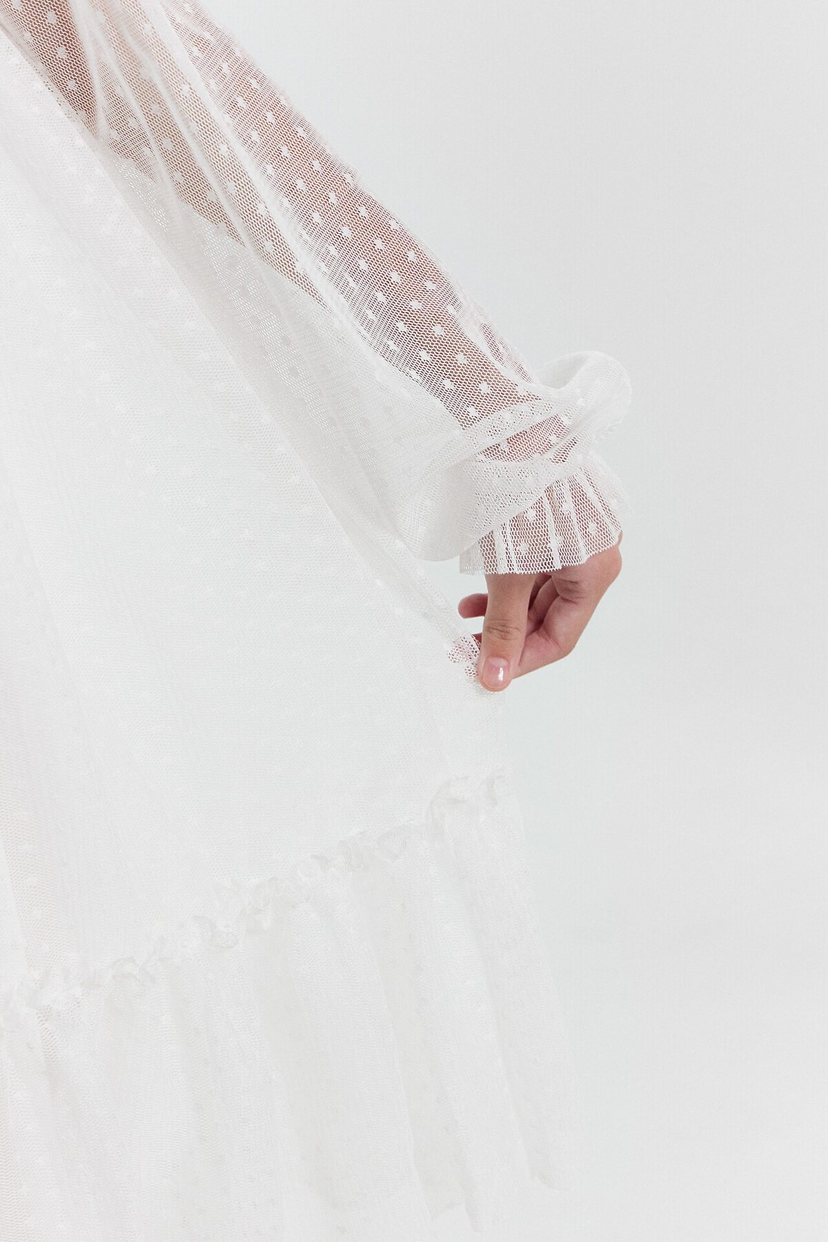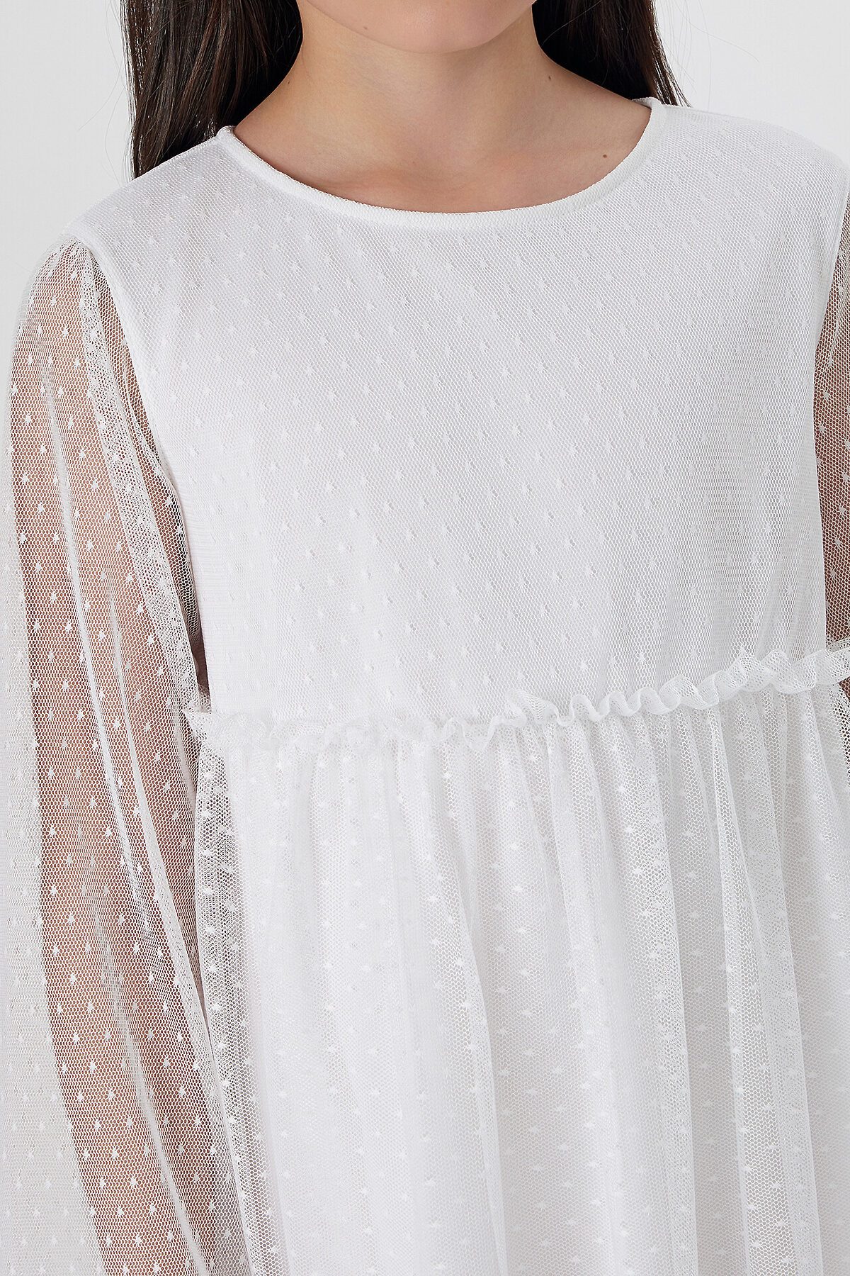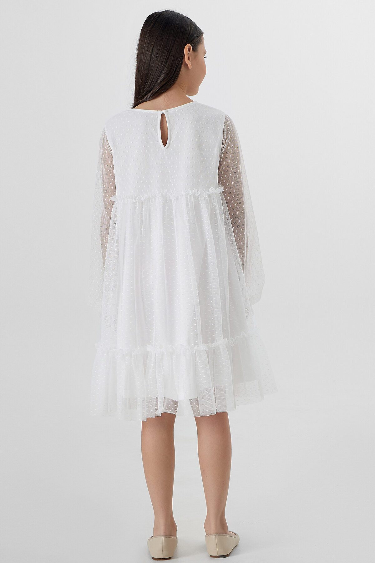 Нарядное платье для девочки из нежной сеточки – идеальный выбор для праздничных мероприятий, утренников и других торжественных случаев. Круглый вырез горловины и длинные рукава придают модели элегантность и утонченность. На спинке находится застежка-пуговица, что добавляет изысканный акцент. Подкладка платья выполнена из нежной хлопковой кулирки, которая обеспечивает комфорт и мягкость на протяжении всего дня. Кулирка – это материал, который дышит, позволяет коже ощущать приятную прохладу и предотвращает раздражение, что особенно важно для детской кожи. Это платье не только красиво, но и функционально, оно подарит вашей малышке ощущение праздника и комфорта. Рекомендуем для создания волшебного и нарядного образа!