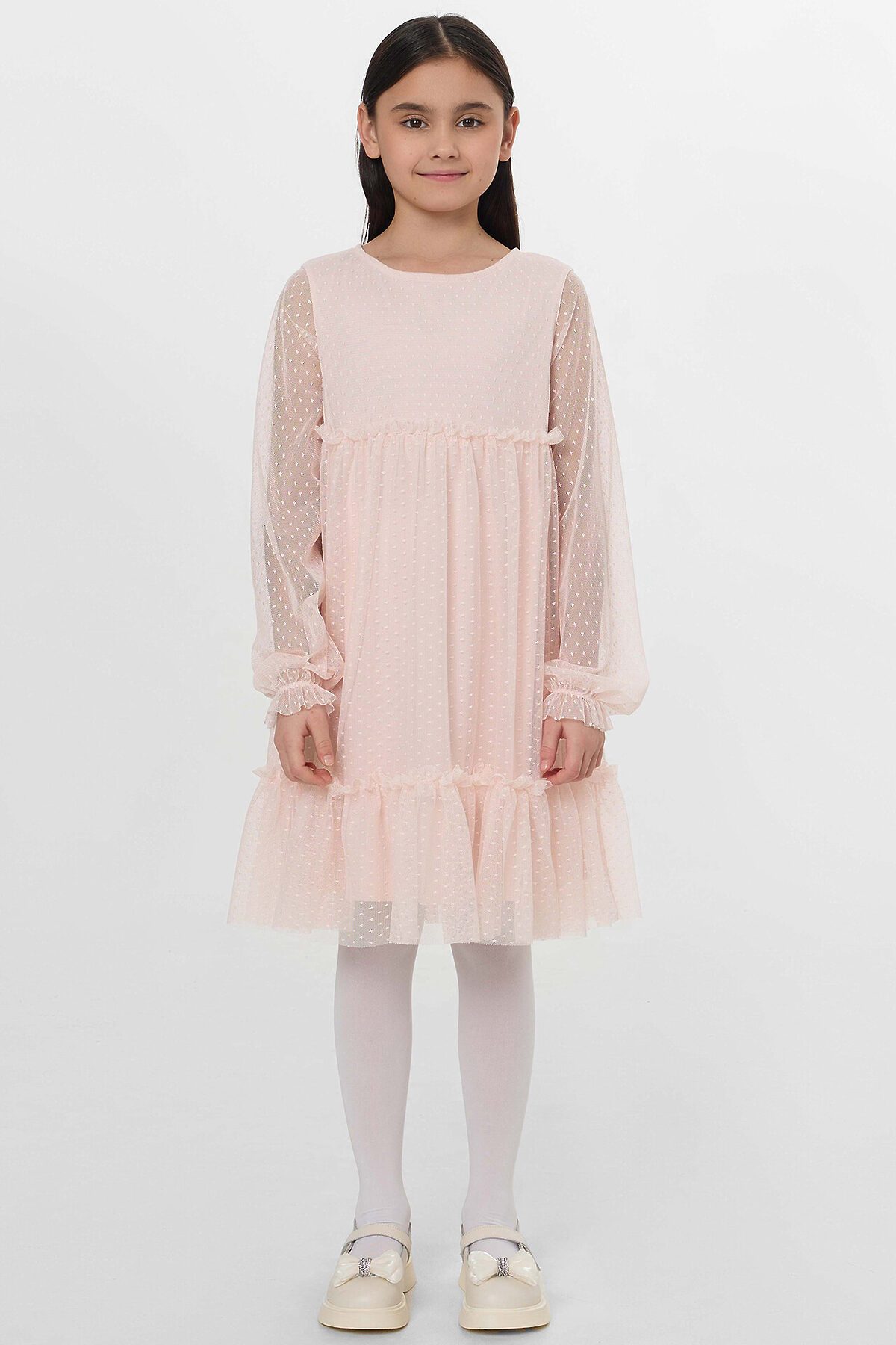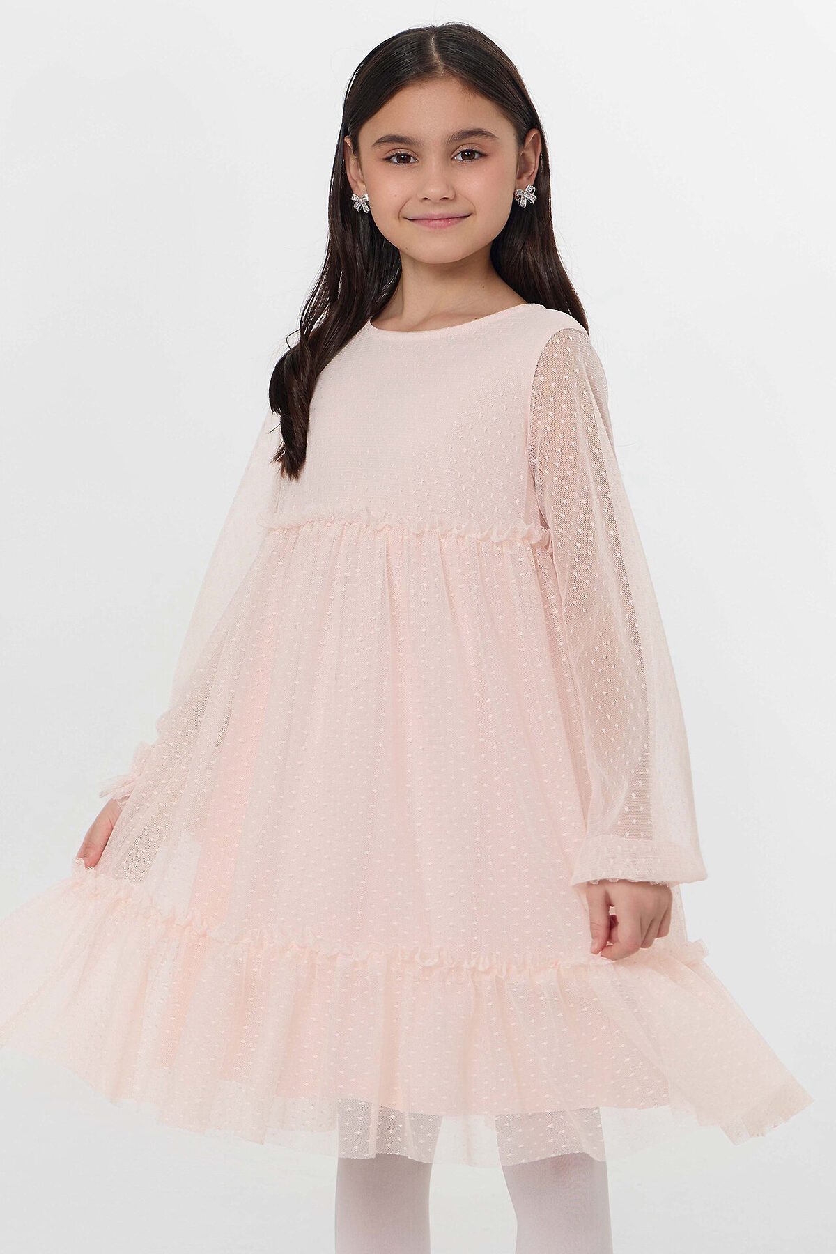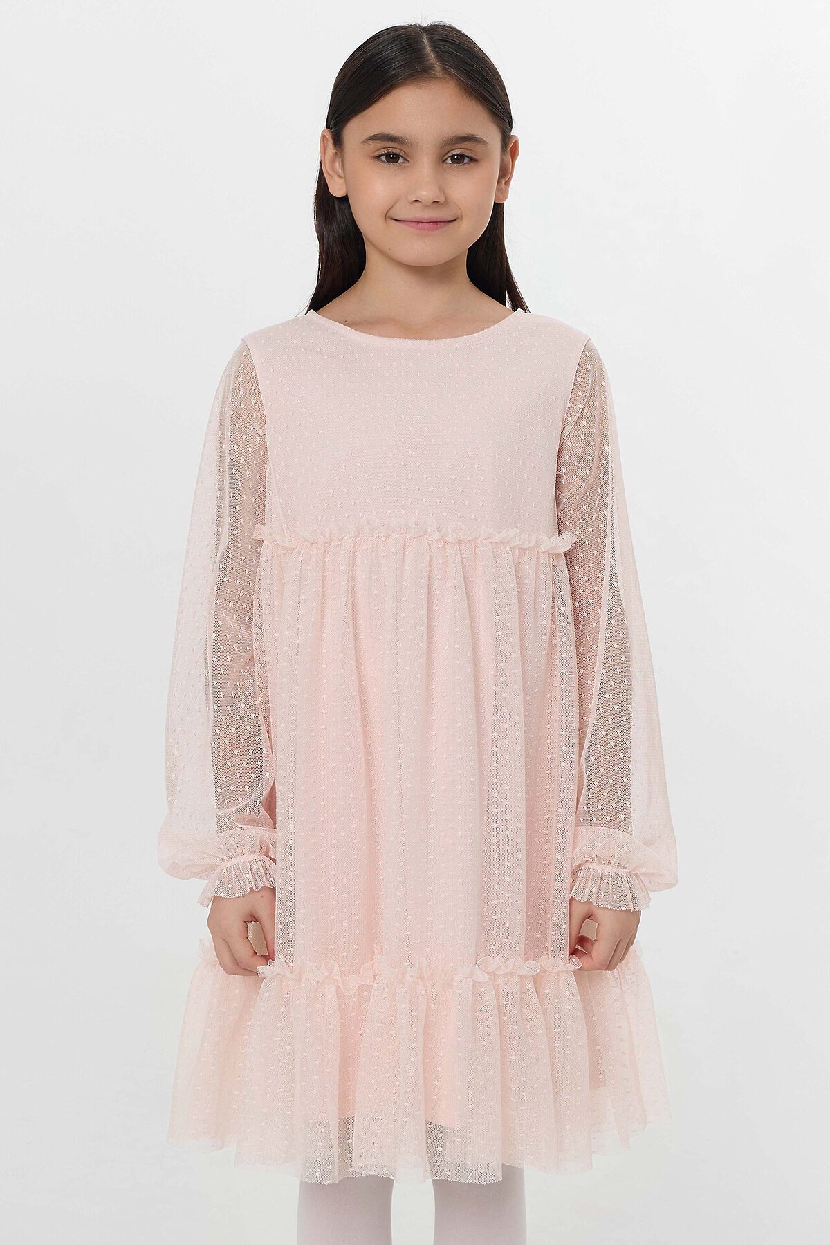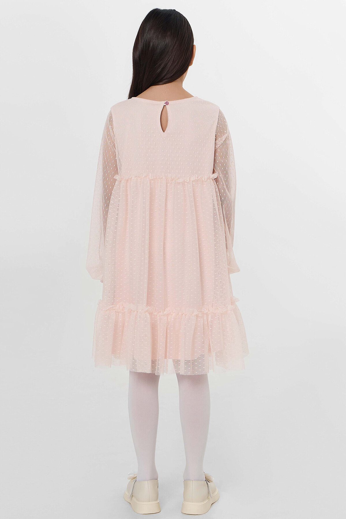 Нарядное платье для девочки из нежной сеточки – идеальный выбор для праздничных мероприятий, утренников и других торжественных случаев. Круглый вырез горловины и длинные рукава придают модели элегантность и утонченность. На спинке находится застежка-пуговица, что добавляет изысканный акцент. Подкладка платья выполнена из нежной хлопковой кулирки, которая обеспечивает комфорт и мягкость на протяжении всего дня. Кулирка – это материал, который дышит, позволяет коже ощущать приятную прохладу и предотвращает раздражение, что особенно важно для детской кожи. Это платье не только красиво, но и функционально, оно подарит вашей малышке ощущение праздника и комфорта. Рекомендуем для создания волшебного и нарядного образа!