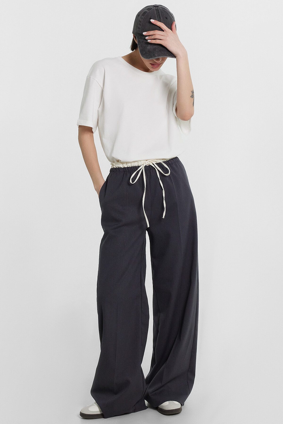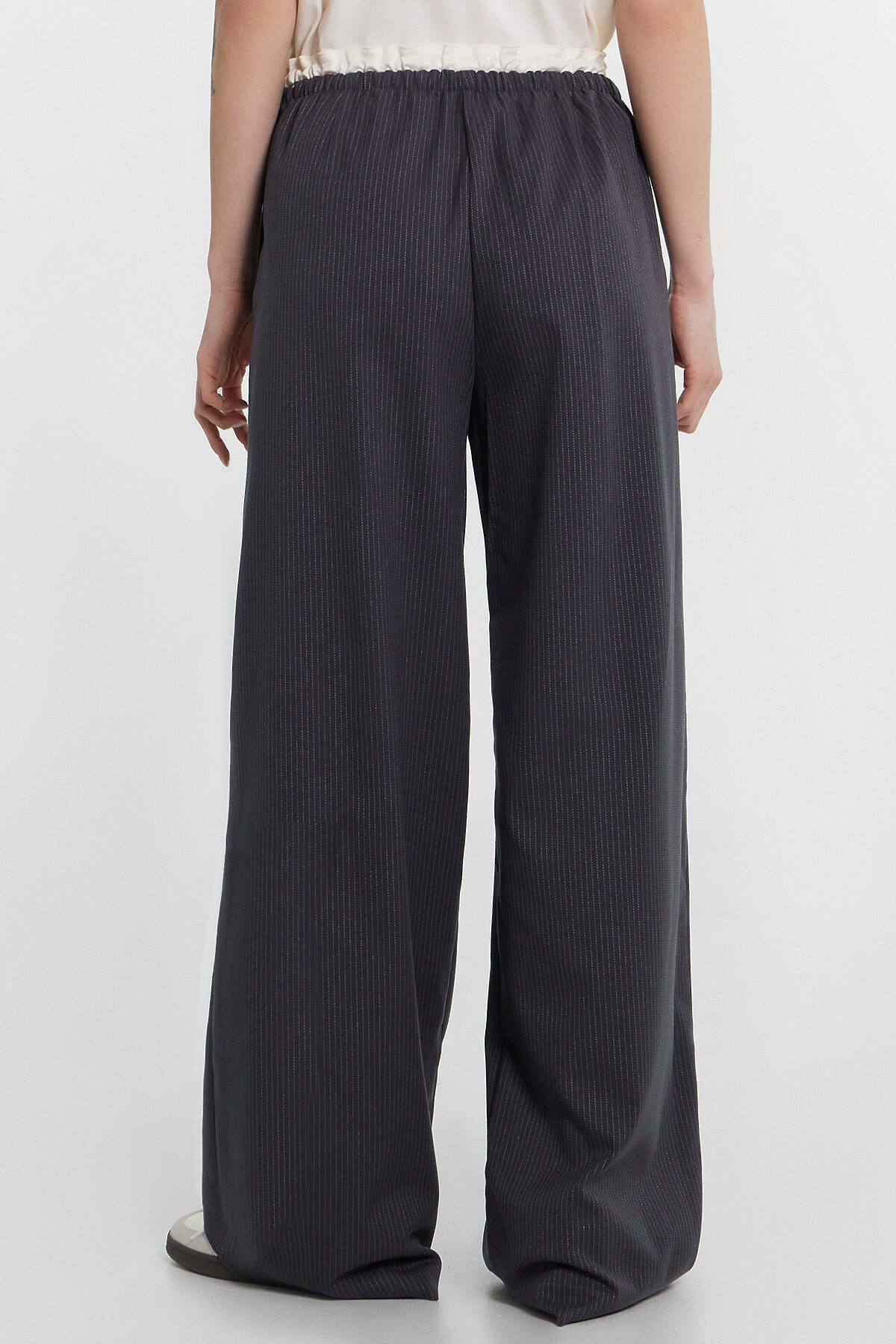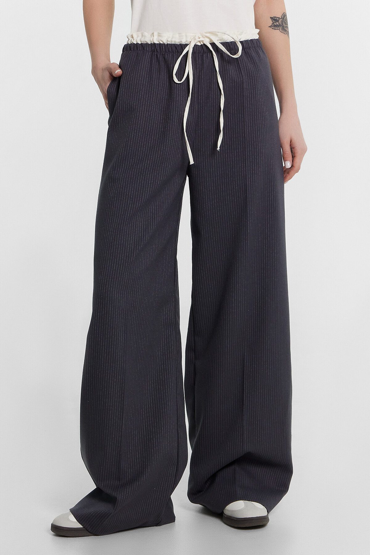 Брюки женские свободного силуэта из ткани. Пояс цельнокроеный с эластичной тесьмой внутри, по верху с отрезной рюшей из сатина. В рюше пробиты петли и вставлен шнур из сатина. Карманы в боковом шве. На задней детали вытачка. На брюках заутюжены стрелки. Брюки полной длины.