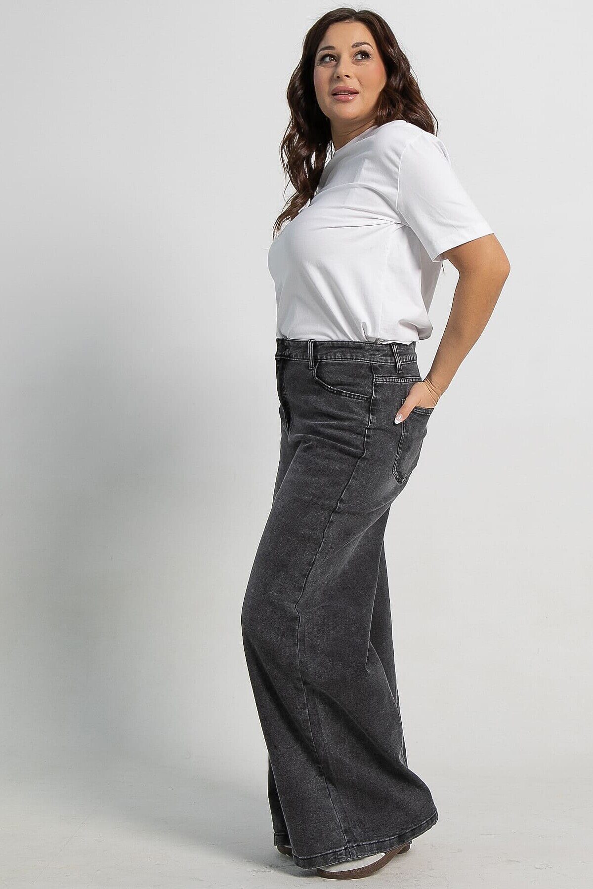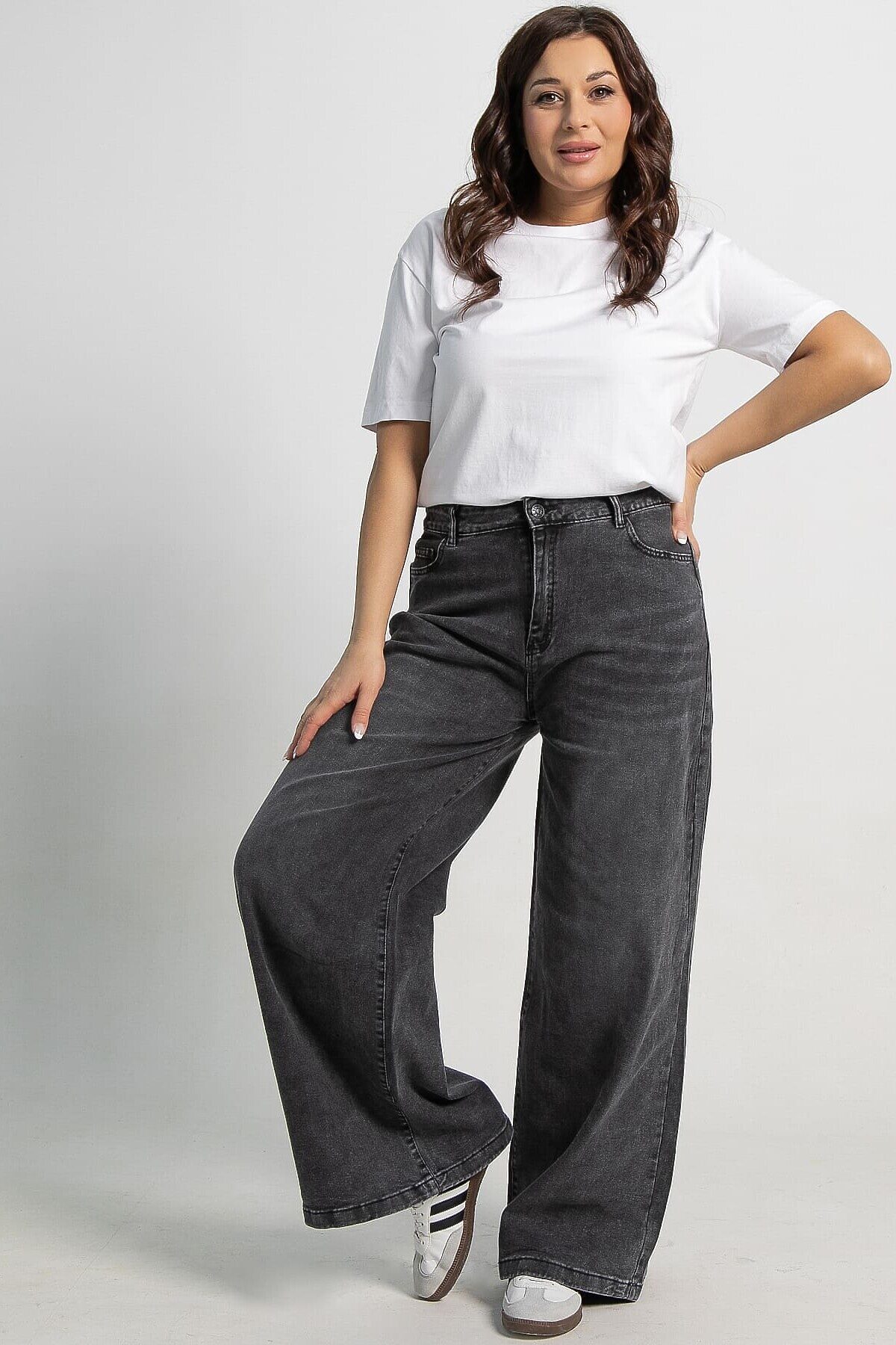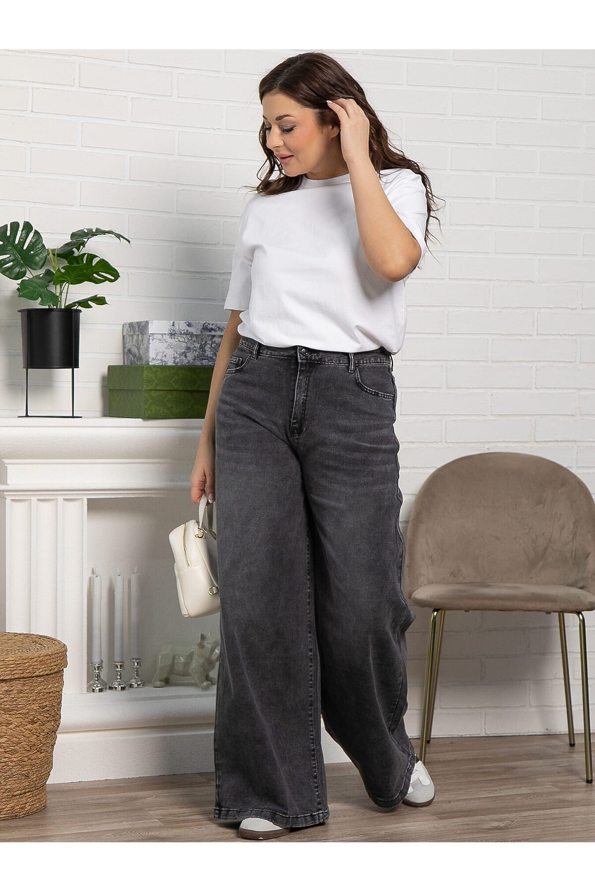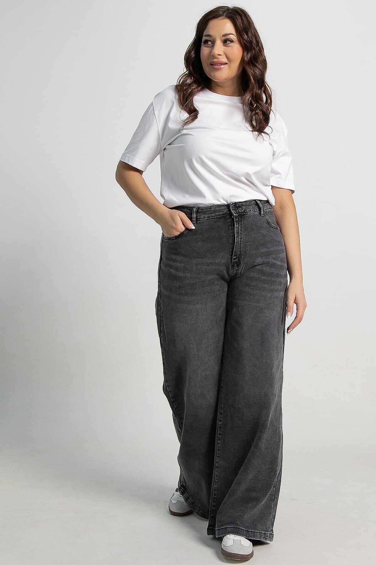 Женские джинсы серого цвета с высокой посадкой — отличный вариант для повседневного гардероба. Модель застегивается на молнию и пуговицу, имеет передние и задние карманы, а также шлёвки для ремня. Свободный крой от бедра обеспечивает комфорт и модный силуэт. Джинсы специально состарены и потерты, что придает им непринужденную привлекательность. Они идеально подходят для создания современных и расслабленных образов.