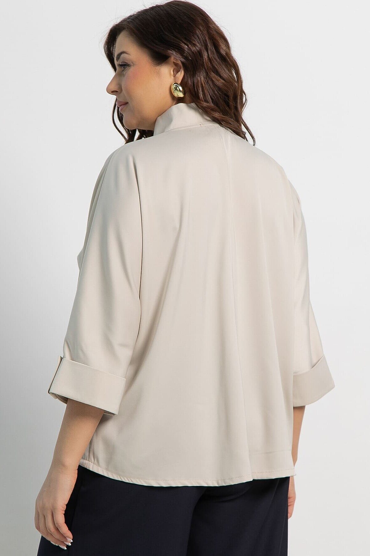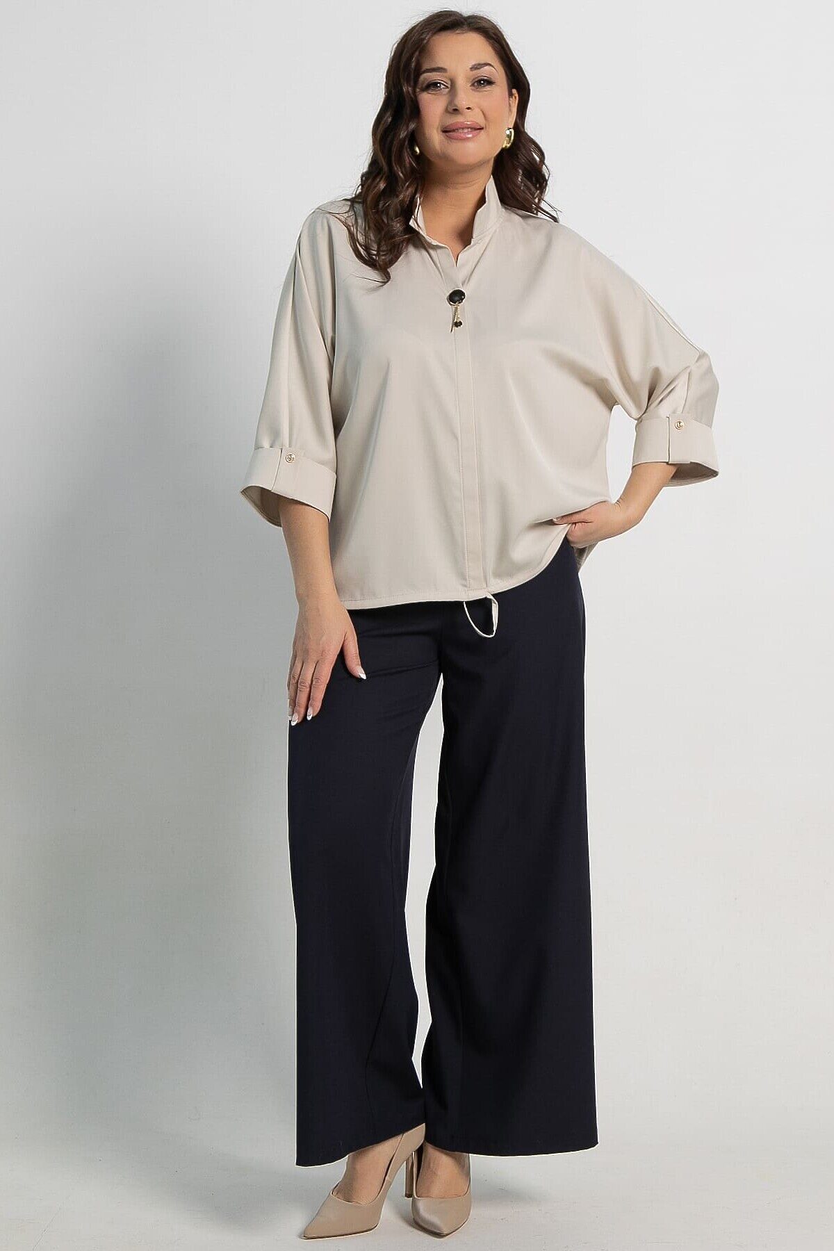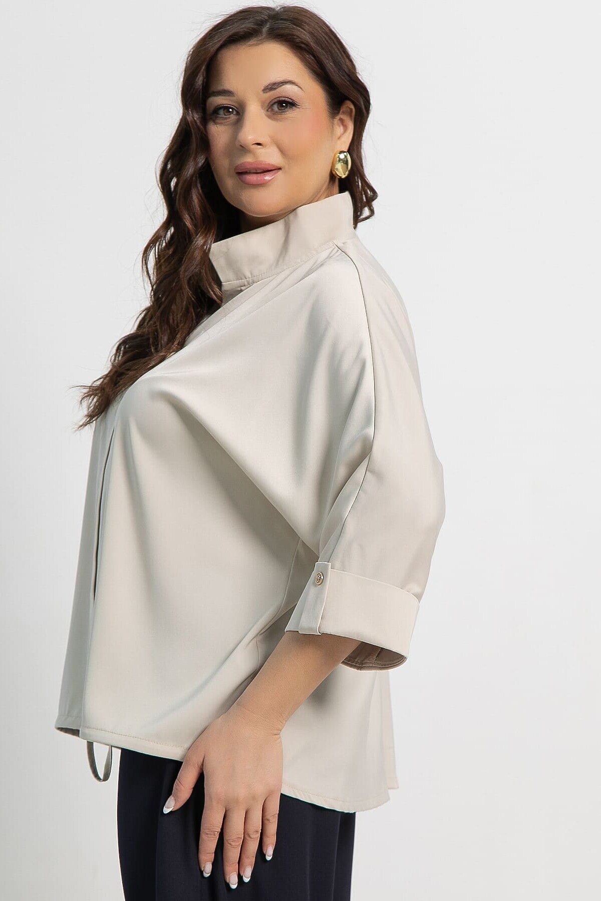 Выразите свою уникальность и добавьте изысканности любому наряду с этой бежевой шелковой блузкой! Рукава длиной 3/4, цельнокроеные и завершающиеся манжетом с пуговицей и патой, придают модели утонченный вид. Воротник-стойка плавно переходит в широкий распашной воротник апаш, создавая современный и элегантный силуэт. Спина немного длиннее переда. По центру передней части проходит планка, а внизу — сборка на шнурке, придающая интересный объем. Эта блузка станет идеальным выбором как для деловых встреч, так и для повседневного образа, добавляя вашему стилю нотку роскоши и утонченности.