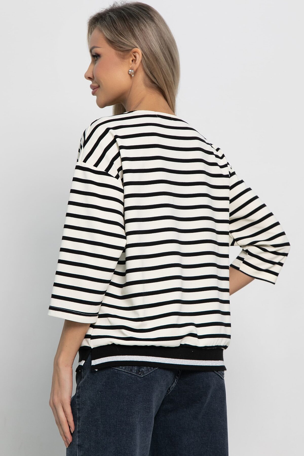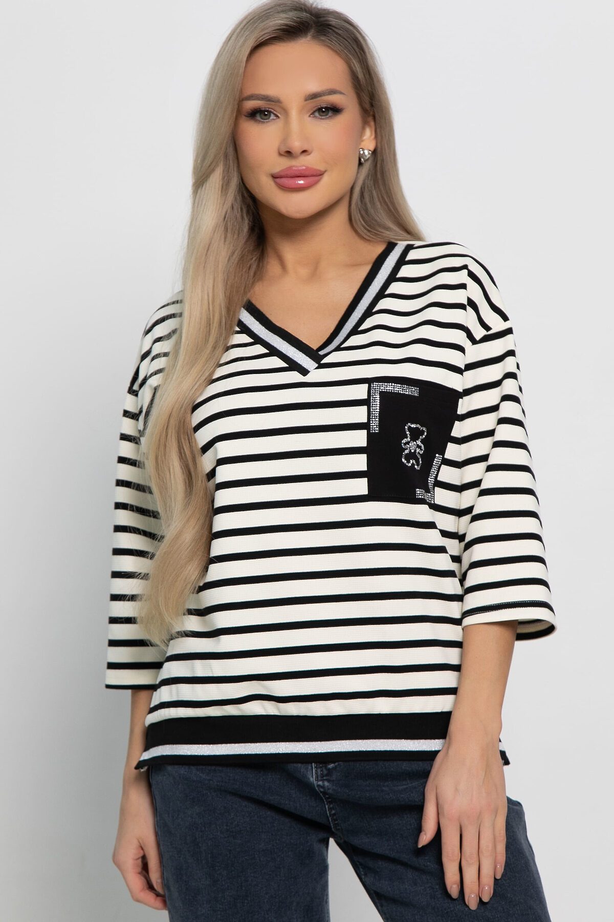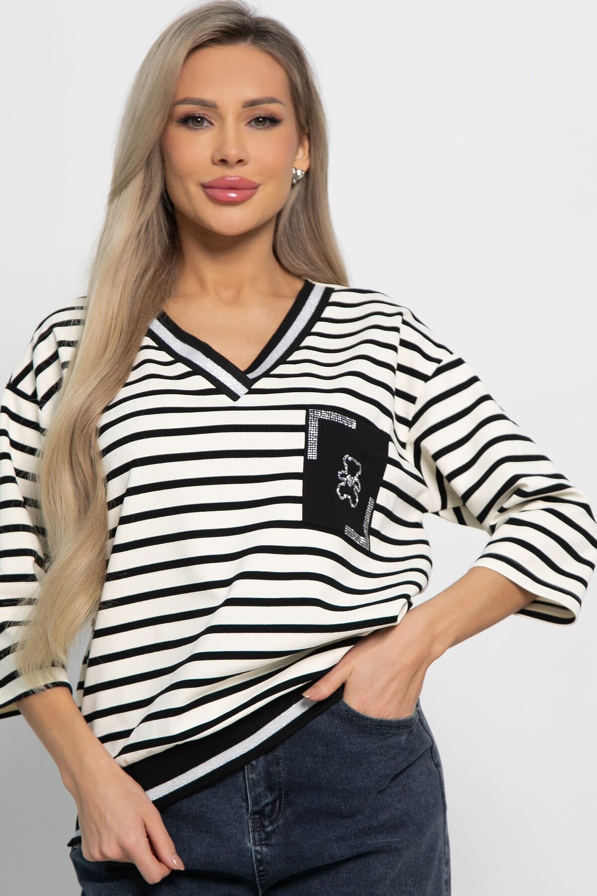 Бежево-черная блузка с V-образным вырезом и рукавами три четверти обеспечивает комфорт и изящество. На передней части расположен декоративный карман с аппликацией из страз, добавляющей оригинальности и шарма. Горловина и низ украшены широкой резинкой в тон основной ткани. Эта модель прекрасно впишется в повседневный гардероб.