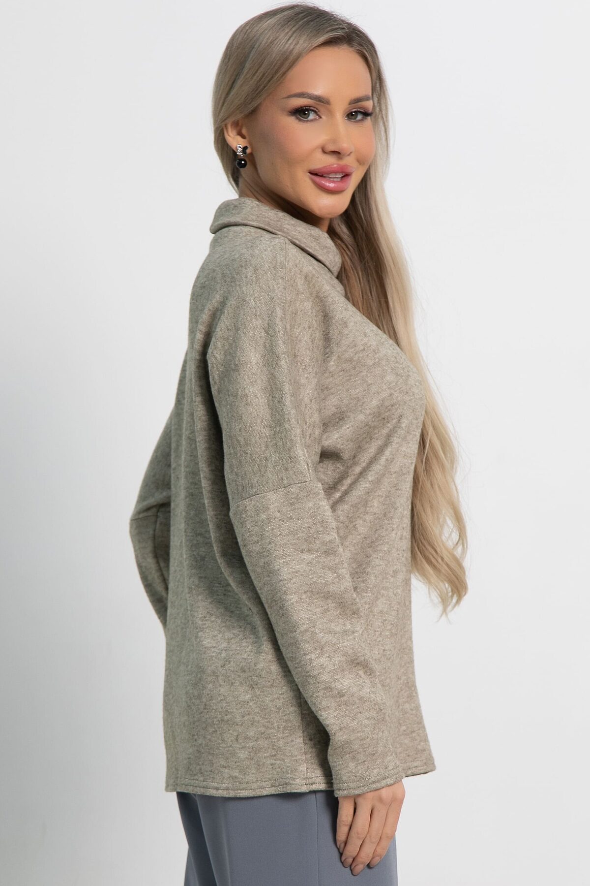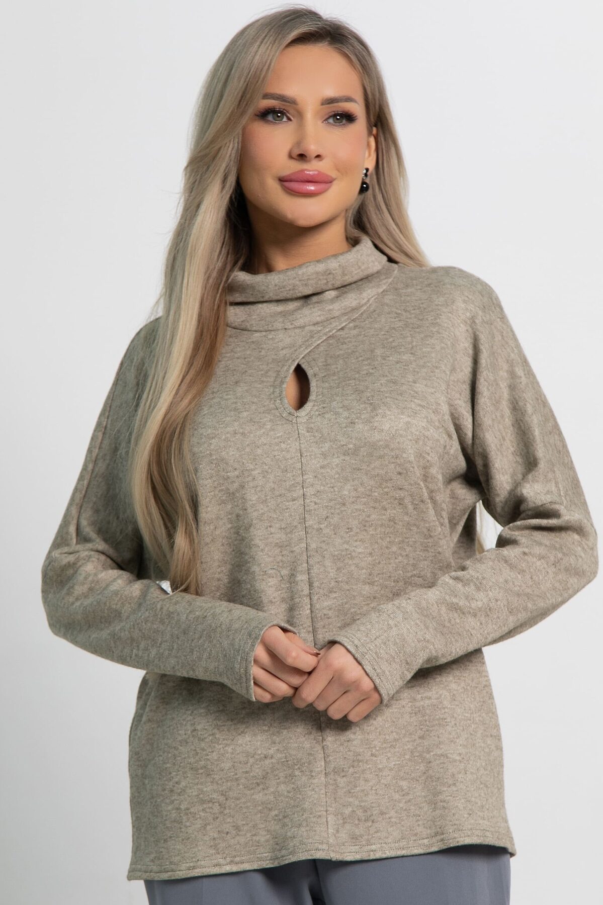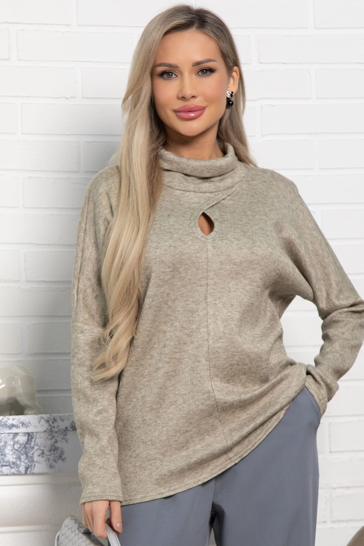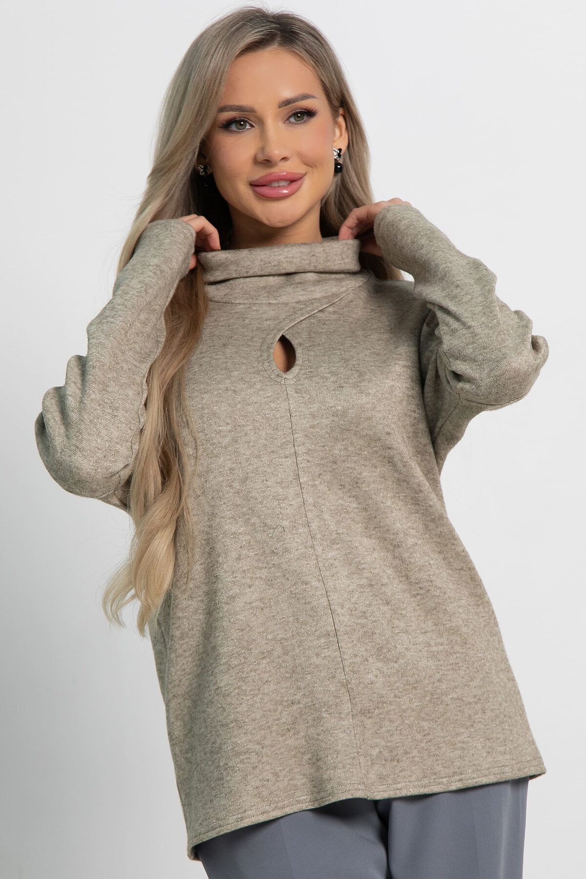 Разнообразьте свой гардероб стильным джемпером, который станет универсальным элементом вашего образа. Изготовленная из мягкого вязаного трикотажа, она обеспечит вам комфорт на протяжении всего дня. Джемпер имеет спущенные рукава и горловину в форме хомута. Каплевидный вырез привлекает внимание, придавая образу изысканности. Эта модель станет основой для создания разнообразных стильных образов. Она идеально подходит для прохладных вечеров и осенних прогулок, и непременно займёт почётное место в вашем гардеробе.