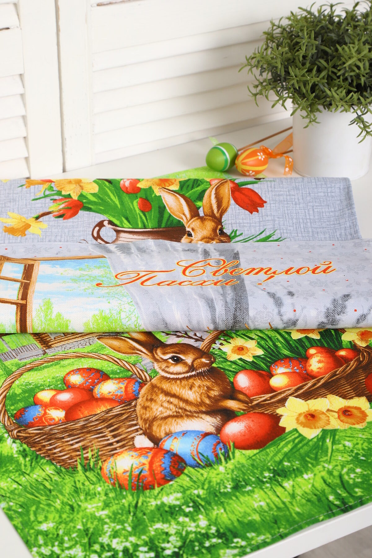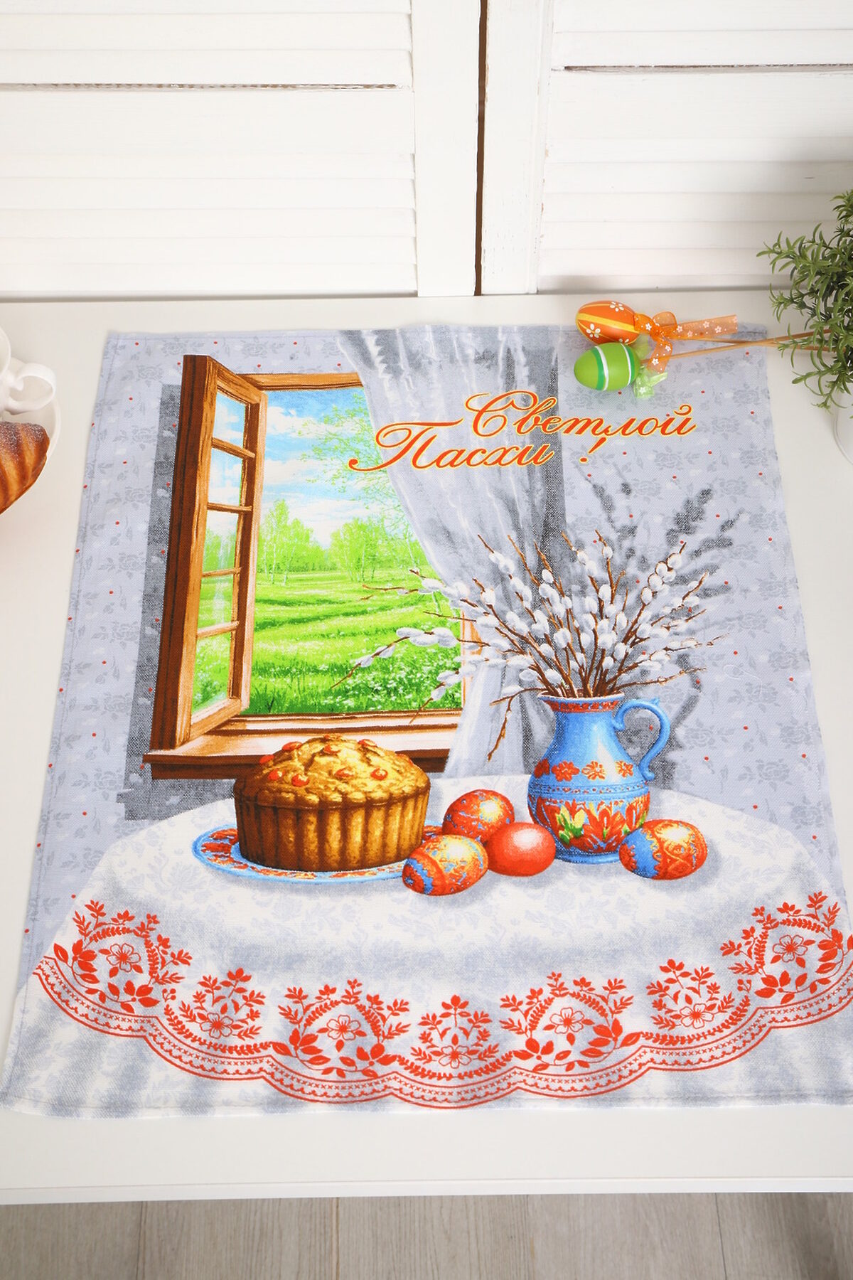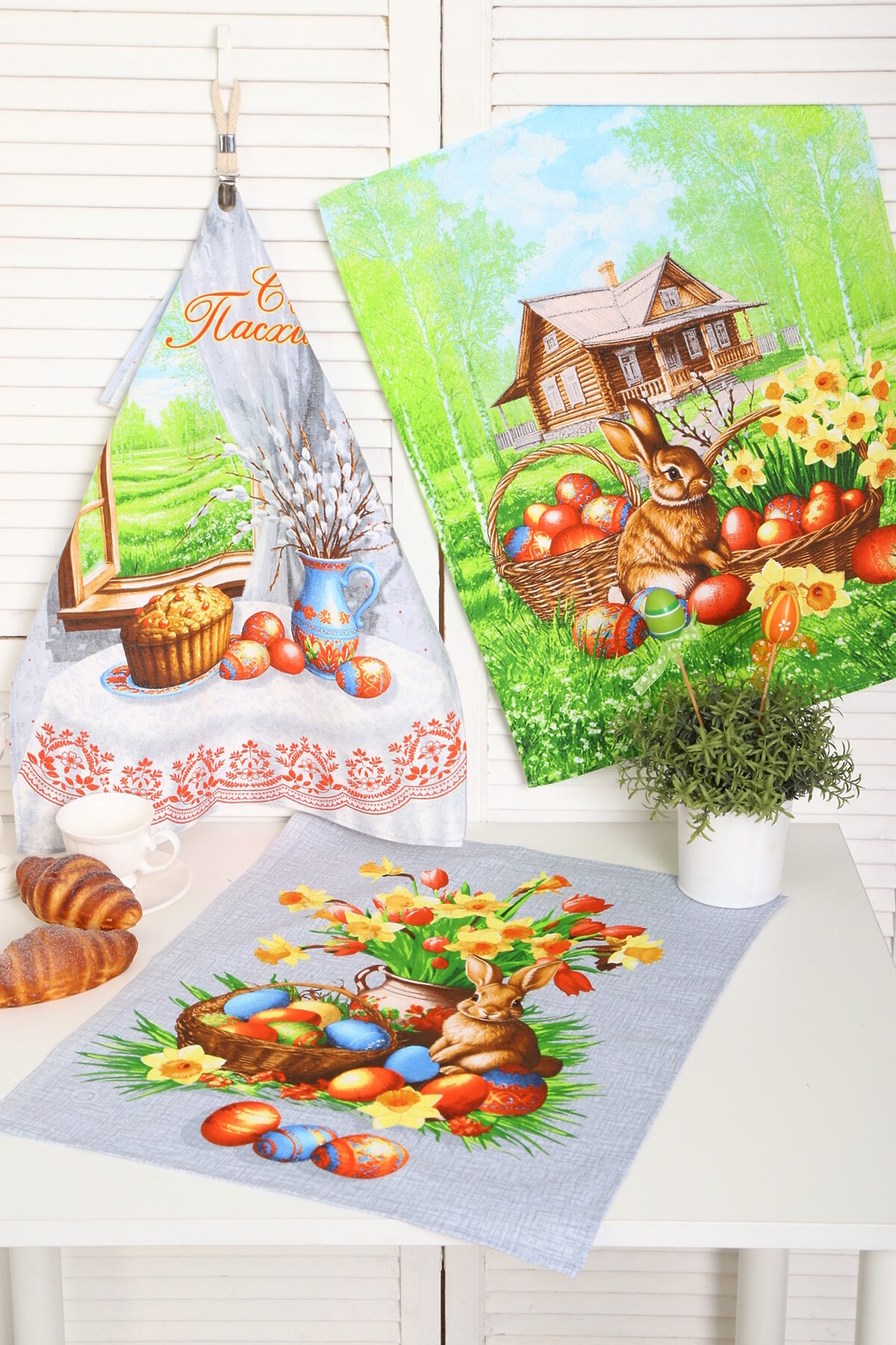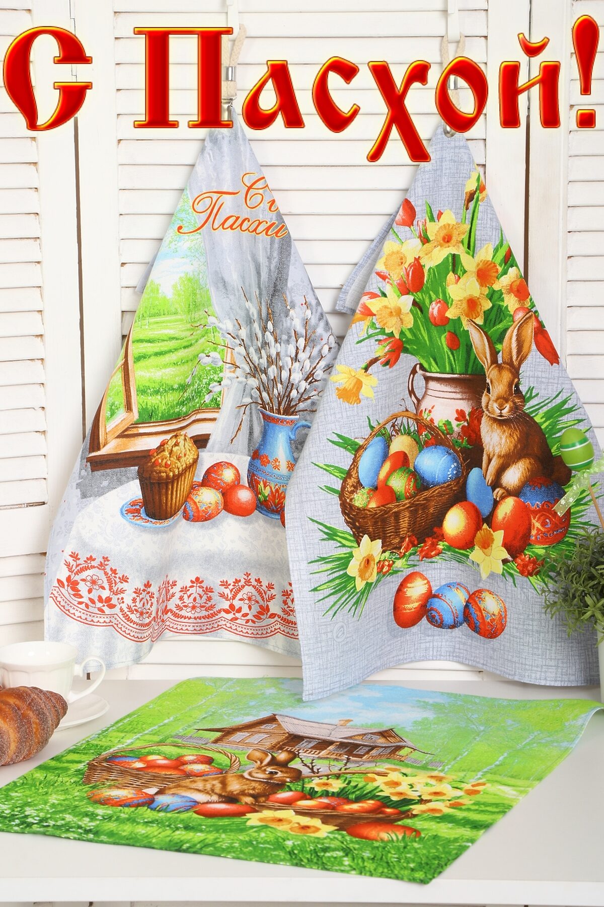 Набор из трех кухонных полотенец размером 60*48 см. Выполнены из прочного хлопчатобумажного полотна - рогожка. Отлично впитывают влагу, сохраняют цвет и форму после стирки. Каждое полотенце с индивидуальным рисунком, посвященным светлому празднику Пасхи Христовой. Порадуйте себя и своих близких приятным подарком на праздник!