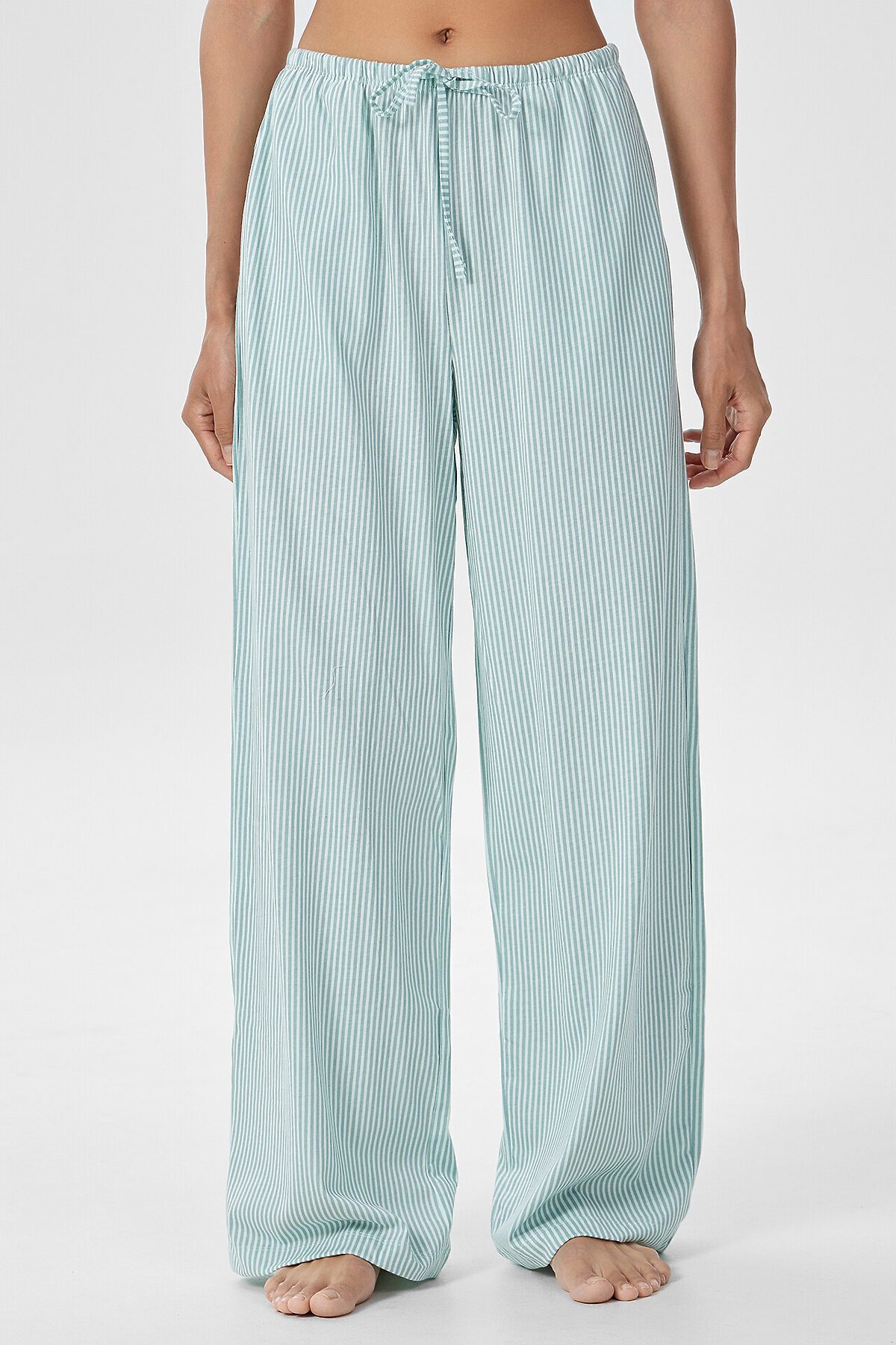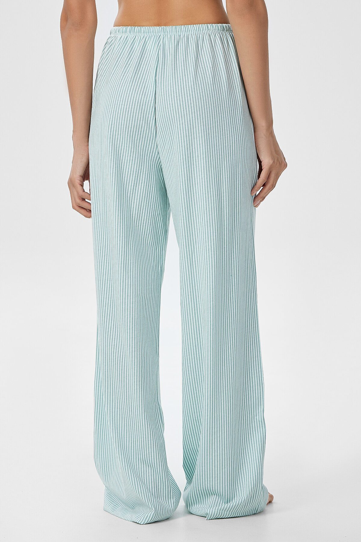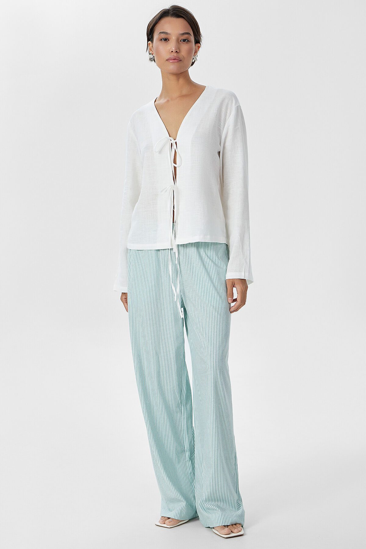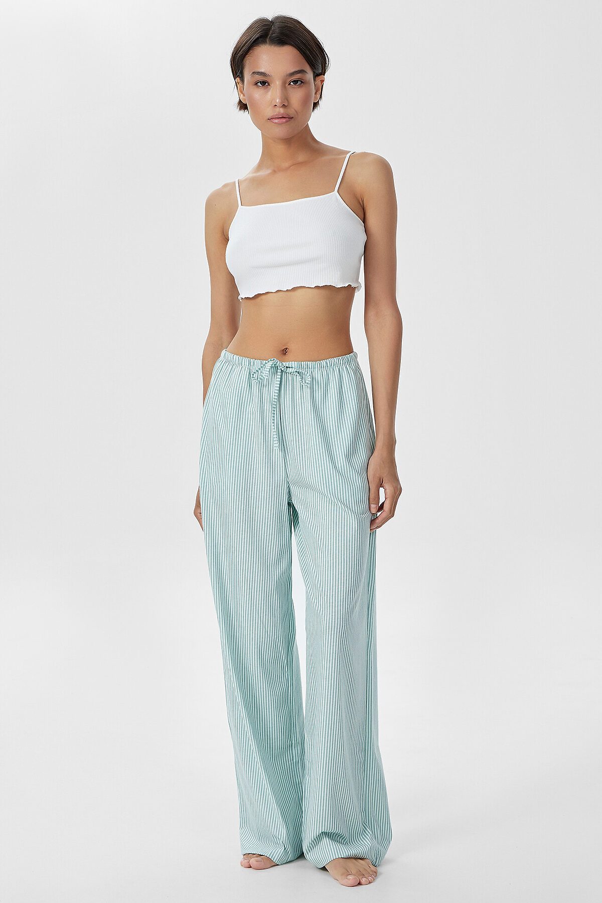 Брюки с посадкой на талии свободного силуэта. Пояс цельнокроеный с резиной внутри 20RV. По центру пояса пробиты петли, протянута бейка из основного полотна. На передних деталях карманы «хулиганы». Низ изделия застрочен швом в подгибку.