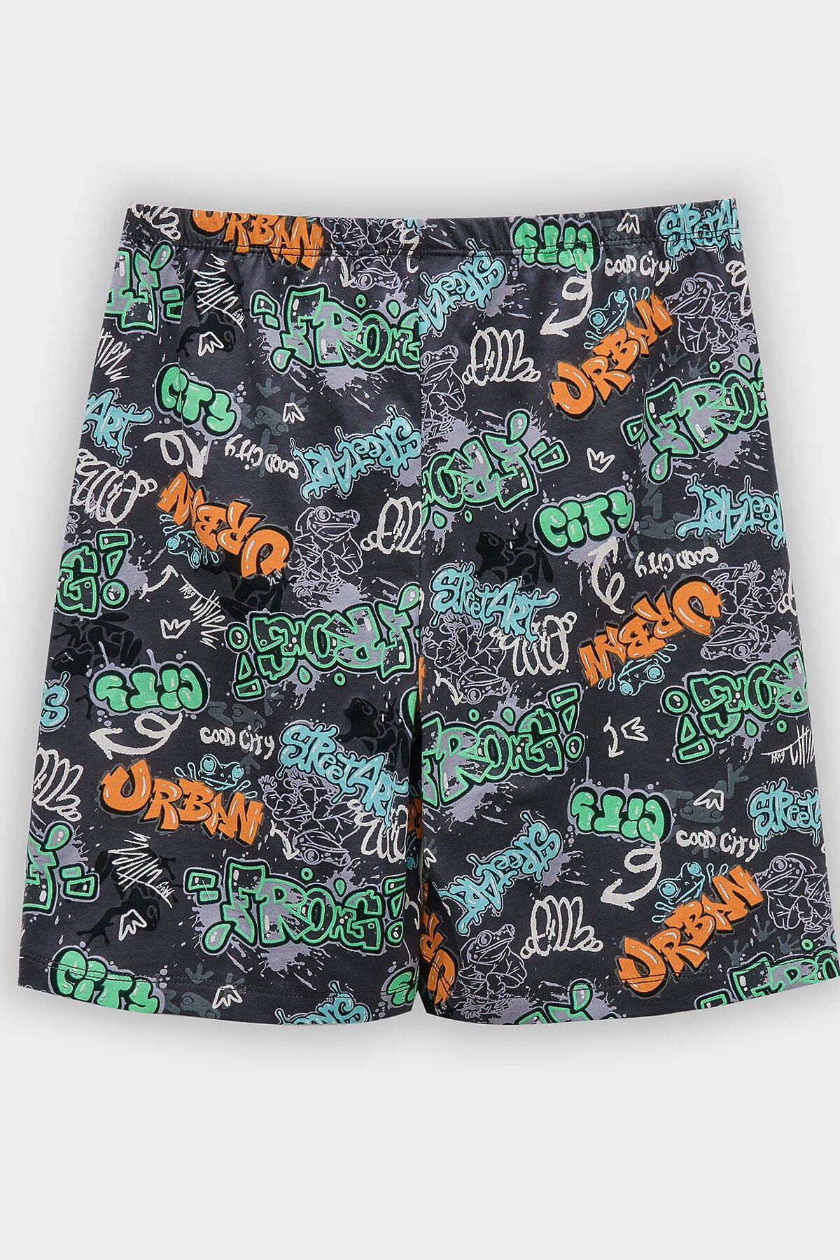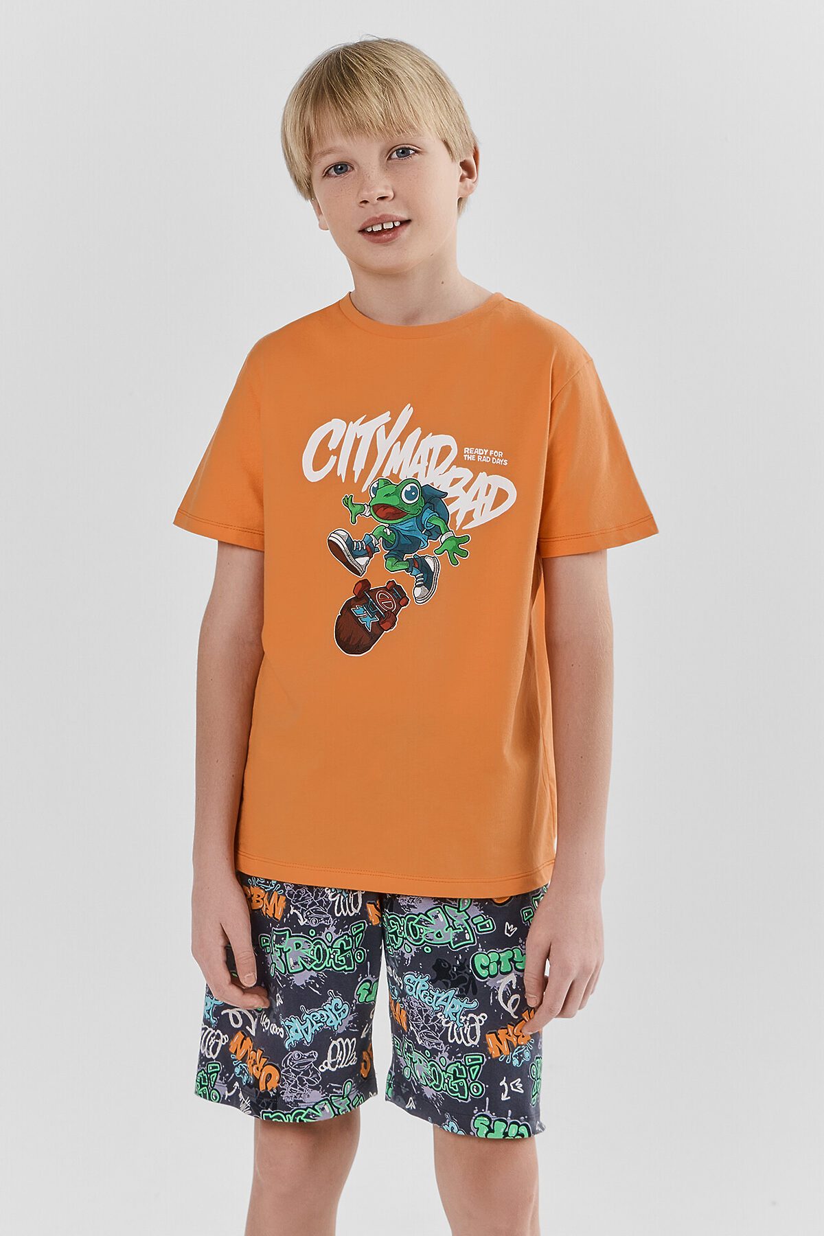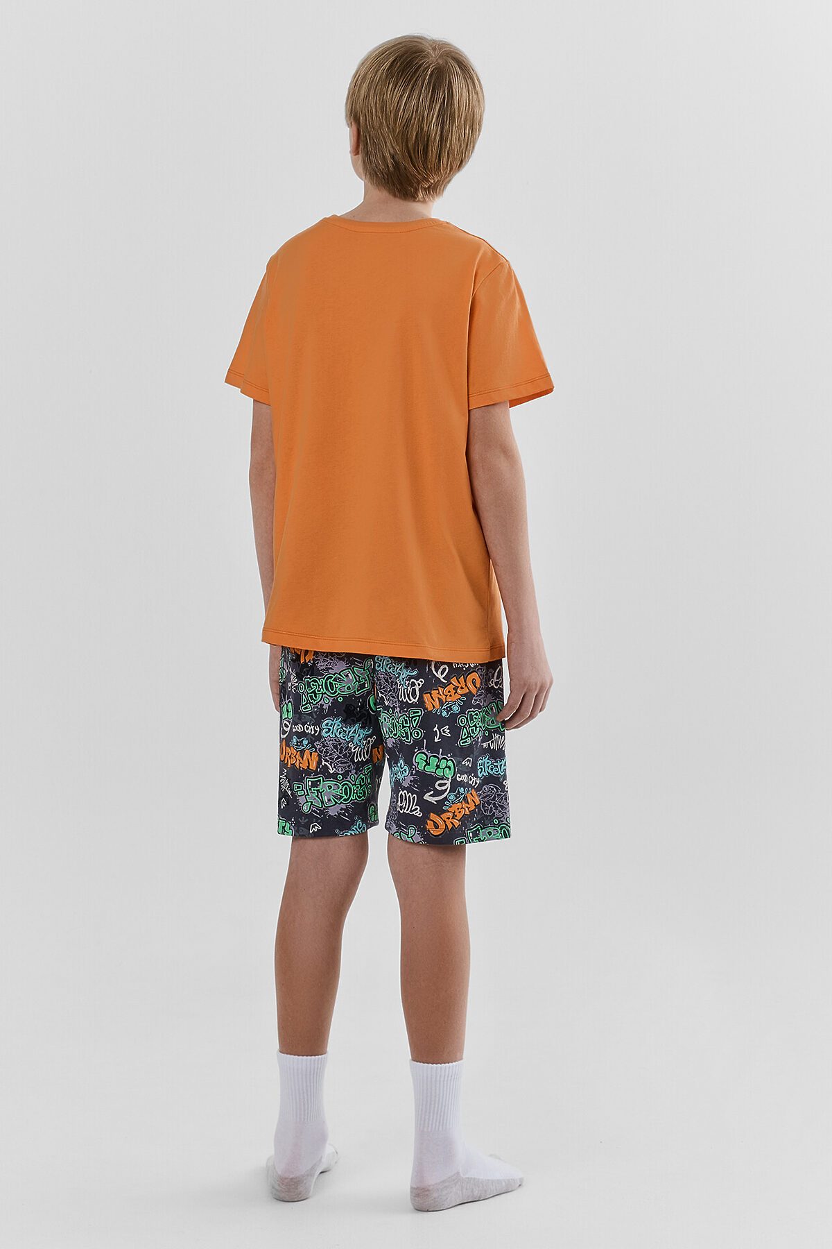 Пижама для мальчиков. Выполнена из хлопкового трикотажа кулирного переплетения. Комплект включает футболку и шорты. Футболка свободная, с круглой горловиной и короткими рукавами. Шорты длиной до колен, с эластичной тесьмой в поясе. Отличный комплект для сна и отдыха!