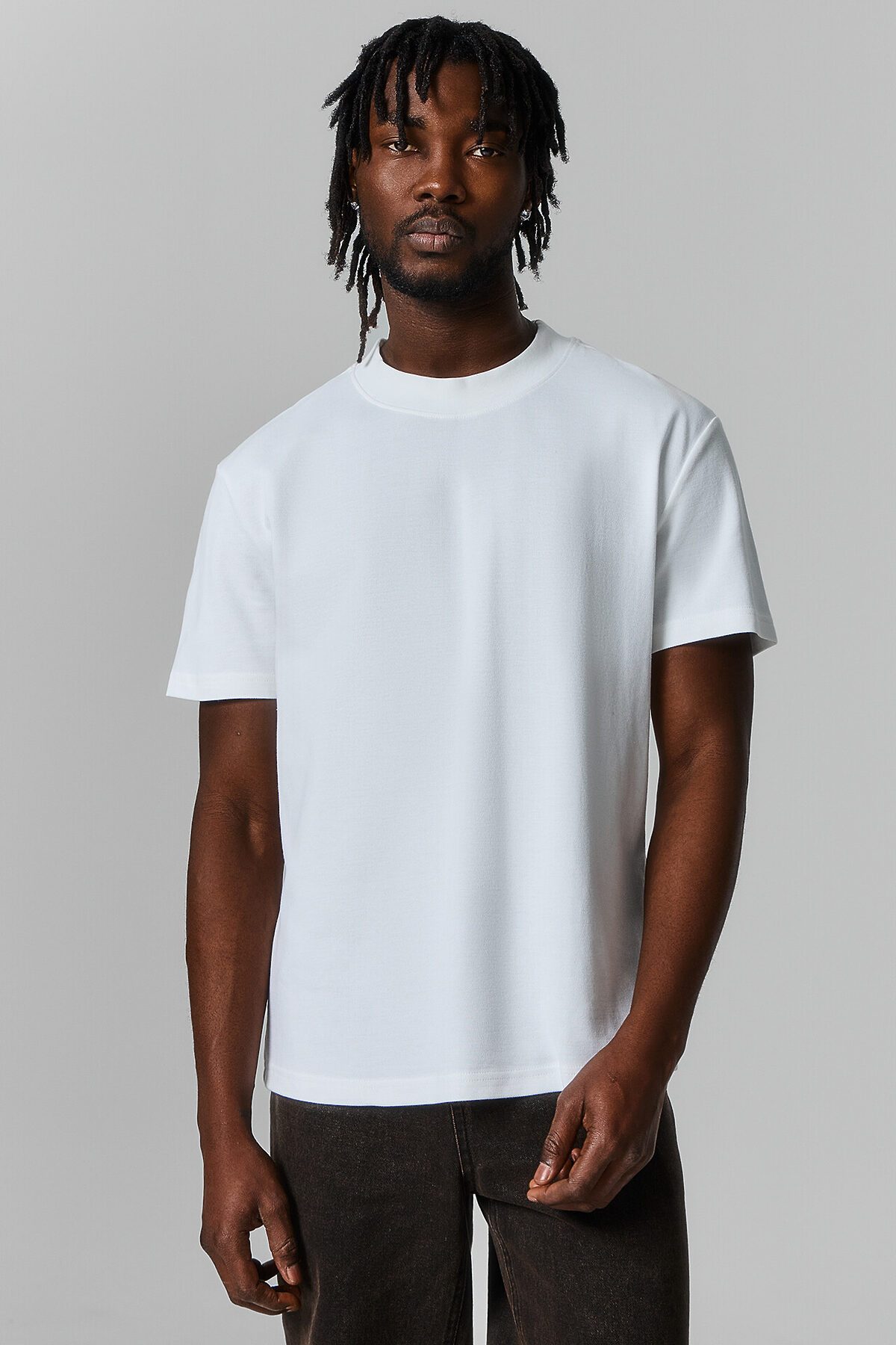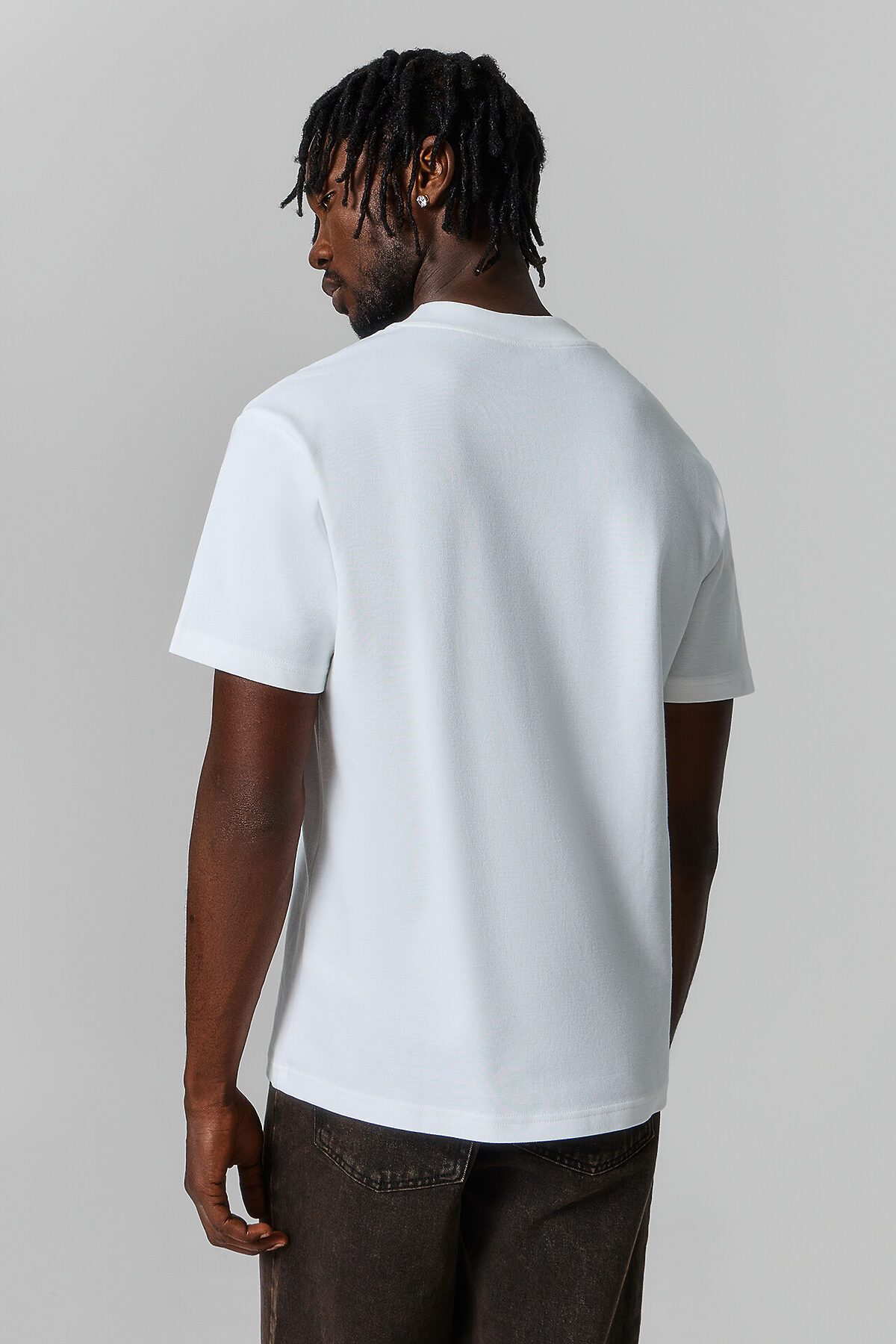 Футболка свободного силуэта. Рукава короткие втачные. Горловина округлой формы из трикотажного полотна рибана, по спинке закрыта бейкой из основного полотна . Нижний срез футболки и рукавов обработан швом в подгибку на 2х игольной плоскошовной машине.