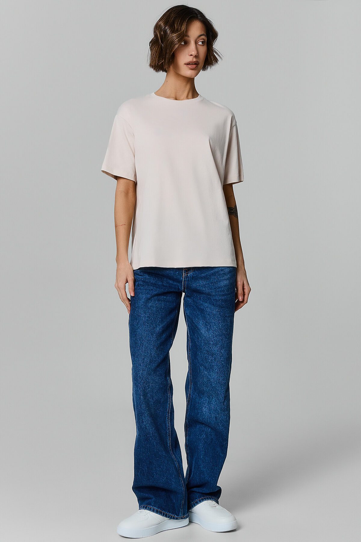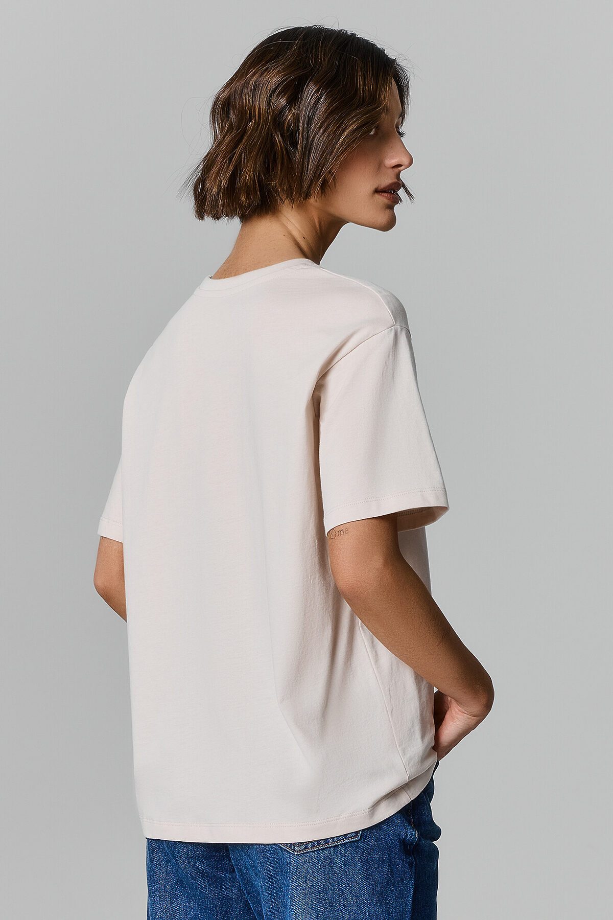 Хлопковая футболка свободного силуэта из трикотажной кулирки. Вырез круглой формы. Свободу движений гарантируют спущенная линия плеча и углубленная пройма. Рукава широкие, чуть выше локтя. Стильная модель!