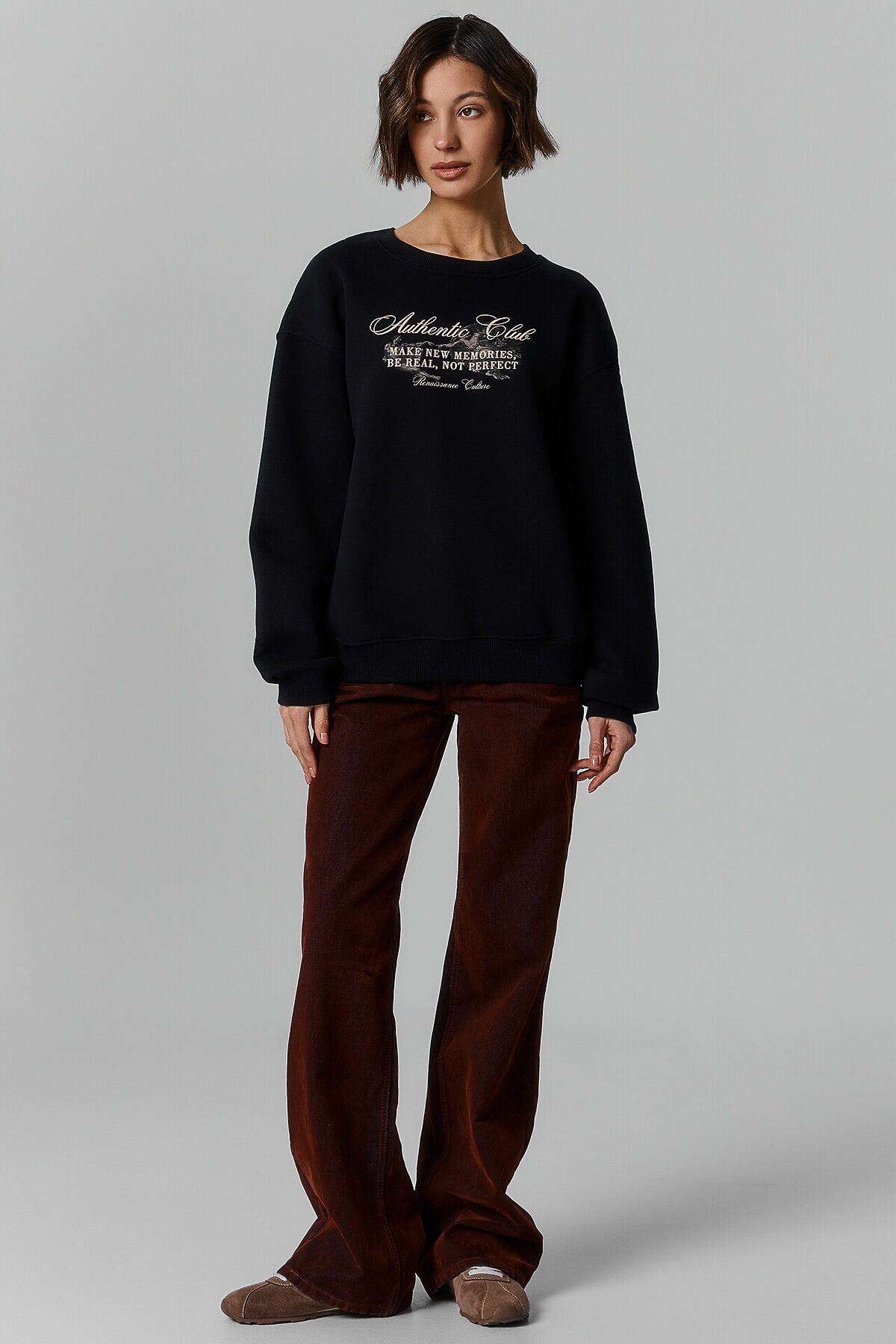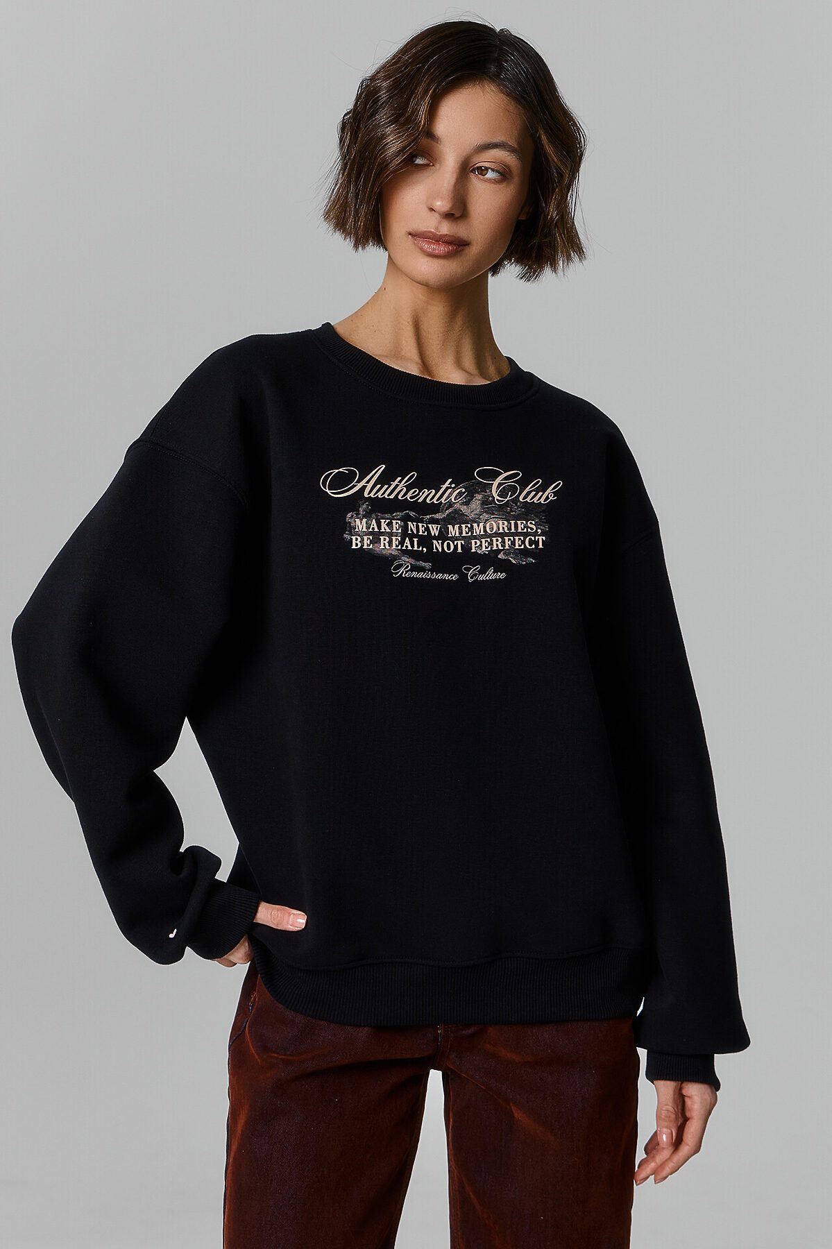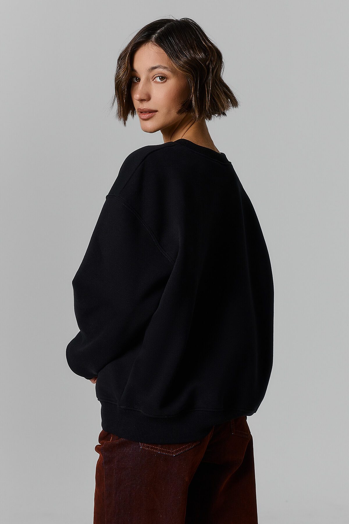 BASIC+ Свитшот женский свободного силуэта. Перед и спинка цельнокроеные. Рукав длинный, спущенный. Горловина обработана обтачкой из рибаны. Манжеты и пояс из рибаны. Навесной ярлык BASIC+ по заданию