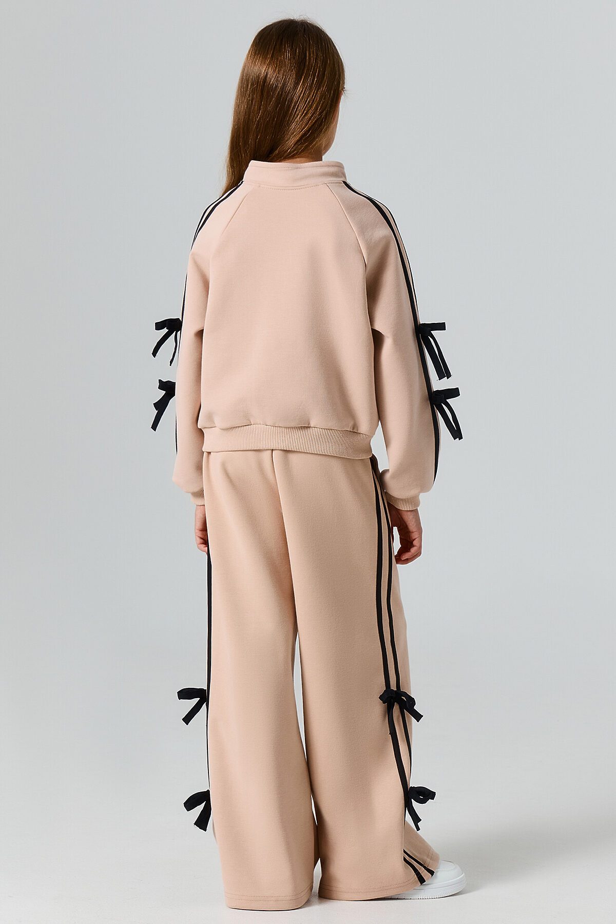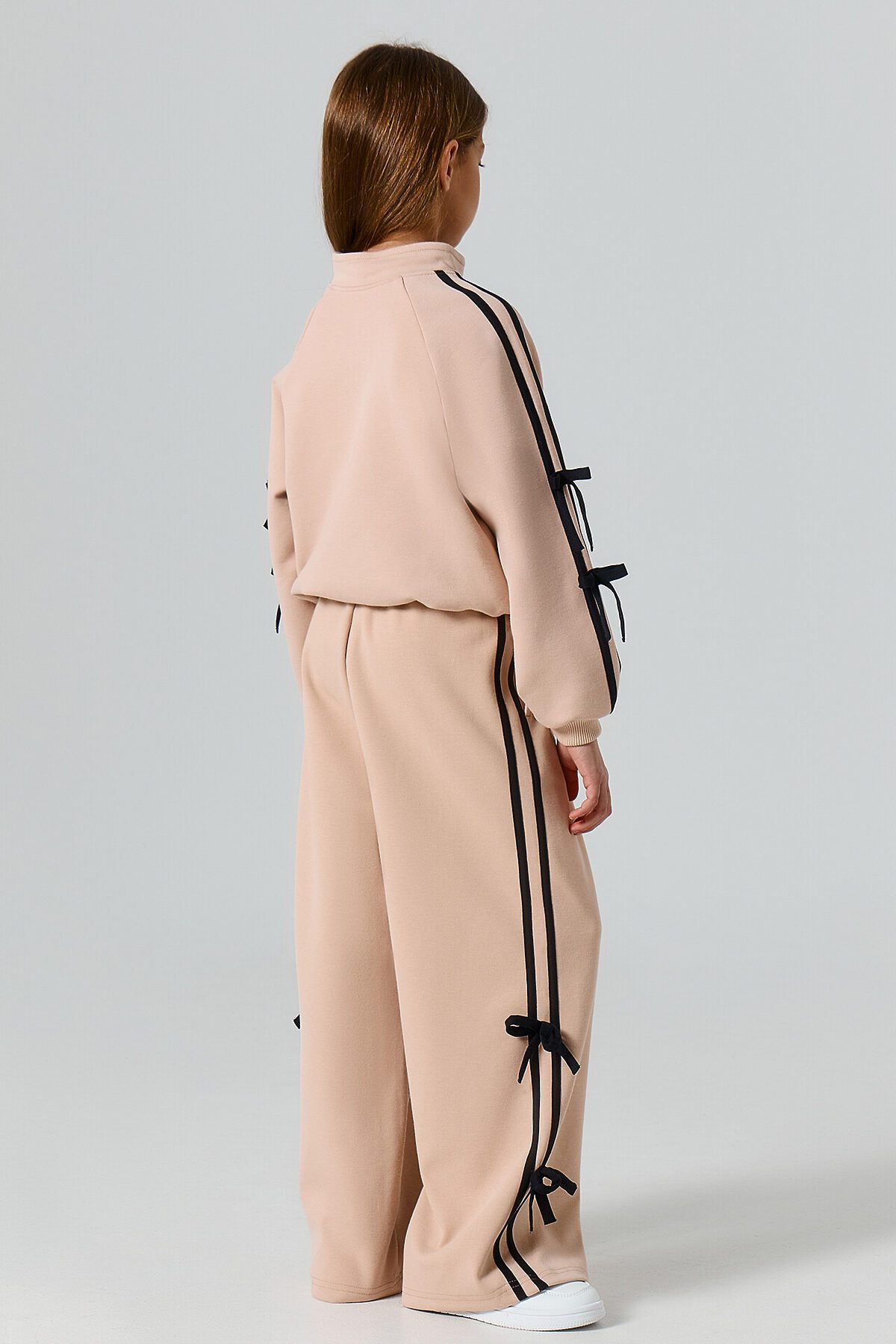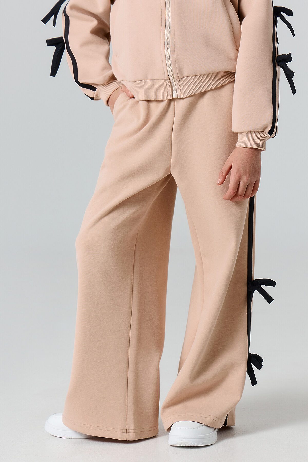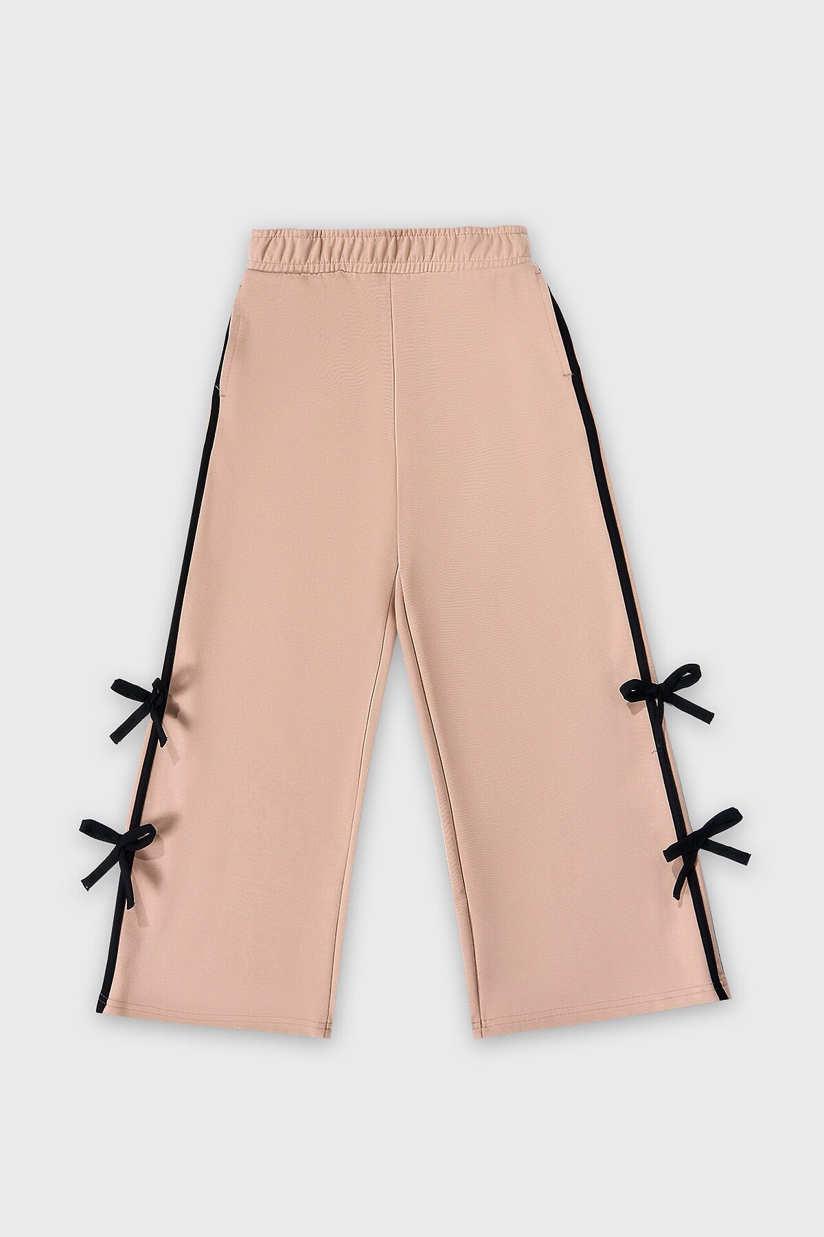 Брюки свободного силуэта с высокой посадкой. Пояс цельнокроенный с эластичной тесьмой внутри 40/50RV (по размерам). По поясу сделаны 2 отделочные строчки. По боковому шву брюк настрочены лампасы и бантики из кулирки. Карманы в боковых швах, подкладка кармана из трикотажного кулирного полотна. Низ брюк обработан швом вподгибку.