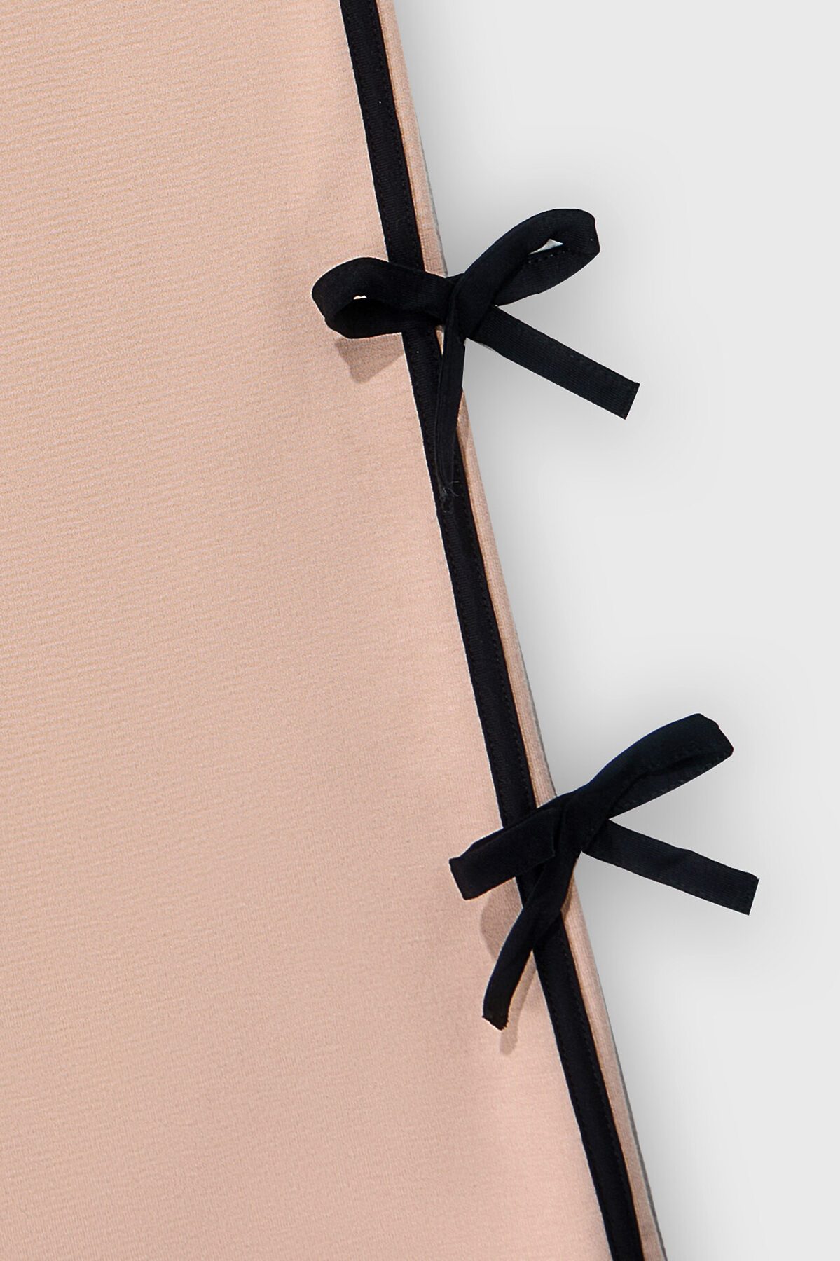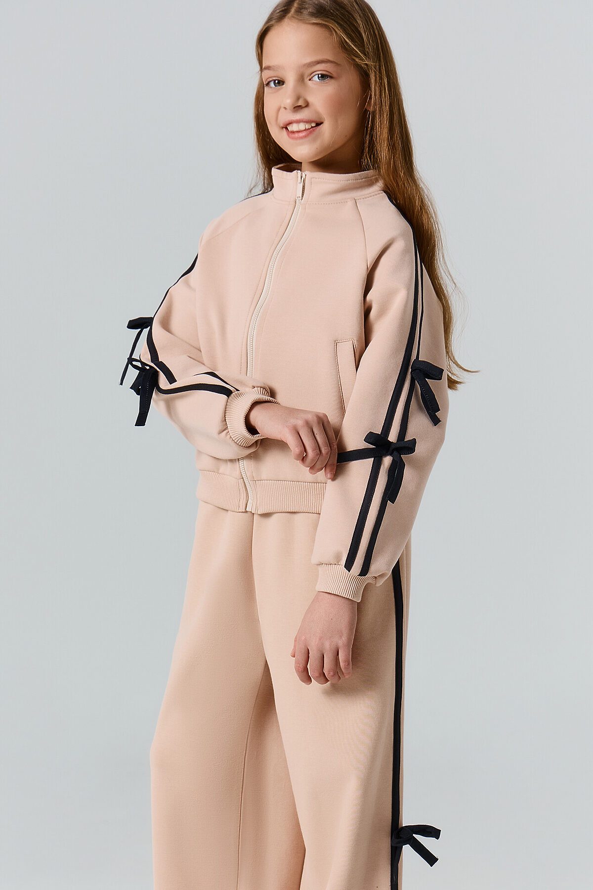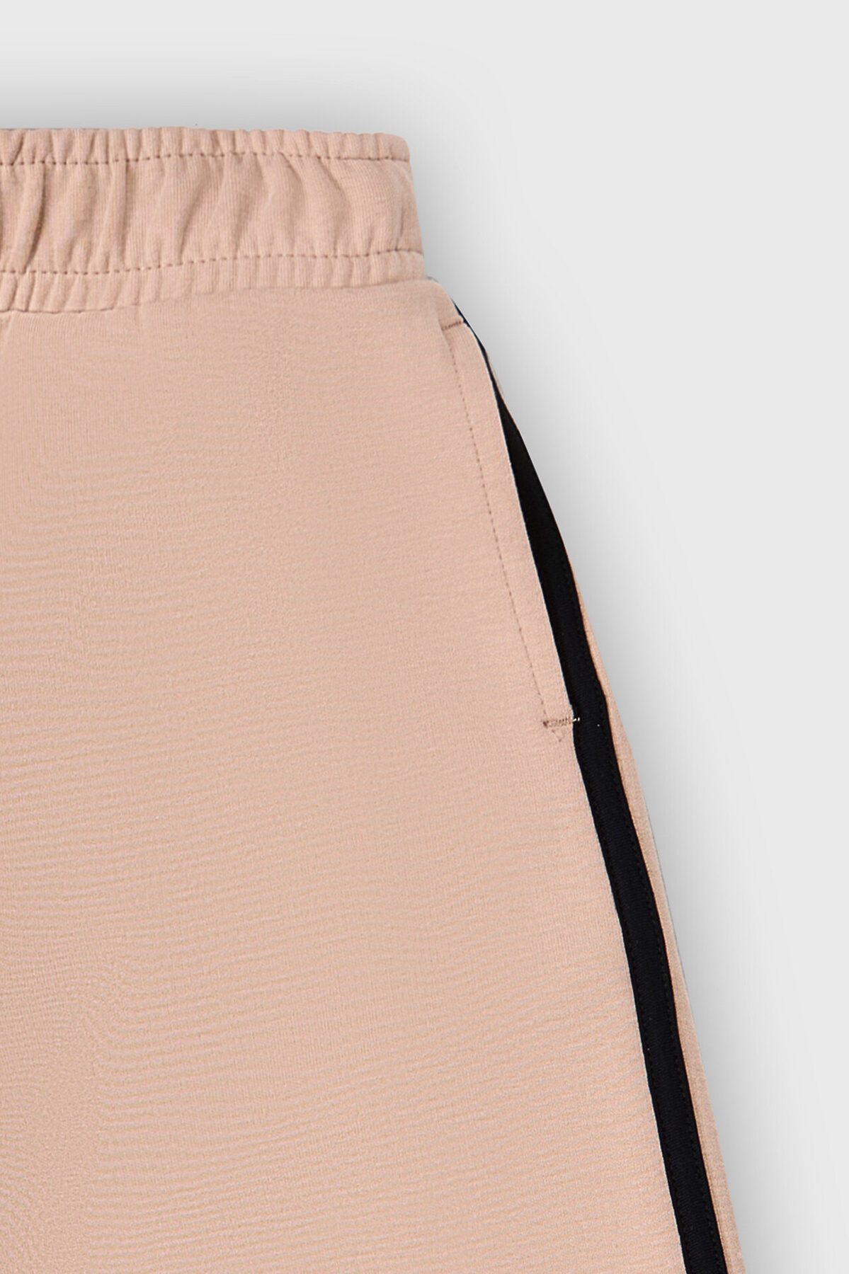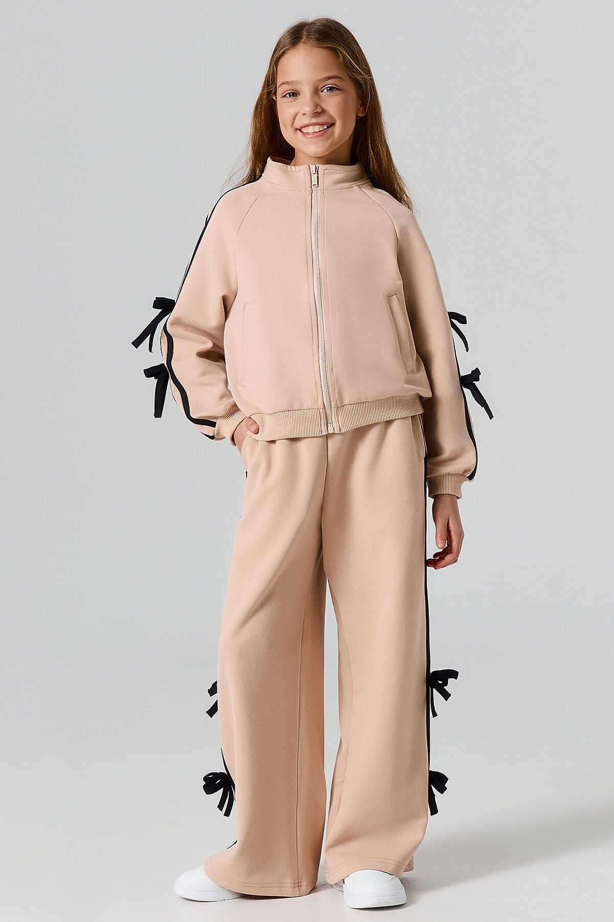 Брюки свободного силуэта с высокой посадкой. Пояс цельнокроенный с эластичной тесьмой внутри 40/50RV (по размерам). По поясу сделаны 2 отделочные строчки. По боковому шву брюк настрочены лампасы и бантики из кулирки. Карманы в боковых швах, подкладка кармана из трикотажного кулирного полотна. Низ брюк обработан швом вподгибку.