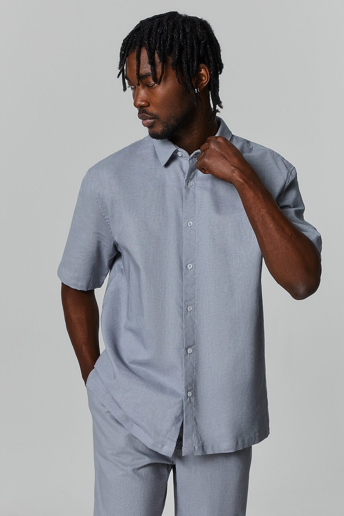 Сорочка верхняя мужская прямого силуэта из ткани, длиной до середины бедер. Рукава короткие втачные. По переду обработана застежка на петли и пуговицы. 7 рубашечных пуговиц на 4 прокола диаметром 10-12 мм. Воротник стояче-отложной с отрезной стойкой. Спинка с отрезной горизонтальной двойной кокеткой. По отлету воротника, по плечевому шву, по пройме и кокетке проложена отделочная строчка на 5мм от шва. Низ изделия и рукавов обработан швом вподгибку с закрытым срезом. Брюки из ткани полной длины с классической линией талии. Силуэт прямой, брюки заужены немного к низу. Пояс отрезной отстроченный, с эластичной тесьмой внутри и шнурком из основного полотна (втянут с изнанки). По переду имитация гульфика, складки талевые. В боковых швах карманы. На задних деталях брюк талевые вытачки. Низ брюк обработан швом в подгибку с открытым срезом.