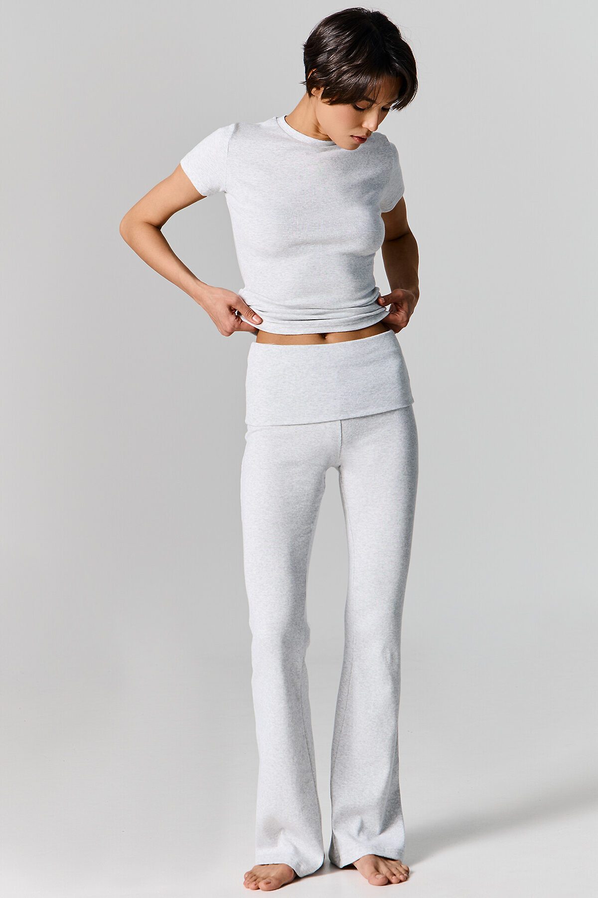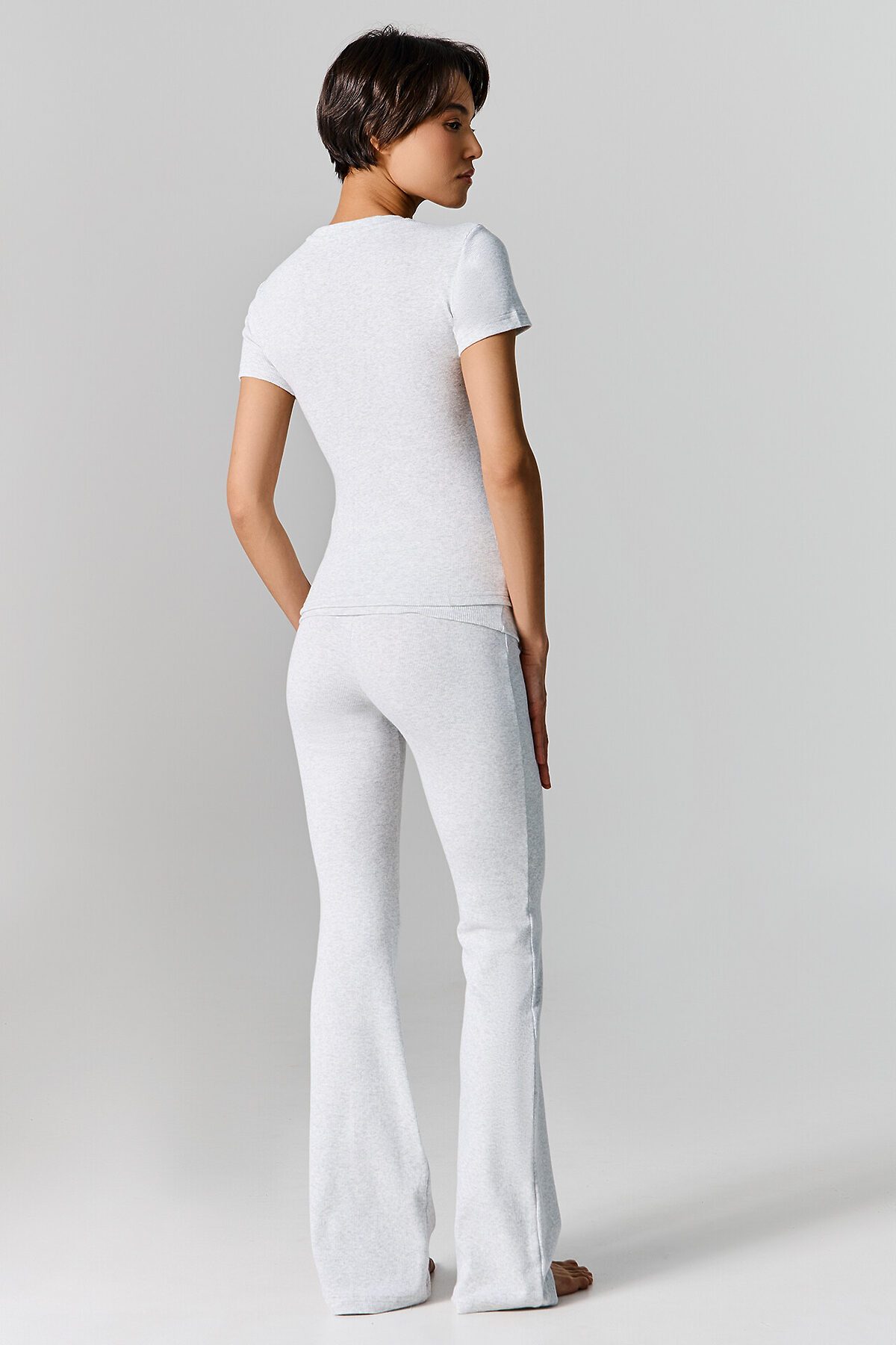 Комплект состоит из джемпера и брюк. Джемпер прилегающего силуэта. Горловина круглой формы обработана обтачкой из основного полотна, шов втачивания обтачки по спинке закрыт бейкой из основного полотна. Рукава втачные короткие. Нижний срез джемпера и рукавов обработан швом вподгибку. Брюки клеш, посадка средняя. Пояс отрезной широкий с отворотом. По шву втачивания отворота в припуск вставлена эластичная тесьма 6мм (жилка тканая WT4-6 Arteks E7112). Нижний срез брюк обработан швом вподгибку.