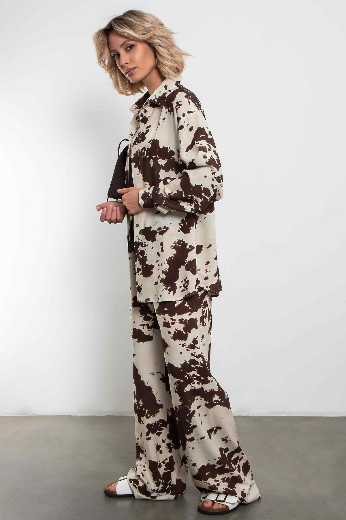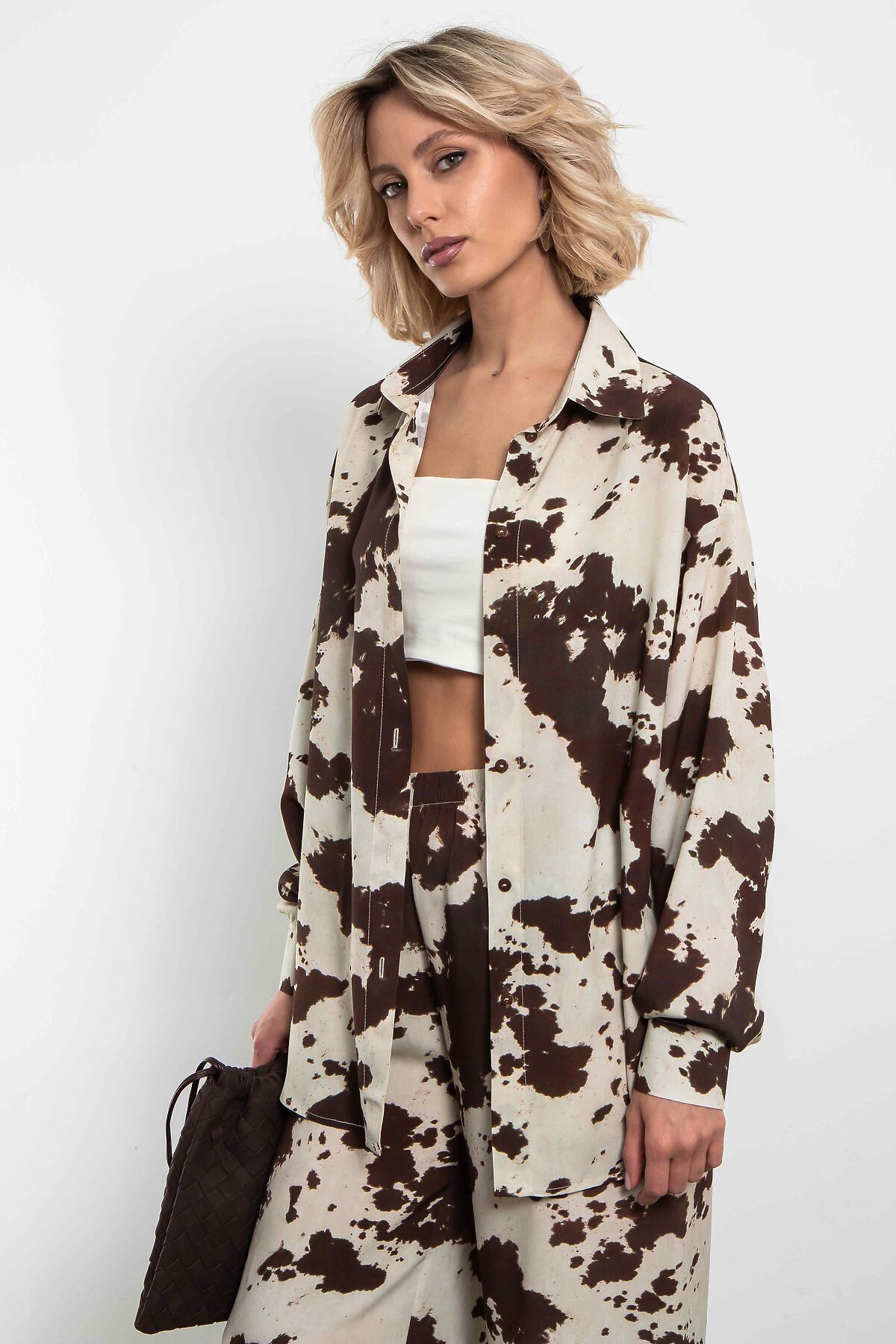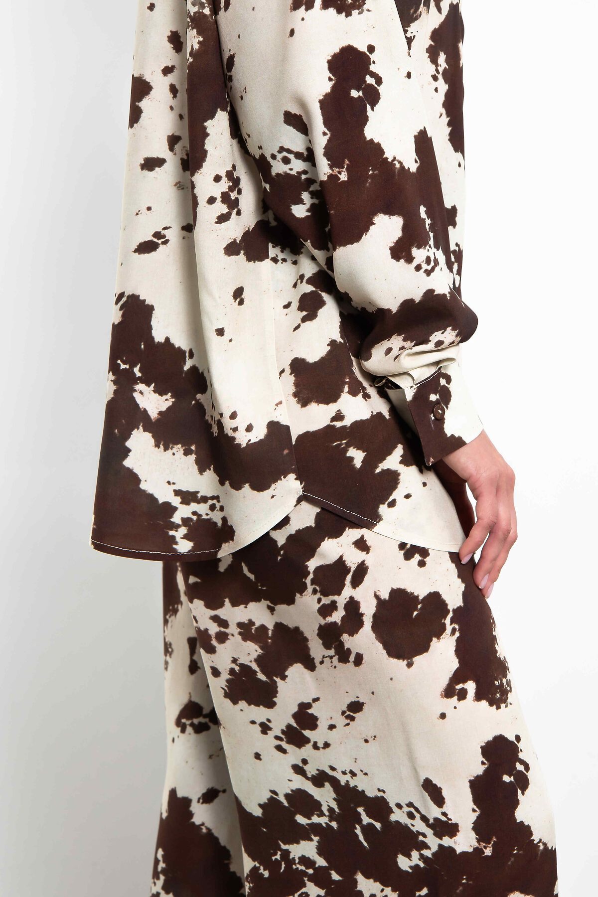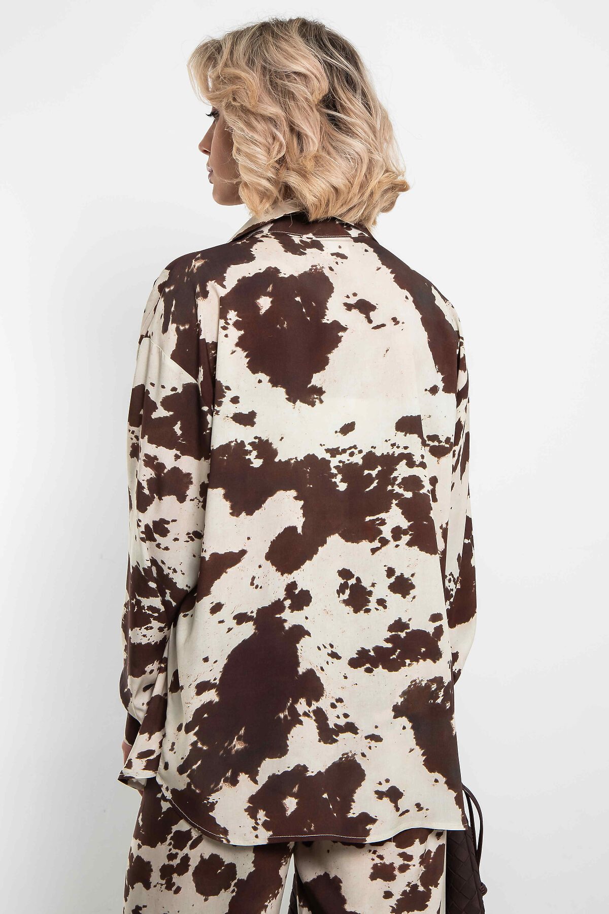 Рубашка оверсайз с трендовым принтом «cow print» полностью из натуральных тканей и фурнитурыЯркий акцент сезона — свободная рубашка с модным коровьим принтом в коричнево-молочной гамме. Анималистичный паттерн выглядит смело и стильно, идеально подходя для повседневных и вечерних образов.Особенности:- Свободный оверсайз-крой для комфорта- Длинные рукава с манжетами на пуговицах- Отложной воротник и застёжка на пуговицы - Сшита из вискозы — натурального материала на основе целлюлозы: мягкая, воздухопроницаемая, приятная к телу и хорошо драпируется