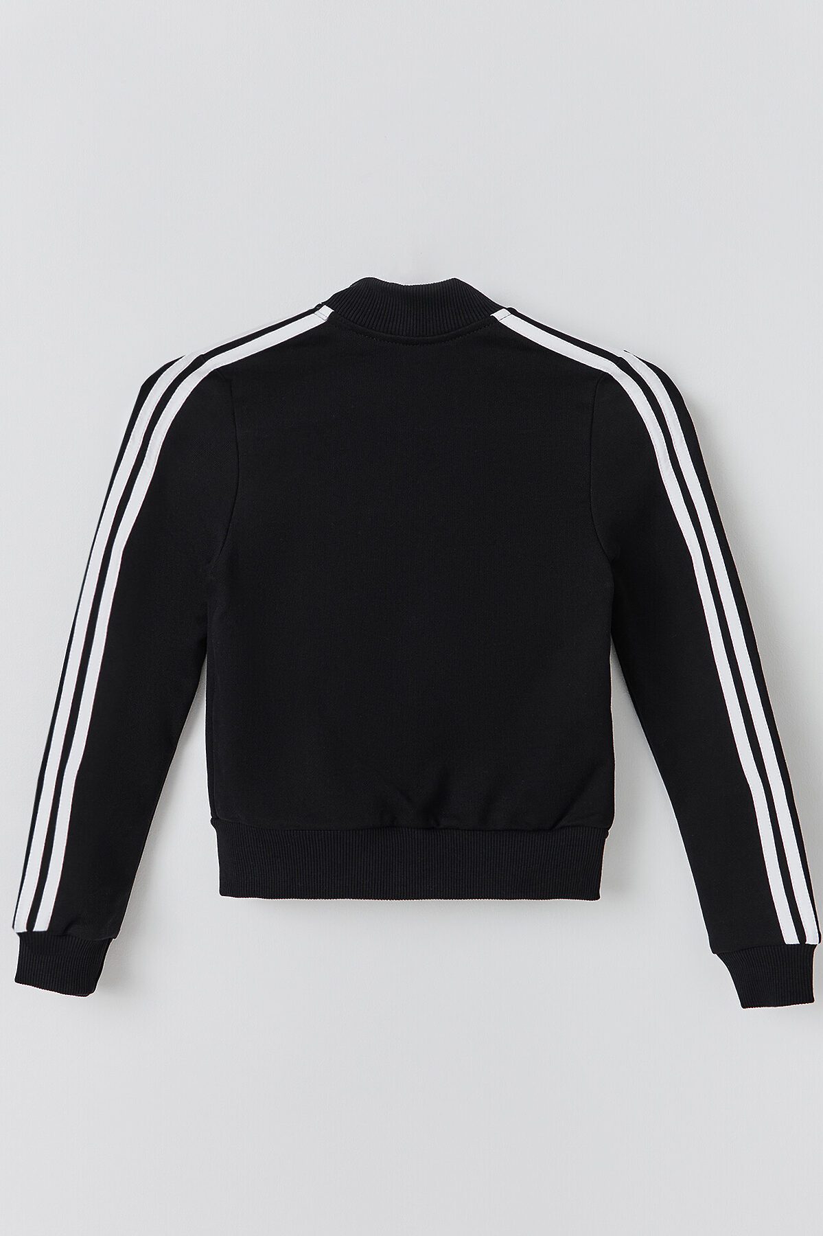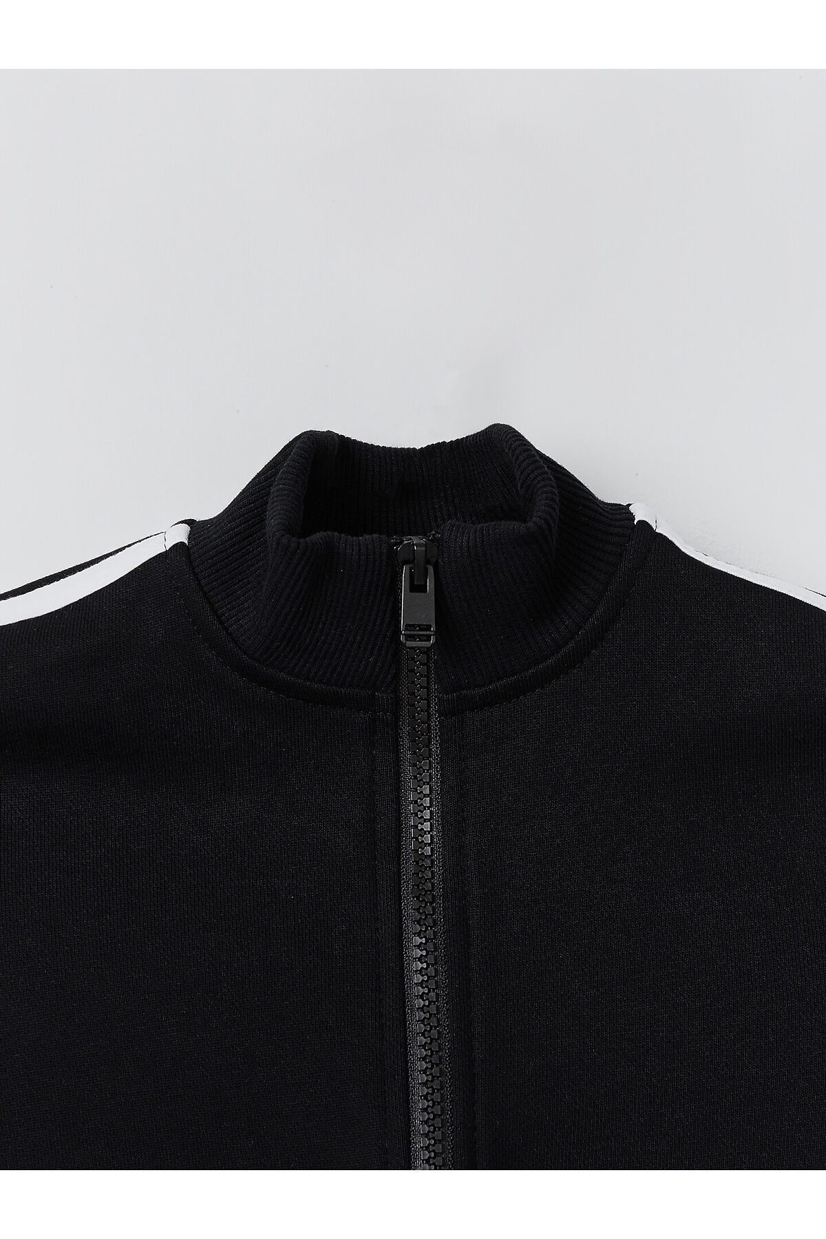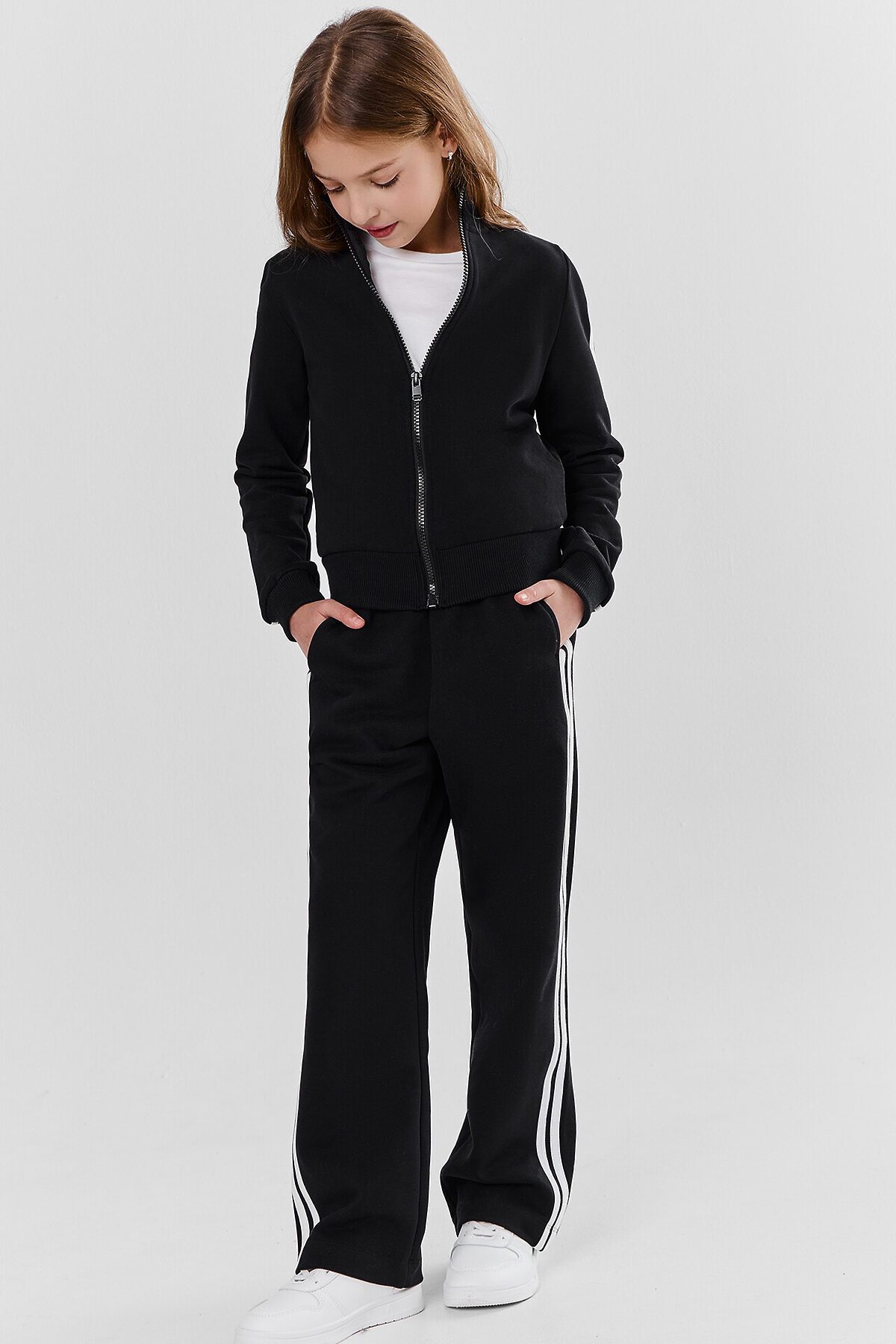 Толстовка свободного силуэта. В горловину втачен воротник-стойка из рибаны. Рукава втачные, длинные. По низу рукава манжеты из рибаны. По переду застежка на молнию. По рукаву настроченны лампасы. По низу изделия отрезной пояс из рибаны. Брюки свободного силуэта с высокой посадкой в пол. Пояс цельнокроенный с эластичной тесьмой внутри 40RV. По боковому шву брюк настрочены лампасы из кулирки. По поясу сделаны 2 отделочные строчки. Карманы в боковых швах, внутри карманов основное полотно. Низ брюк обработан швом вподгибку.