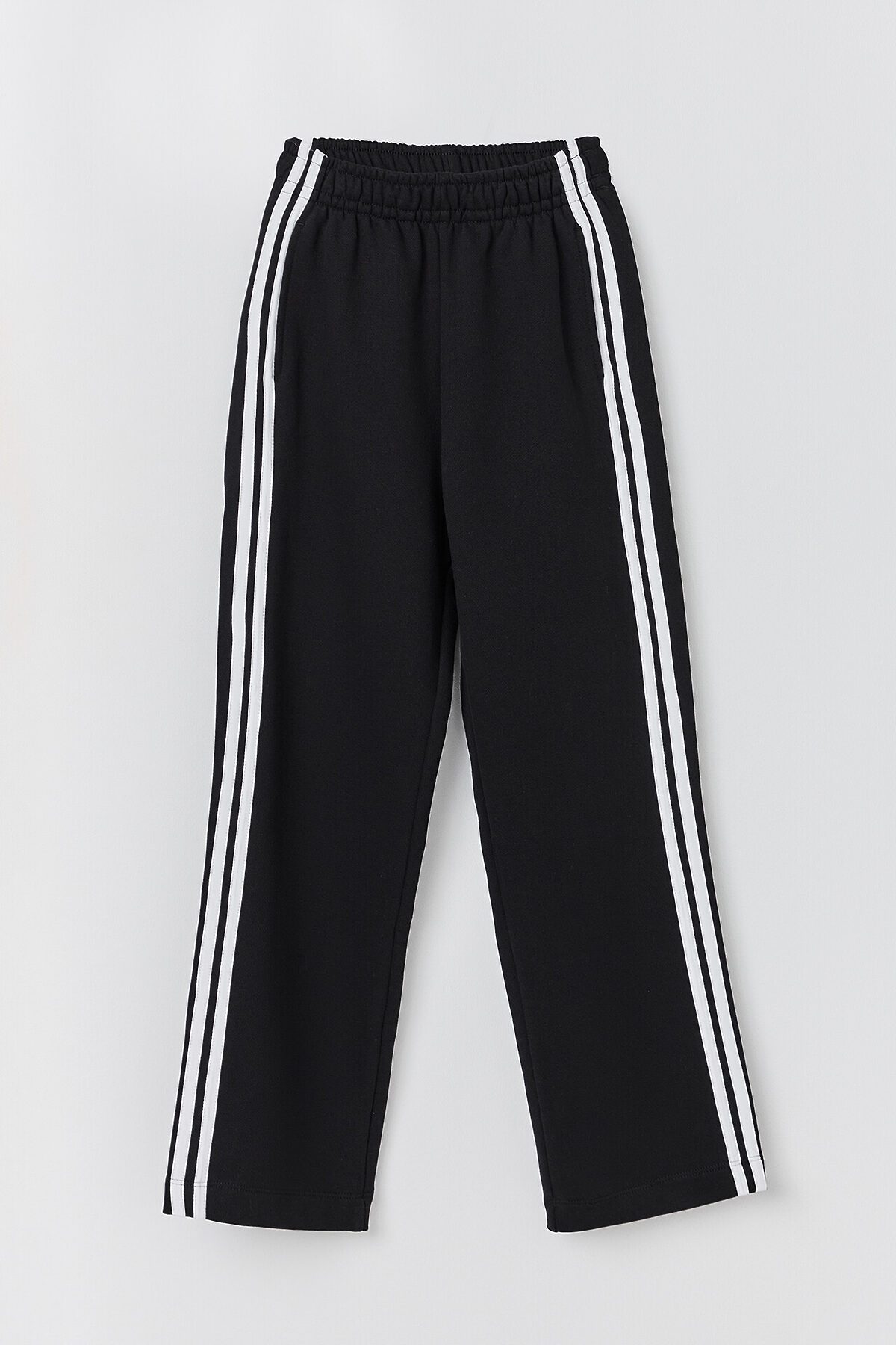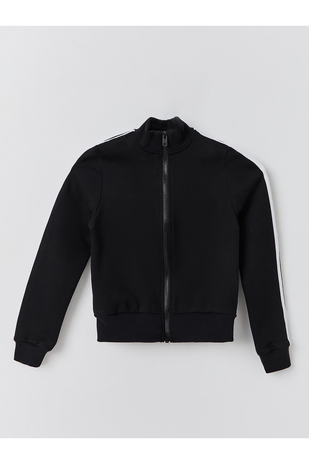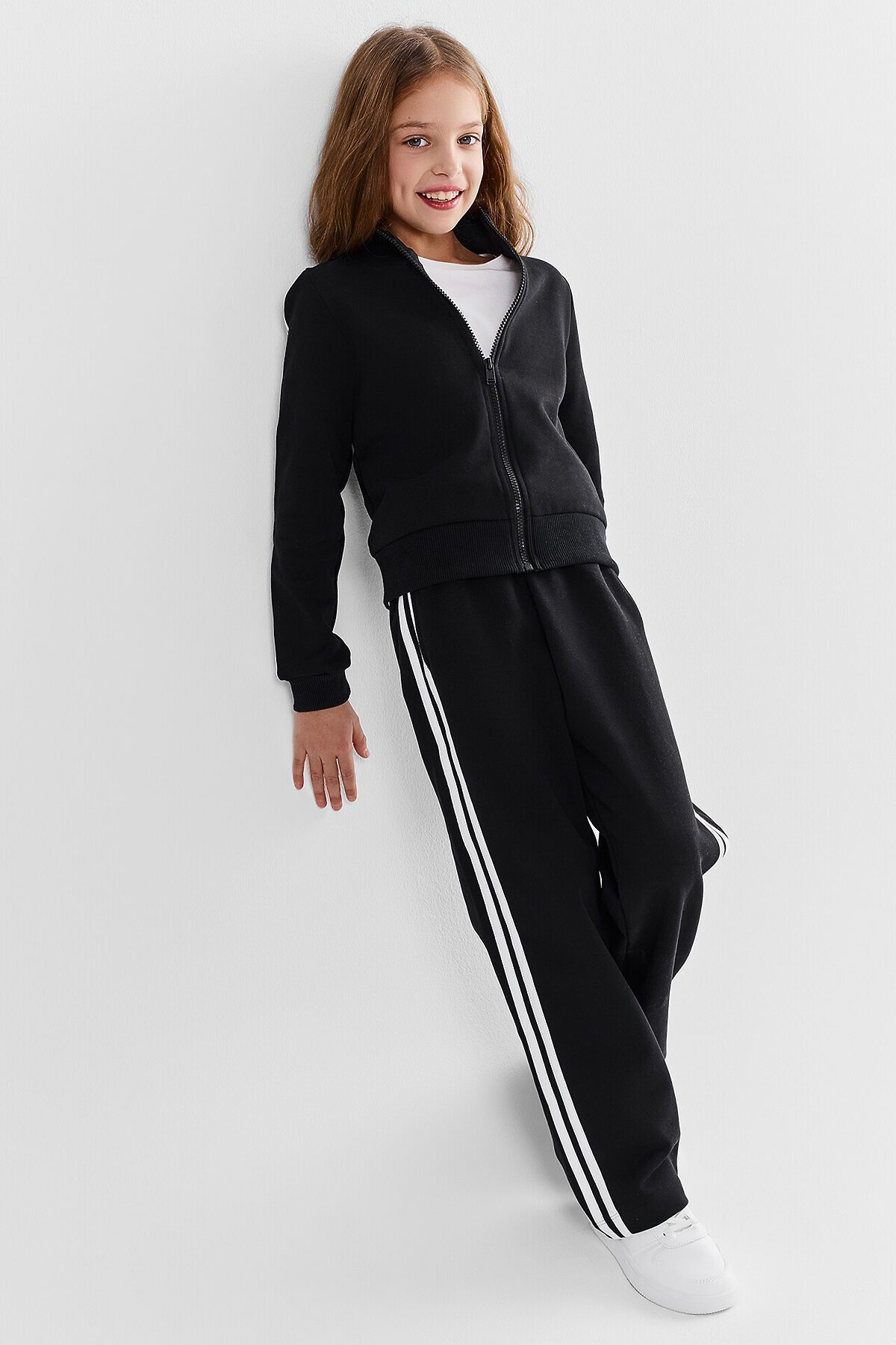 Толстовка свободного силуэта. В горловину втачен воротник-стойка из рибаны. Рукава втачные, длинные. По низу рукава манжеты из рибаны. По переду застежка на молнию. По рукаву настроченны лампасы. По низу изделия отрезной пояс из рибаны. Брюки свободного силуэта с высокой посадкой в пол. Пояс цельнокроенный с эластичной тесьмой внутри 40RV. По боковому шву брюк настрочены лампасы из кулирки. По поясу сделаны 2 отделочные строчки. Карманы в боковых швах, внутри карманов основное полотно. Низ брюк обработан швом вподгибку.