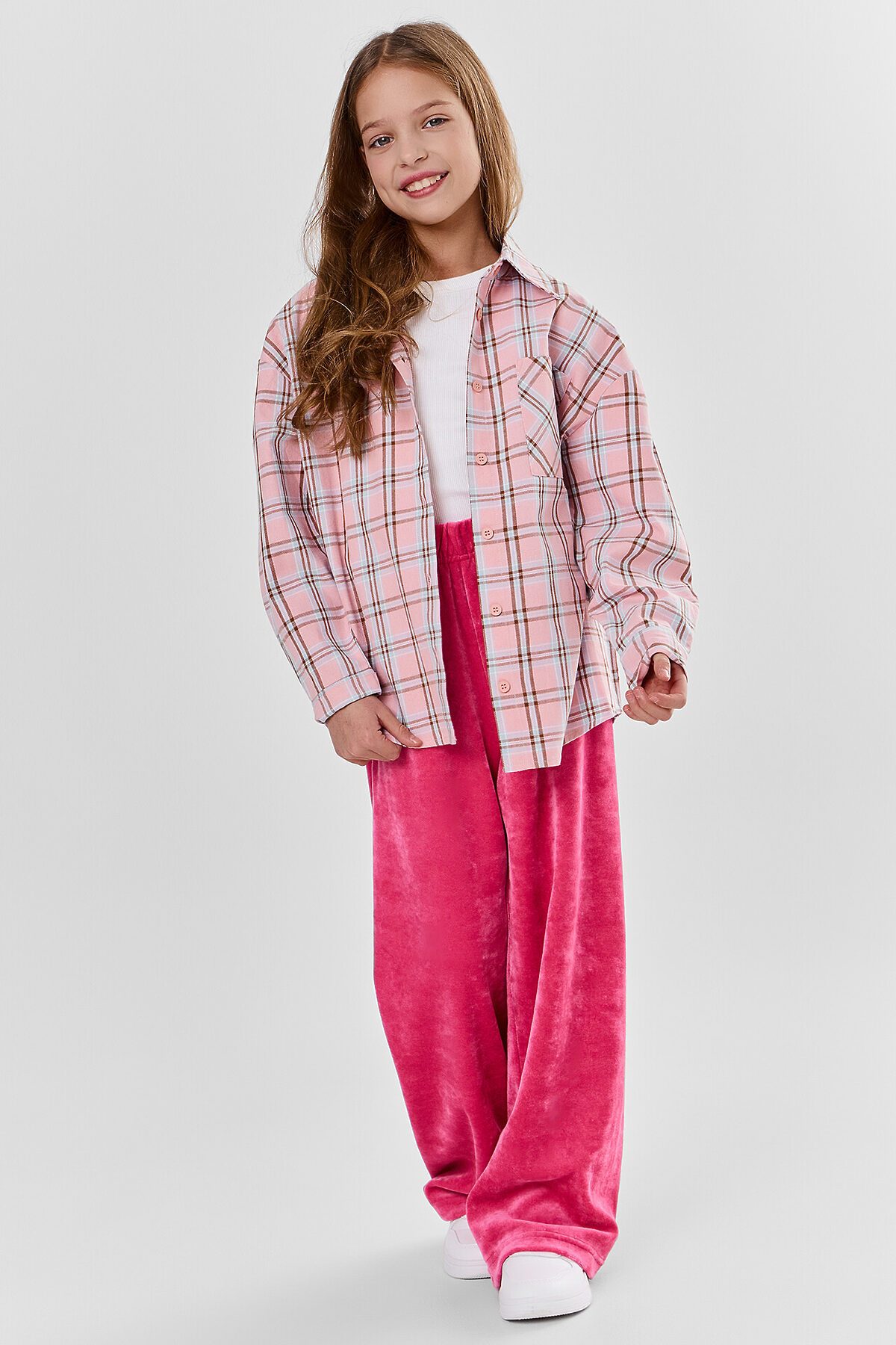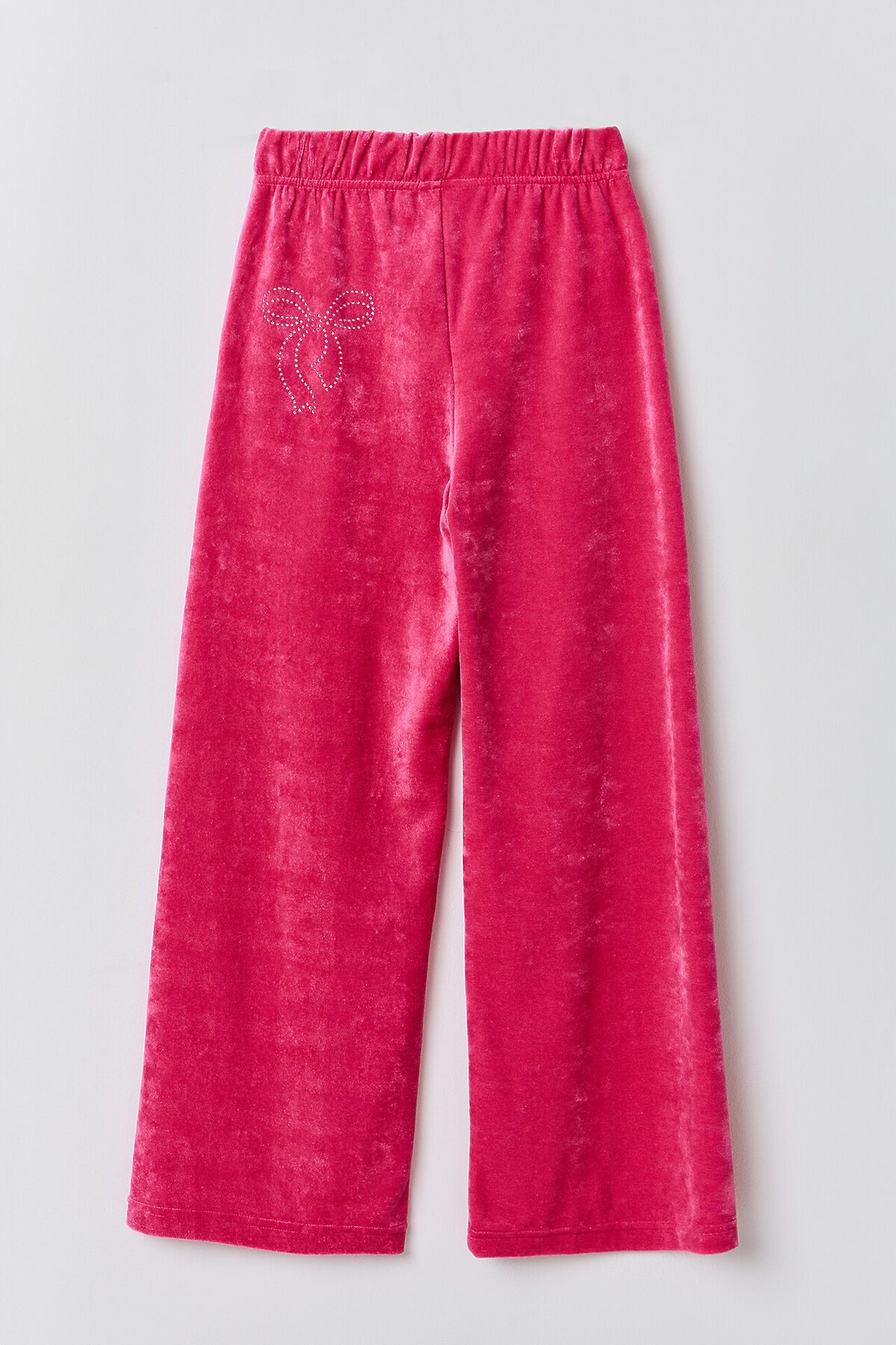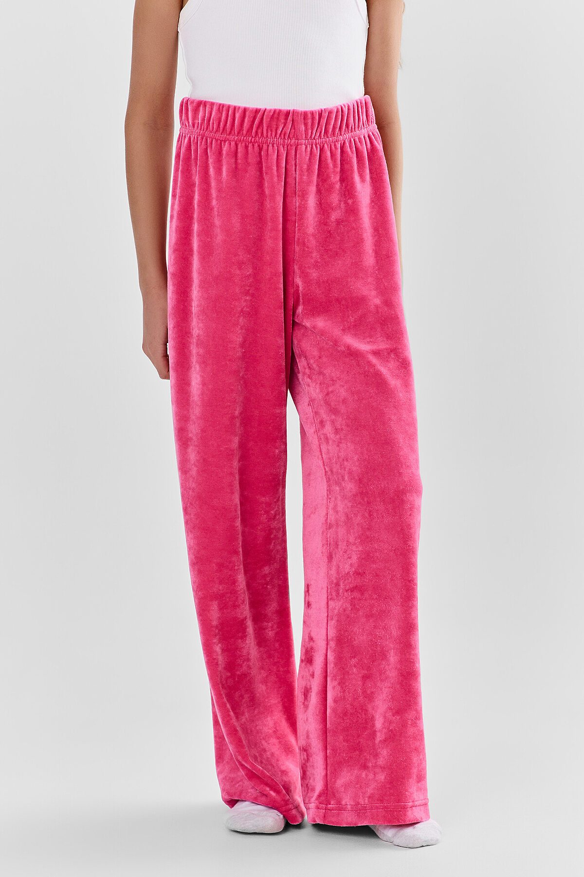 Брюки домашние для девочек свободного силуэта, длинные. Пояс цельнокроеный с эластичной тесьмой внутри (внутрення резина Rv40), ширина 40 мм. Низ обработан на 2-х игольной плоскошовной машине швом в подгибку.