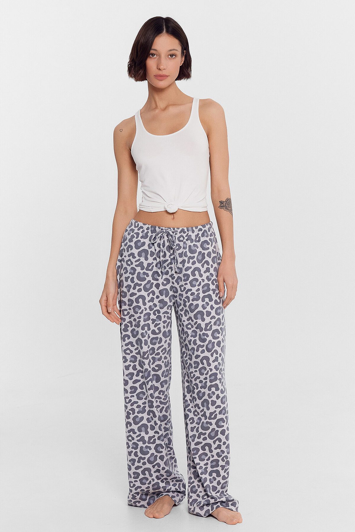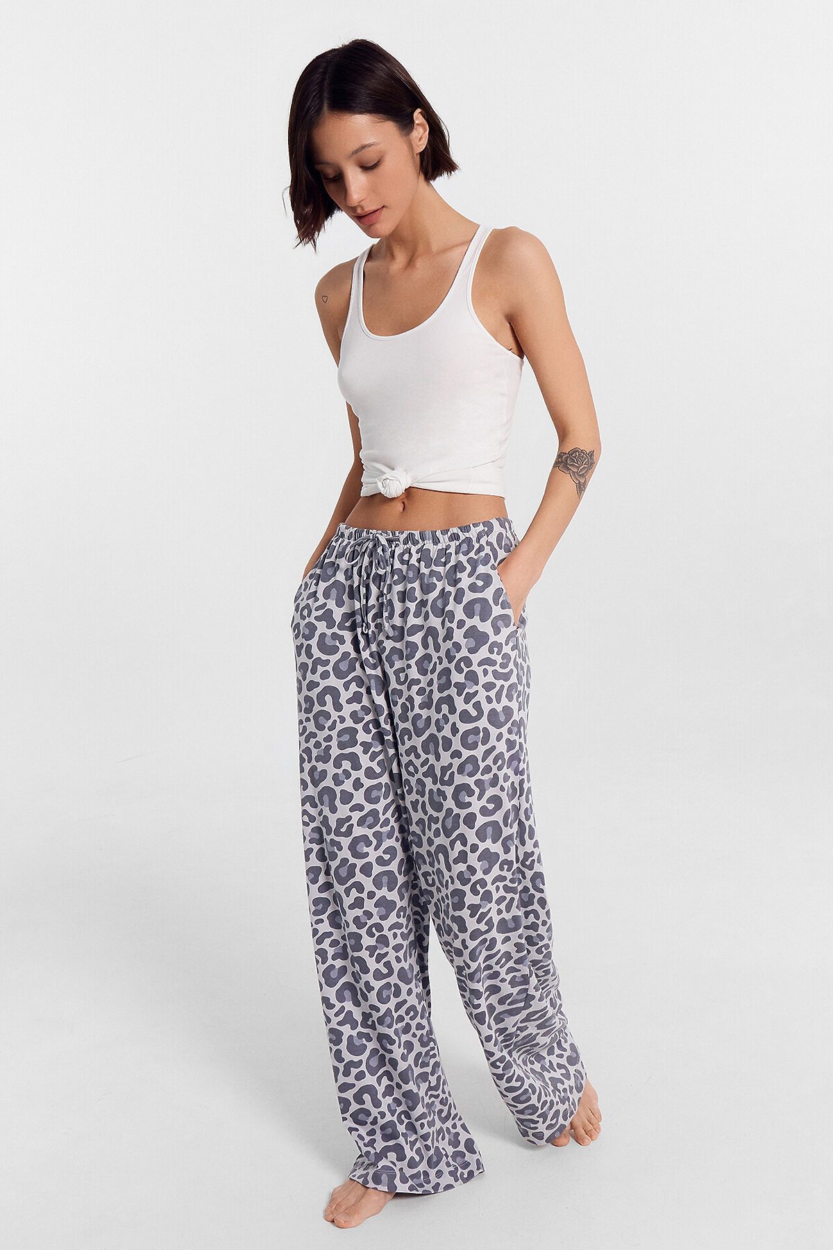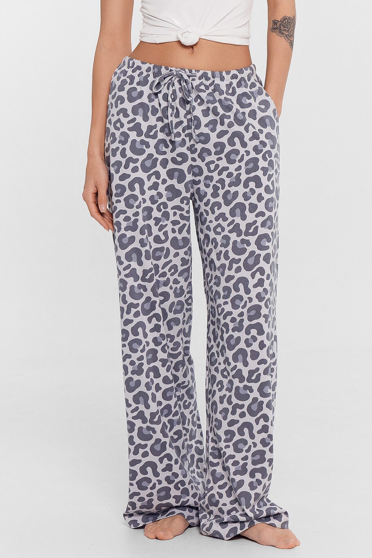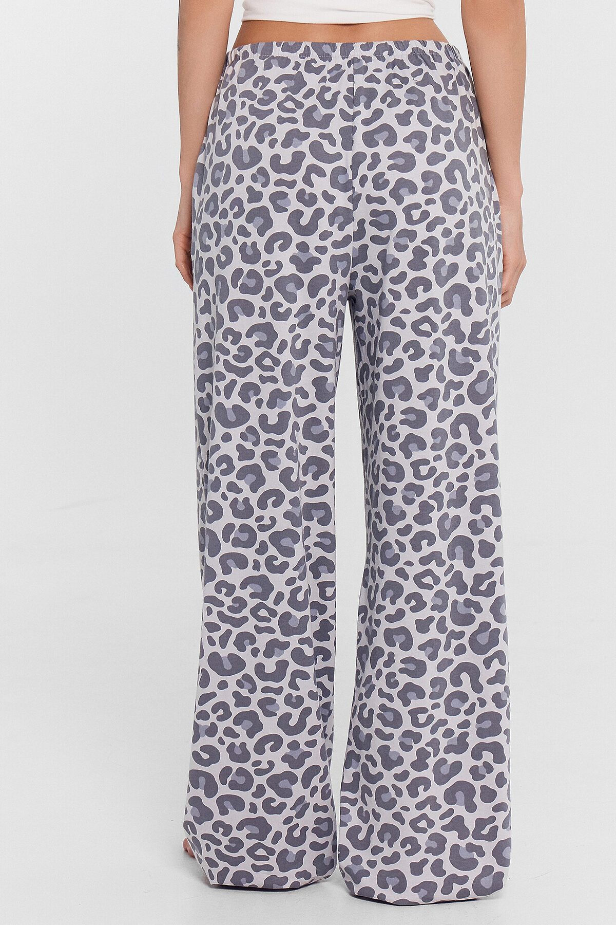 Домашние брюки с принтом — это уют и свобода в каждой детали. Высокая посадка и свободный силуэт из мягкого хлопкового трикотажа обеспечивают комфорт и полную свободу движений, идеально подходя для отдыха дома.
