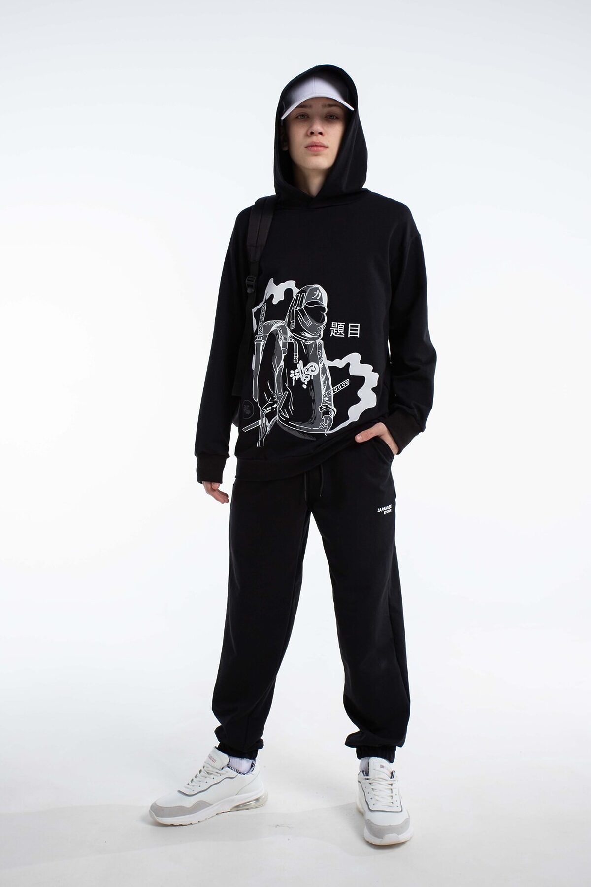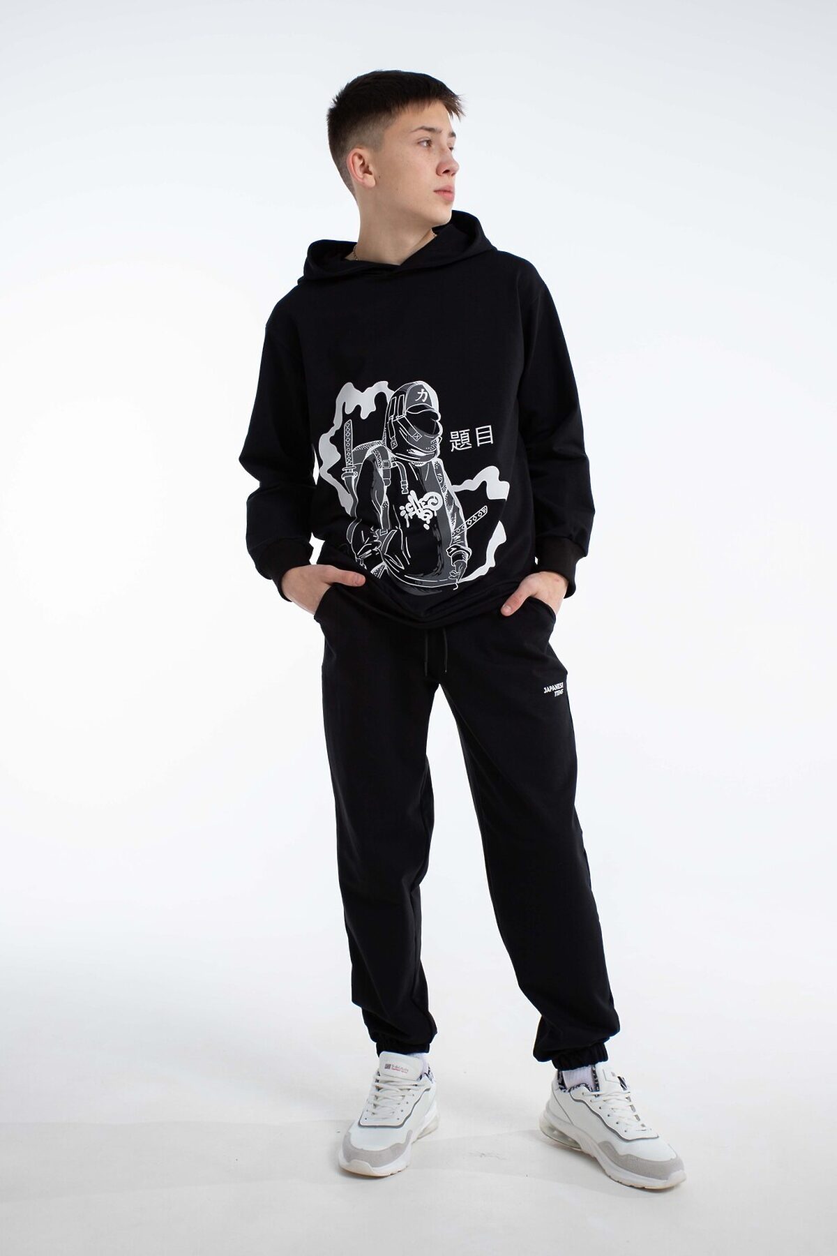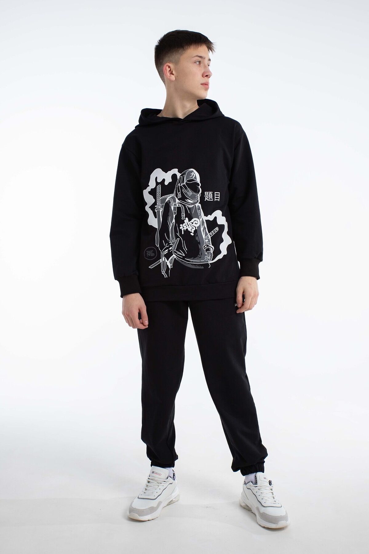 Спортивный костюм в стиле y2k с джоггерами для вашего подростка. Откройте новые грани комфорта и моды для ребенка с оригинальным демисезонным костюмом, состоящим из удлинённой толстовки с глубоким капюшоном и джоггеров. Этот детский осенний комплект без начеса, выполненный в оверсайз, станет отличным дополнением гардероба любого мальчика или подростка, который ценит удобство и современные тенденции. Изготовленный из дышащего хлопкового материала, костюм обеспечивает комфорт в тёплую осень, весну и зиму с верхней одеждой, будь то активные занятия спортом, баскетбол, велопрогулки, скейт или катание на самокате. Такой спортивный костюм для мальчиков отличный вариант школьной формы для физкультуры.Эта спортивная вещь подойдет и для повседневного использования: прогулки с друзьями, походы в лагерь или отпуск у моря. Черный цвет добавляет универсальности, позволяя сочетать костюм с разными элементами гардероба для создания разнообразных повседневных образов. Оверсайз толстовка с капюшоном и штаны с идеальной посадкой не restrict движения, обеспечивая комфорт во время активного отдыха и занятий спортом. Цвет костюма насыщенный черный с оригинальным принтом, который выделяет стиль и подчёркивает индивидуальность, делая вашего мальчика заметным среди сверстников. Этот комплект станет надёжным выбором для тех, кто ищет сочетание комфорта, стиля и универсальности в подростковой одежде. Таким образом, выбирая наш спортивный костюм, вы предоставляете вашему мальчику или подростку идеальный баланс комфорта, стиля и практичности.