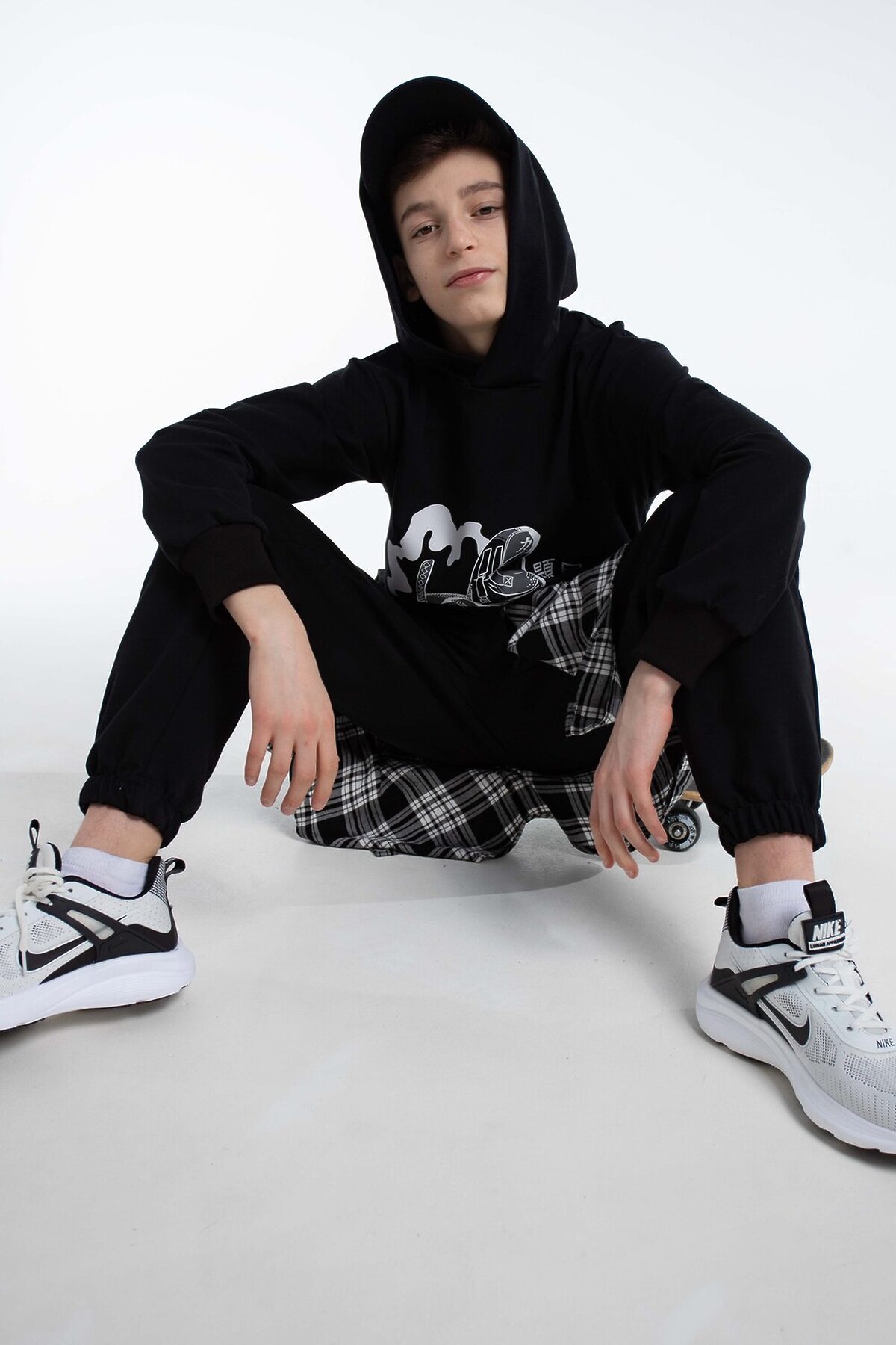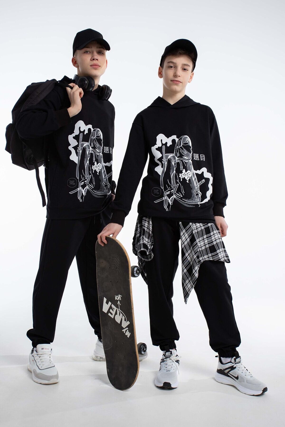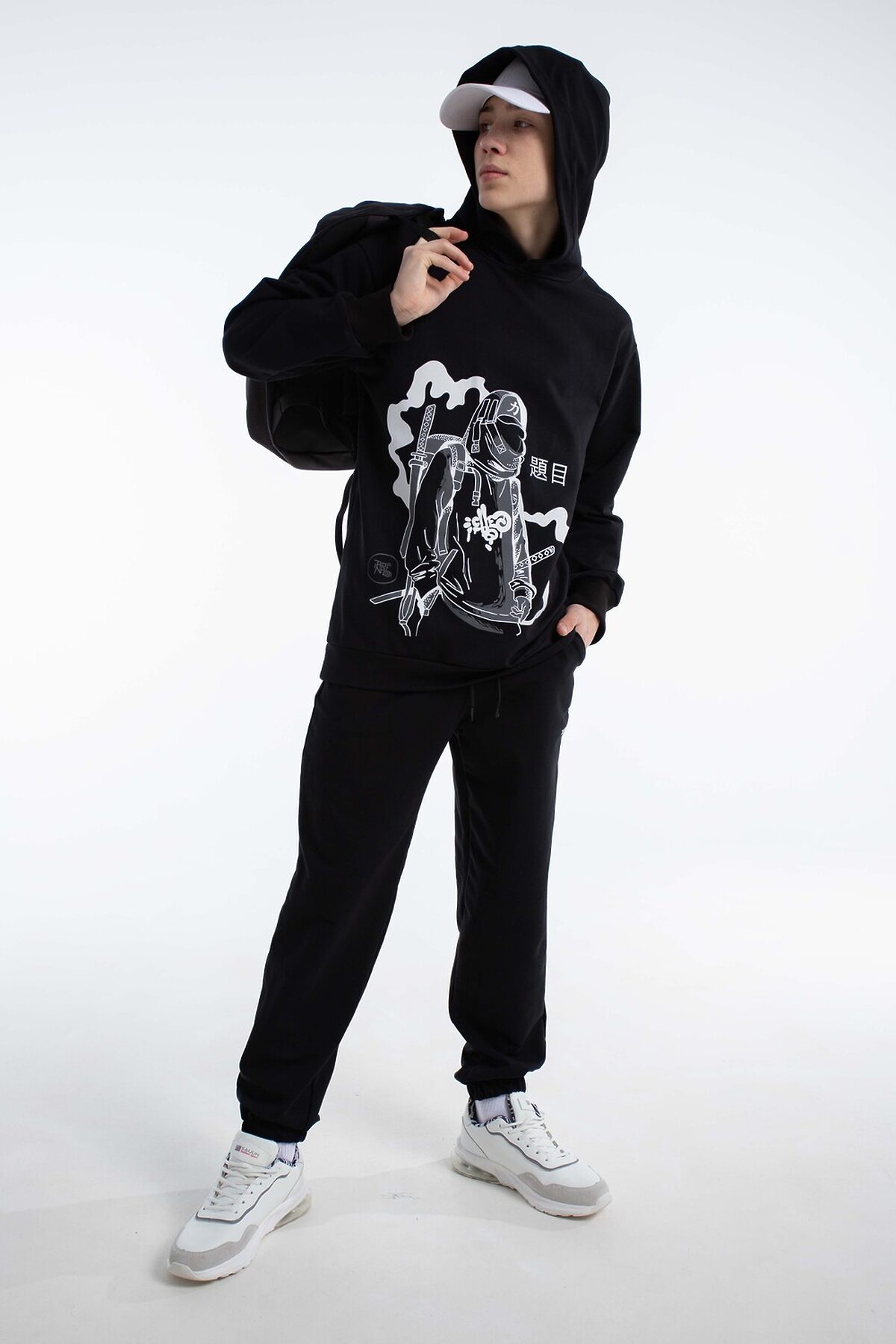 Спортивный костюм в стиле y2k с джоггерами для вашего подростка. Откройте новые грани комфорта и моды для ребенка с оригинальным демисезонным костюмом, состоящим из удлинённой толстовки с глубоким капюшоном и джоггеров. Этот детский осенний комплект без начеса, выполненный в оверсайз, станет отличным дополнением гардероба любого мальчика или подростка, который ценит удобство и современные тенденции. Изготовленный из дышащего хлопкового материала, костюм обеспечивает комфорт в тёплую осень, весну и зиму с верхней одеждой, будь то активные занятия спортом, баскетбол, велопрогулки, скейт или катание на самокате. Такой спортивный костюм для мальчиков отличный вариант школьной формы для физкультуры.Эта спортивная вещь подойдет и для повседневного использования: прогулки с друзьями, походы в лагерь или отпуск у моря. Черный цвет добавляет универсальности, позволяя сочетать костюм с разными элементами гардероба для создания разнообразных повседневных образов. Оверсайз толстовка с капюшоном и штаны с идеальной посадкой не restrict движения, обеспечивая комфорт во время активного отдыха и занятий спортом. Цвет костюма насыщенный черный с оригинальным принтом, который выделяет стиль и подчёркивает индивидуальность, делая вашего мальчика заметным среди сверстников. Этот комплект станет надёжным выбором для тех, кто ищет сочетание комфорта, стиля и универсальности в подростковой одежде. Таким образом, выбирая наш спортивный костюм, вы предоставляете вашему мальчику или подростку идеальный баланс комфорта, стиля и практичности.