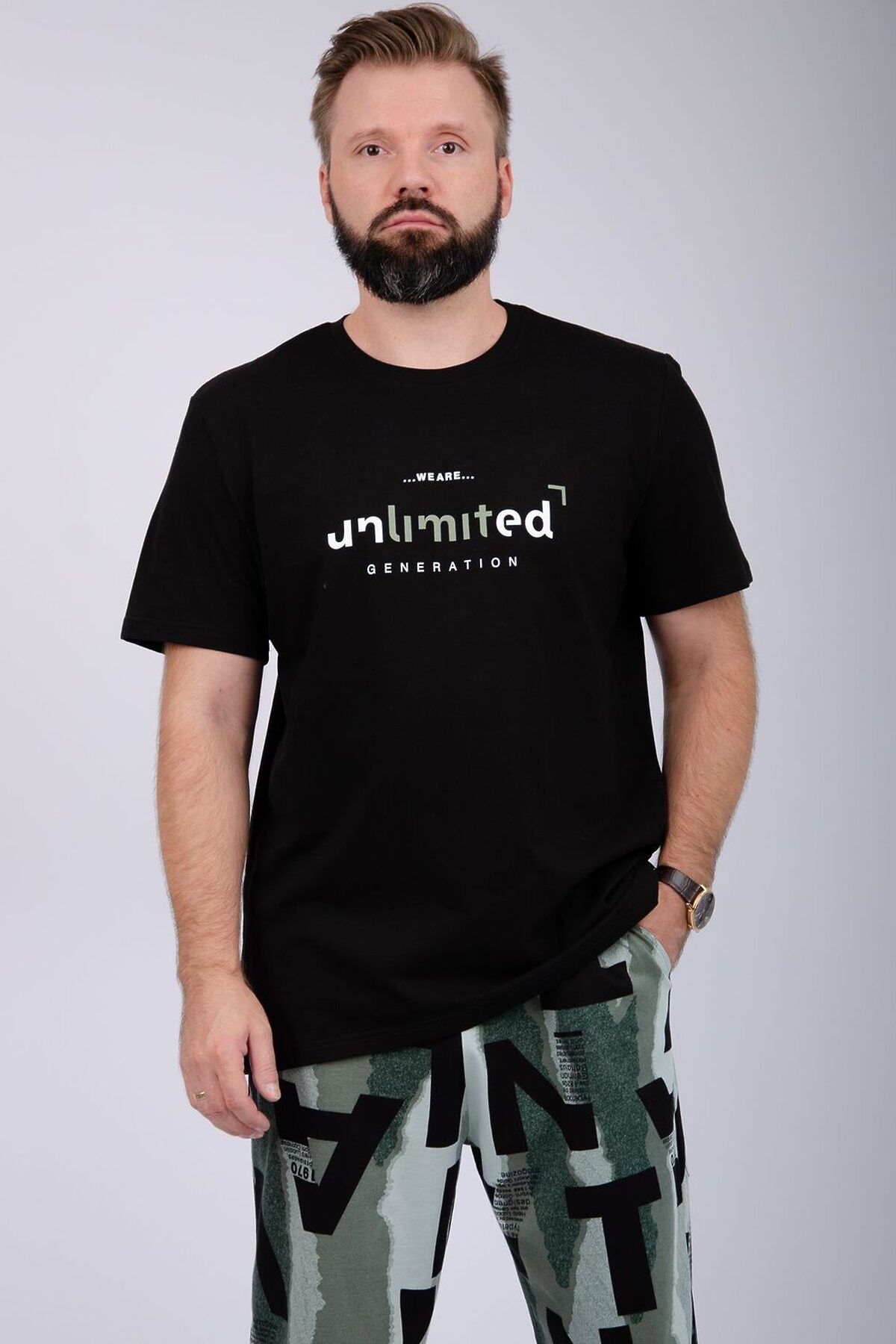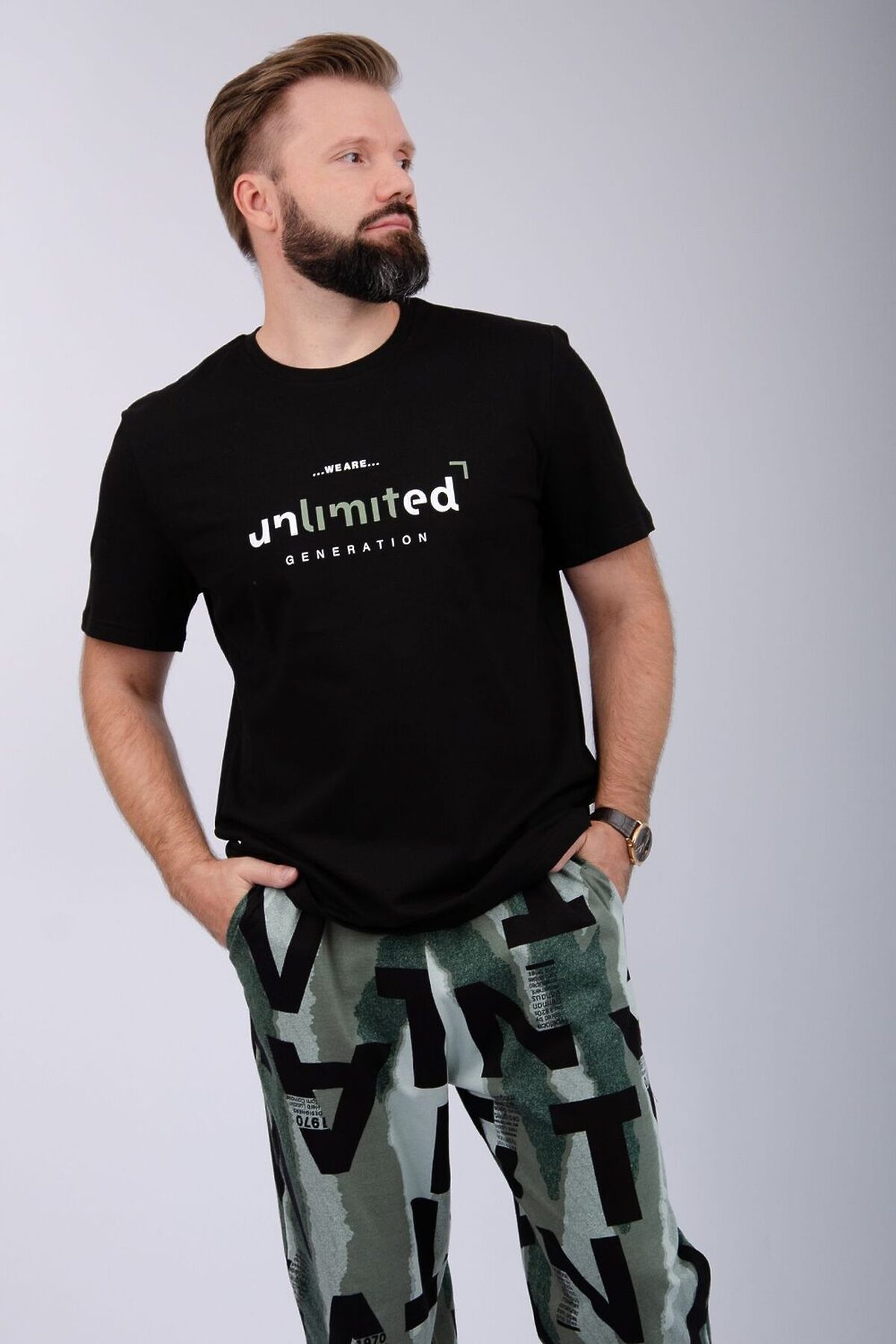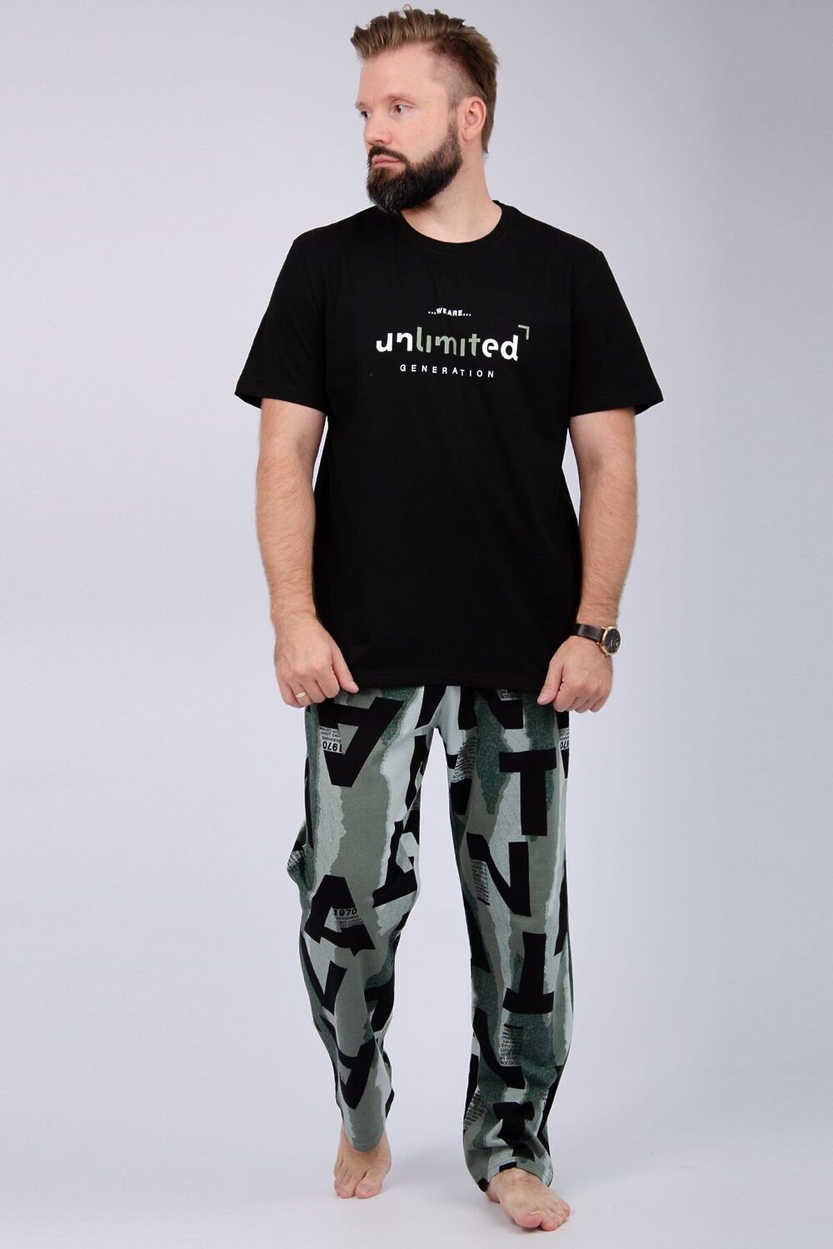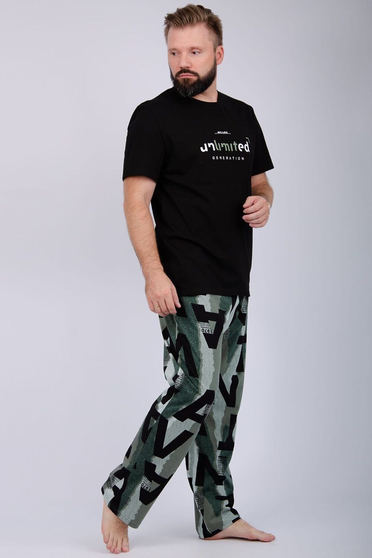 Пижама мужская: футболка прямого кроя с короткими рукавами с принтом на полочке, брюки прямые, с карманами в боковых швах.