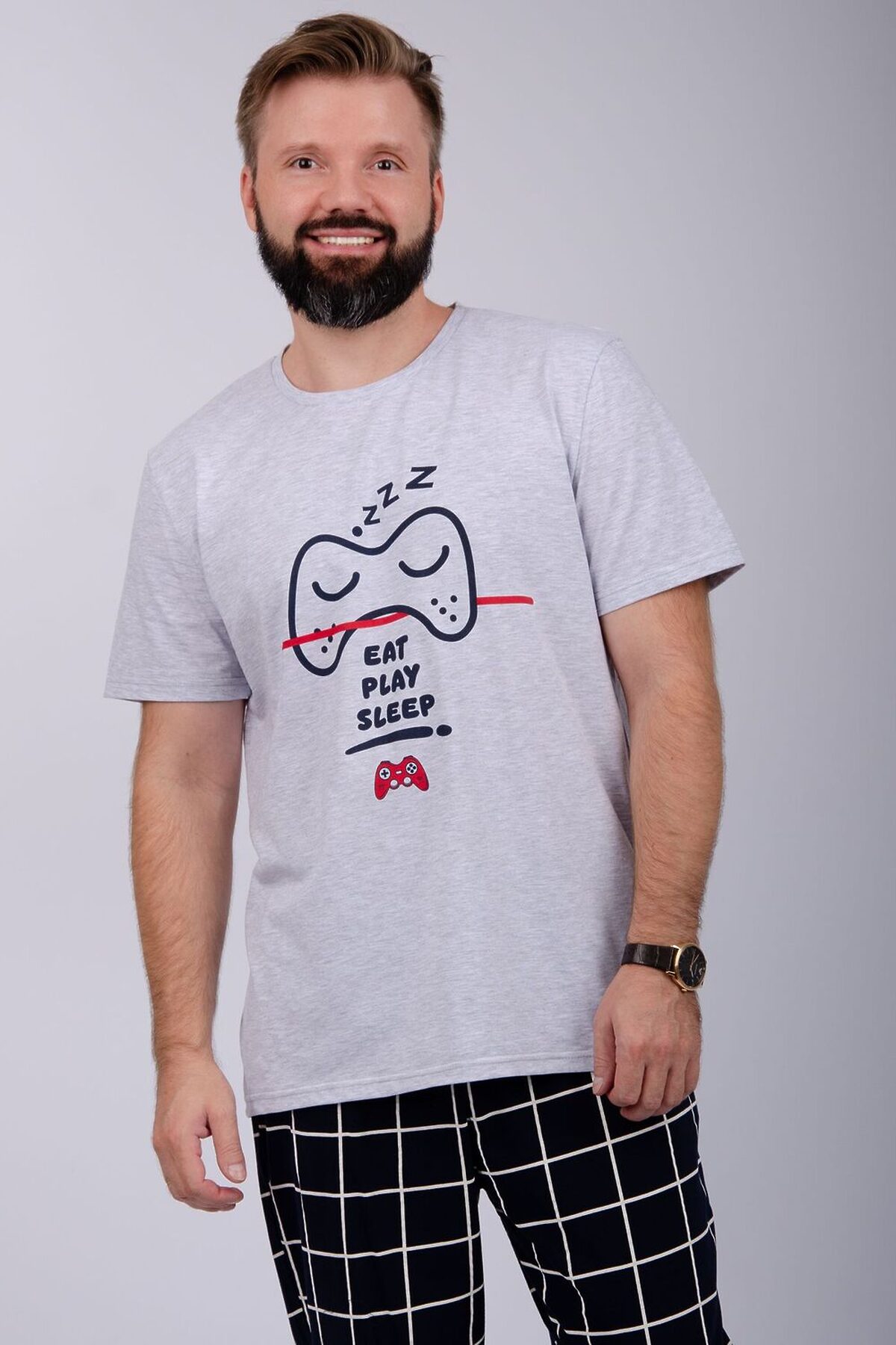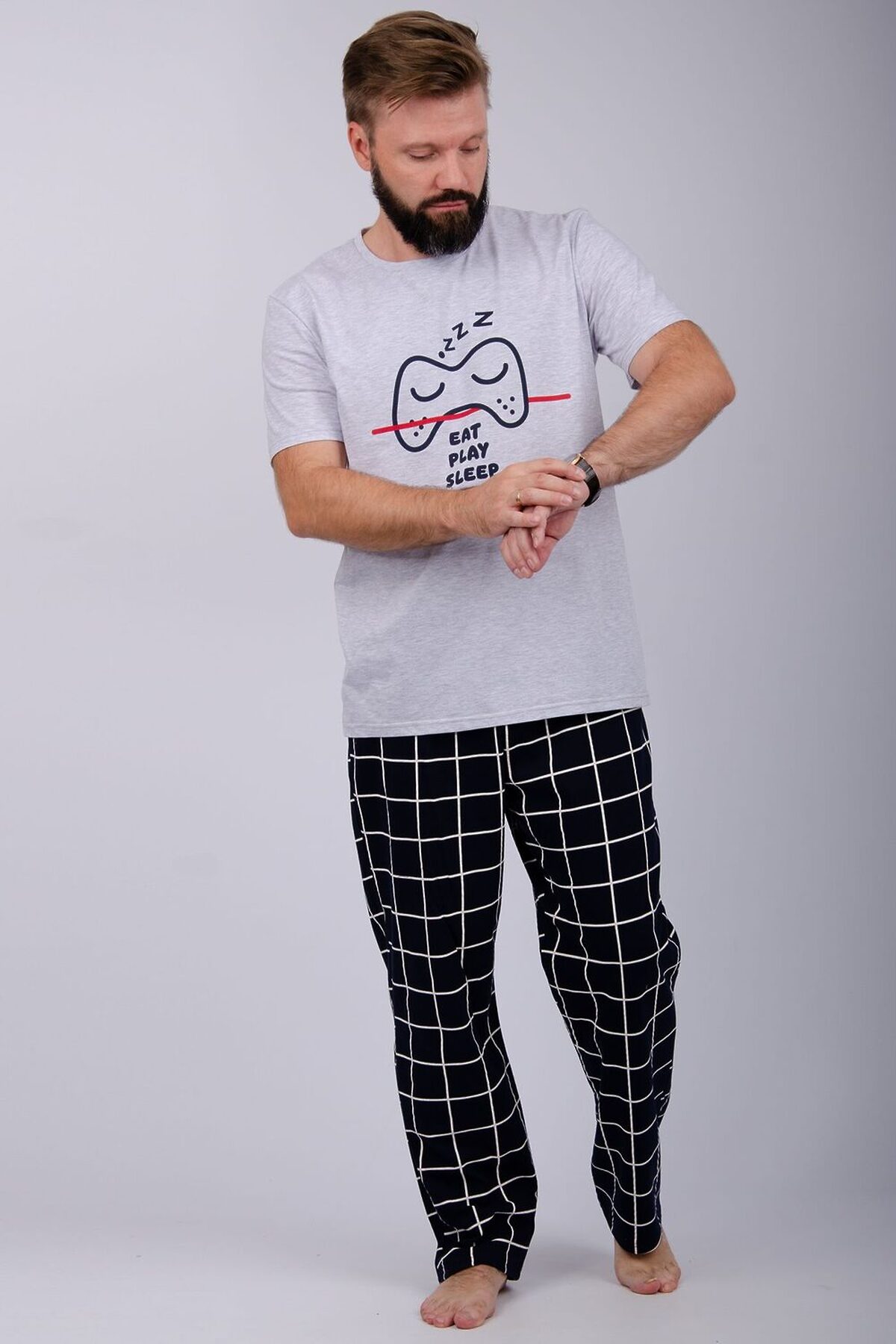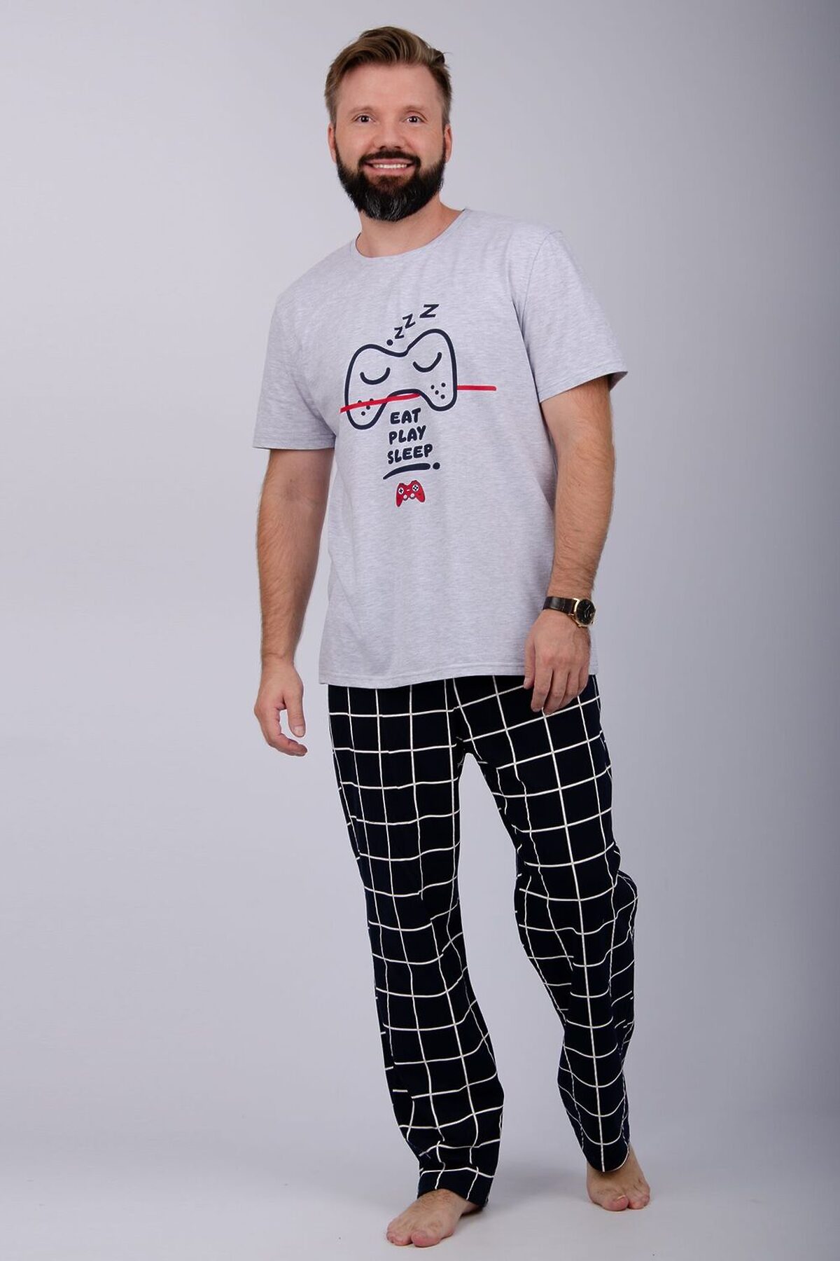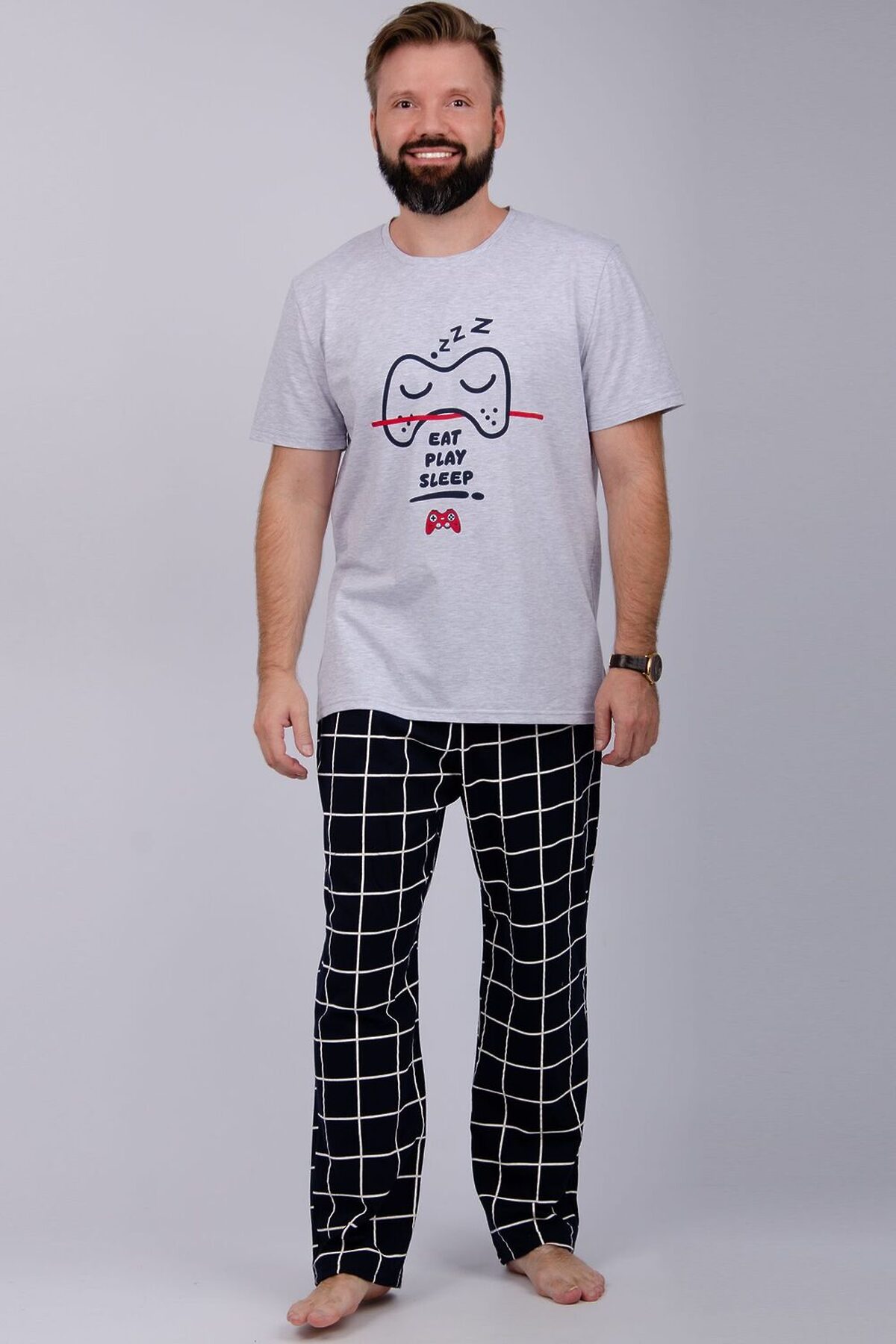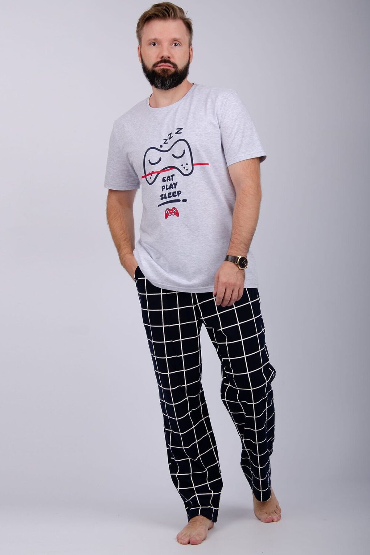 Комфортная мужская пижама из 100% хлопка. Брюки в клетку с боковыми карманами, на эластичном поясе и футболка с коротким рукавом и стильным принтом на полочке.