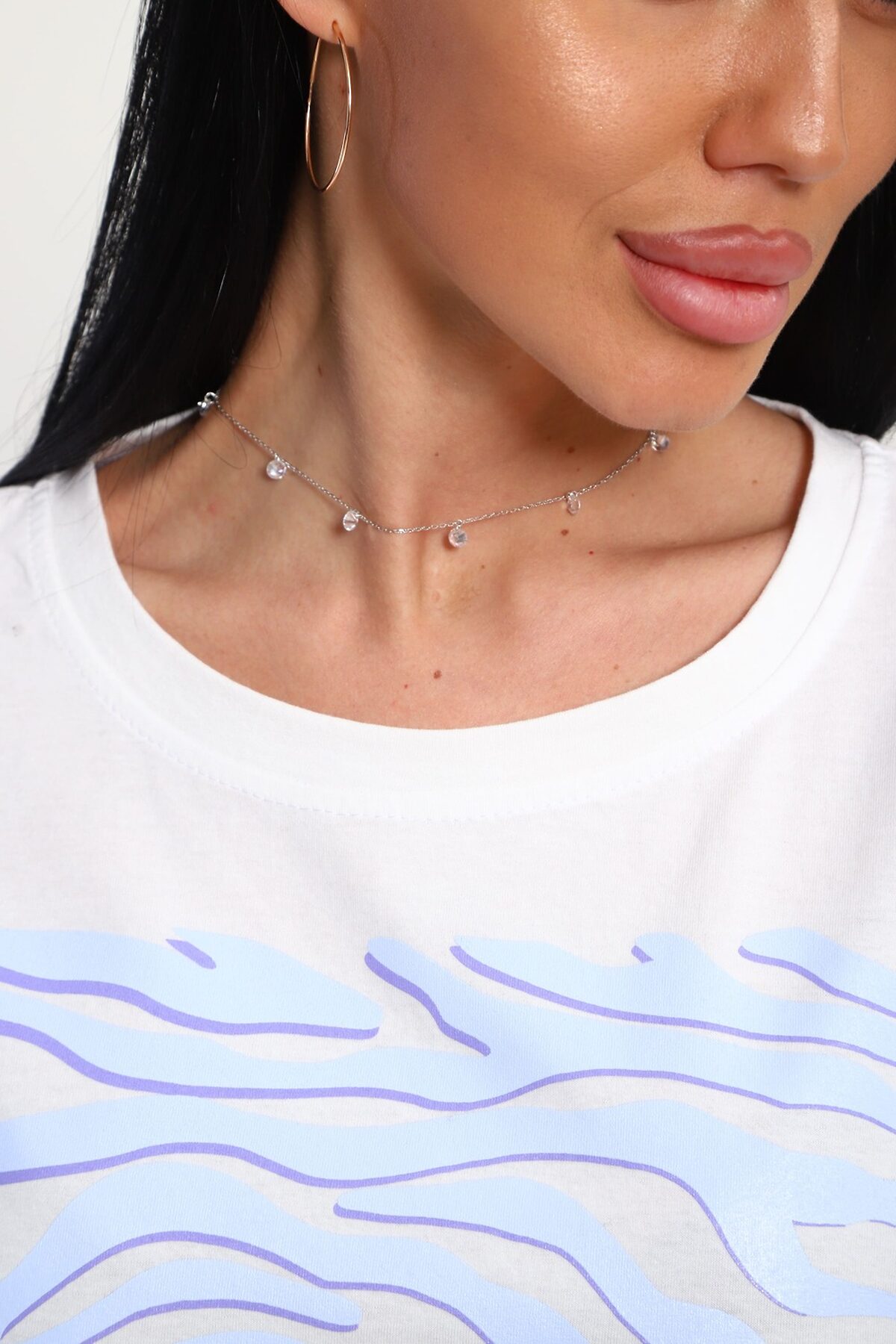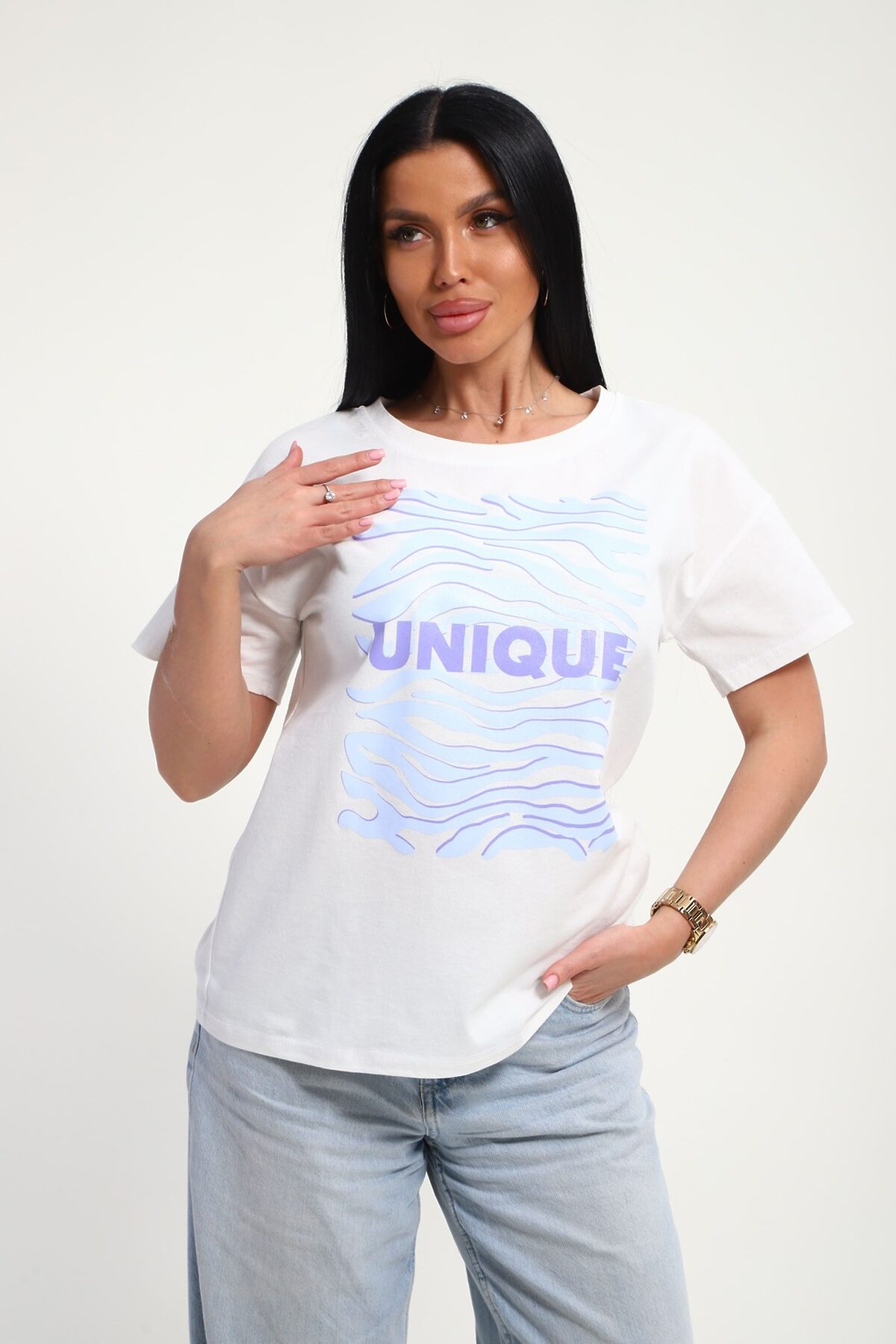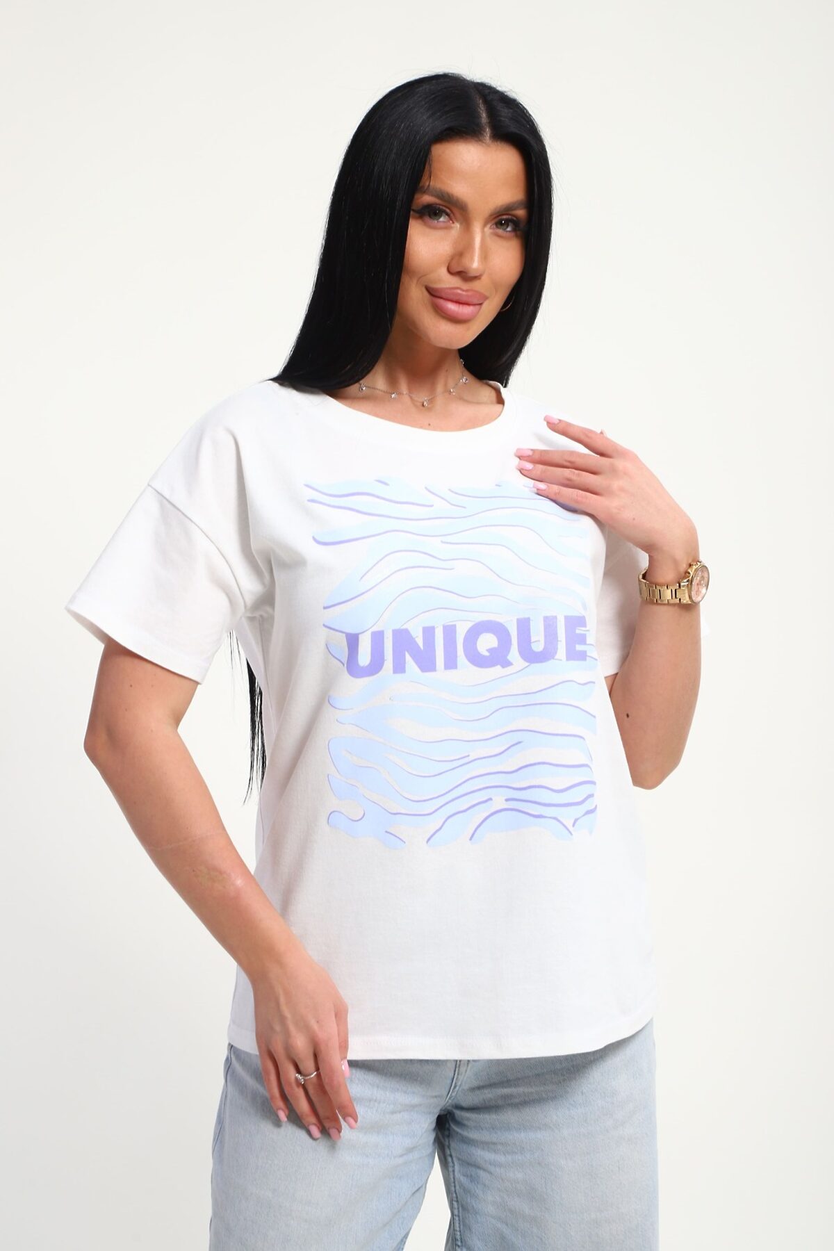 Футболка женская из гладкокрашенного трикотажа, хлопок 100%. Прямого силуэта, свободного облегания. горловина круглой формы. Рукав короткий. Низ изделия прямой. На полочке принт, шелкография.