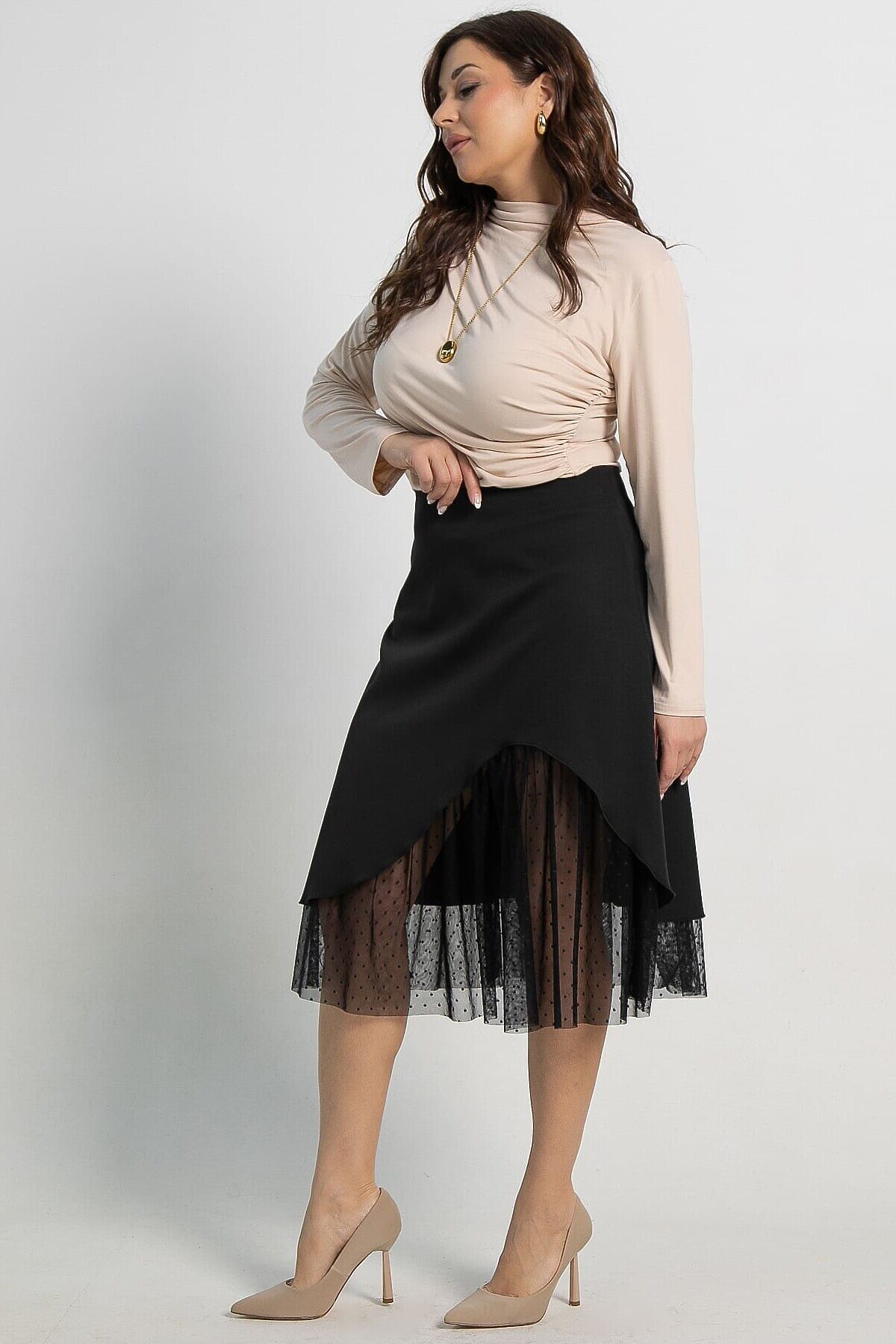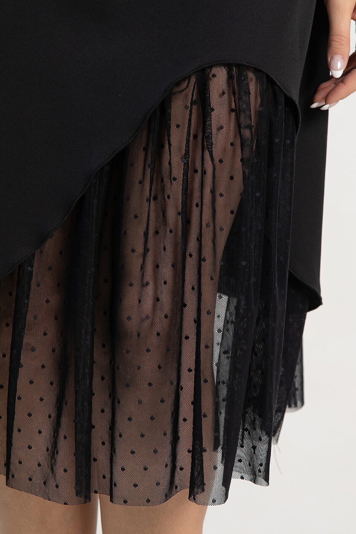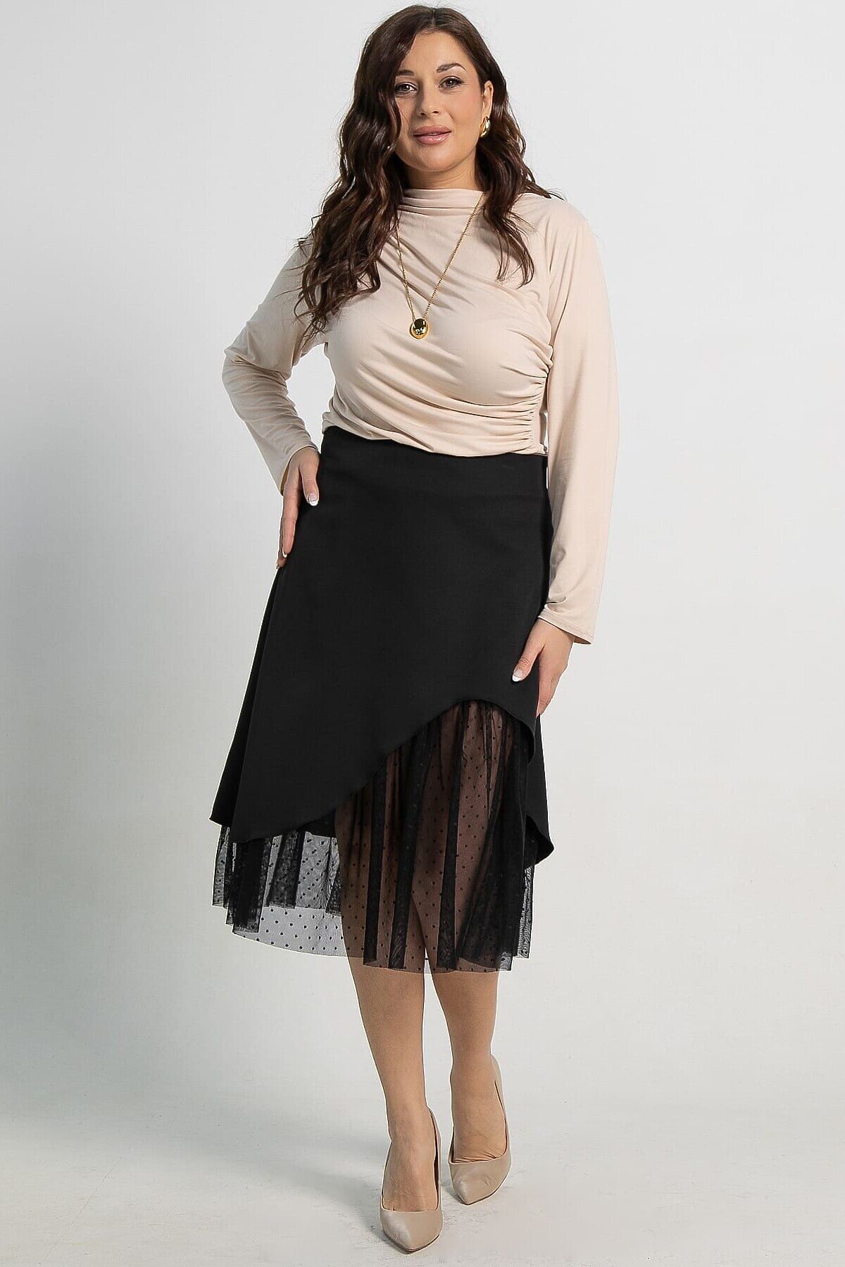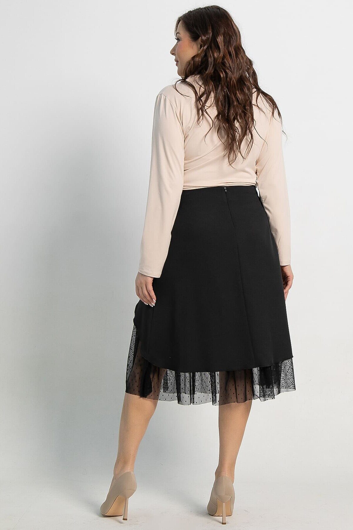 Женская черная юбка, созданная из двух материалов, воплощает элегантный и современный стиль. А-силуэт идеально облегает фигуру, а асимметричный подрез спереди придает ей уникальный вид. Нижний слой и подрез выполнены из сетки, пришитой к подкладке, что добавляет изделию утонченности и легкости. Средний шов на спинке украшен молнией для удобства при носке. Юбка состоит из двух слоев: верхний — из костюмной ткани, нижний — из подкладки с сеткой. Это идеальный выбор для делового гардероба или особых мероприятий.